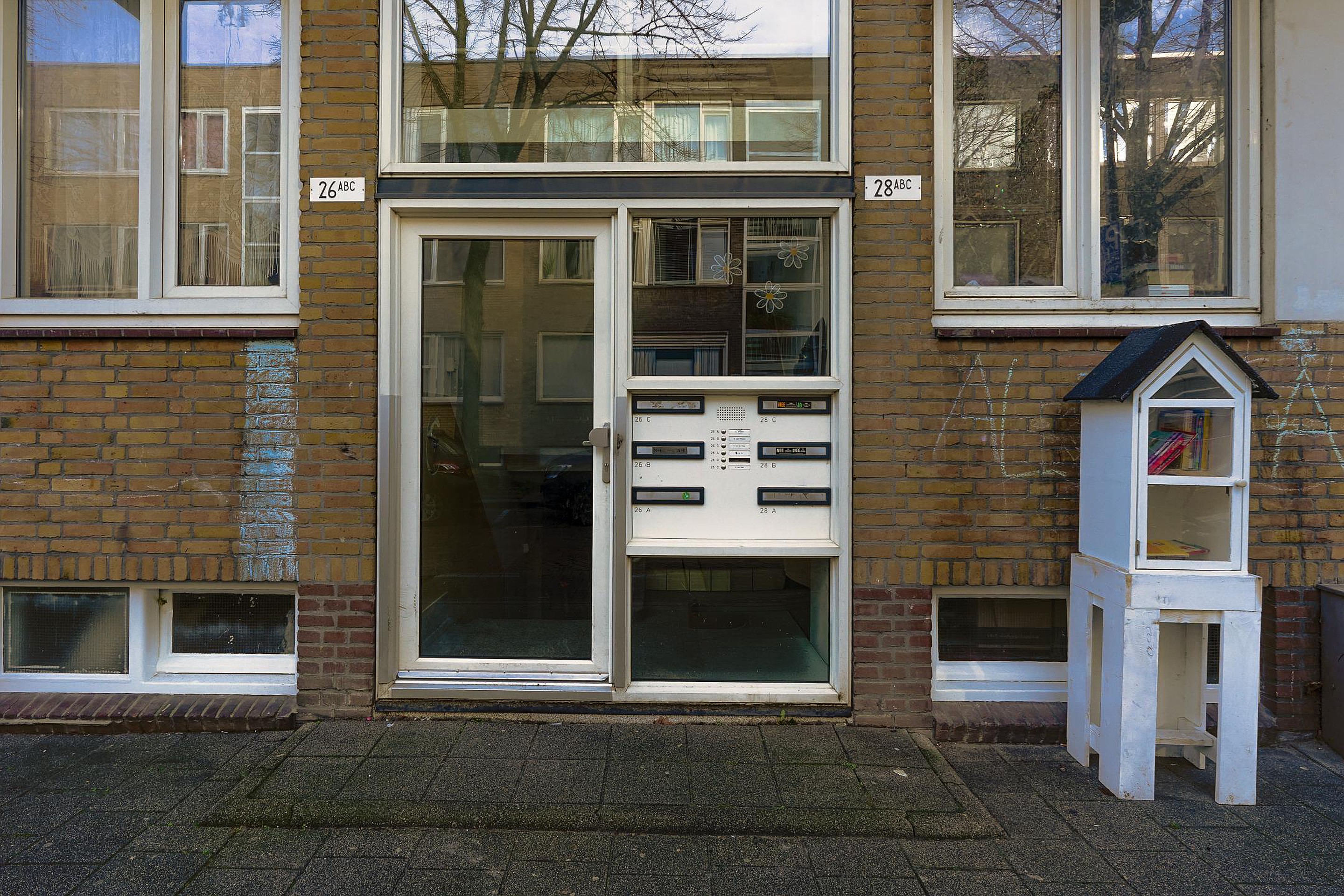 Gesloten entree met brievenbussen en bellentableau, met toegang tot het trappenhuis en bergingen.