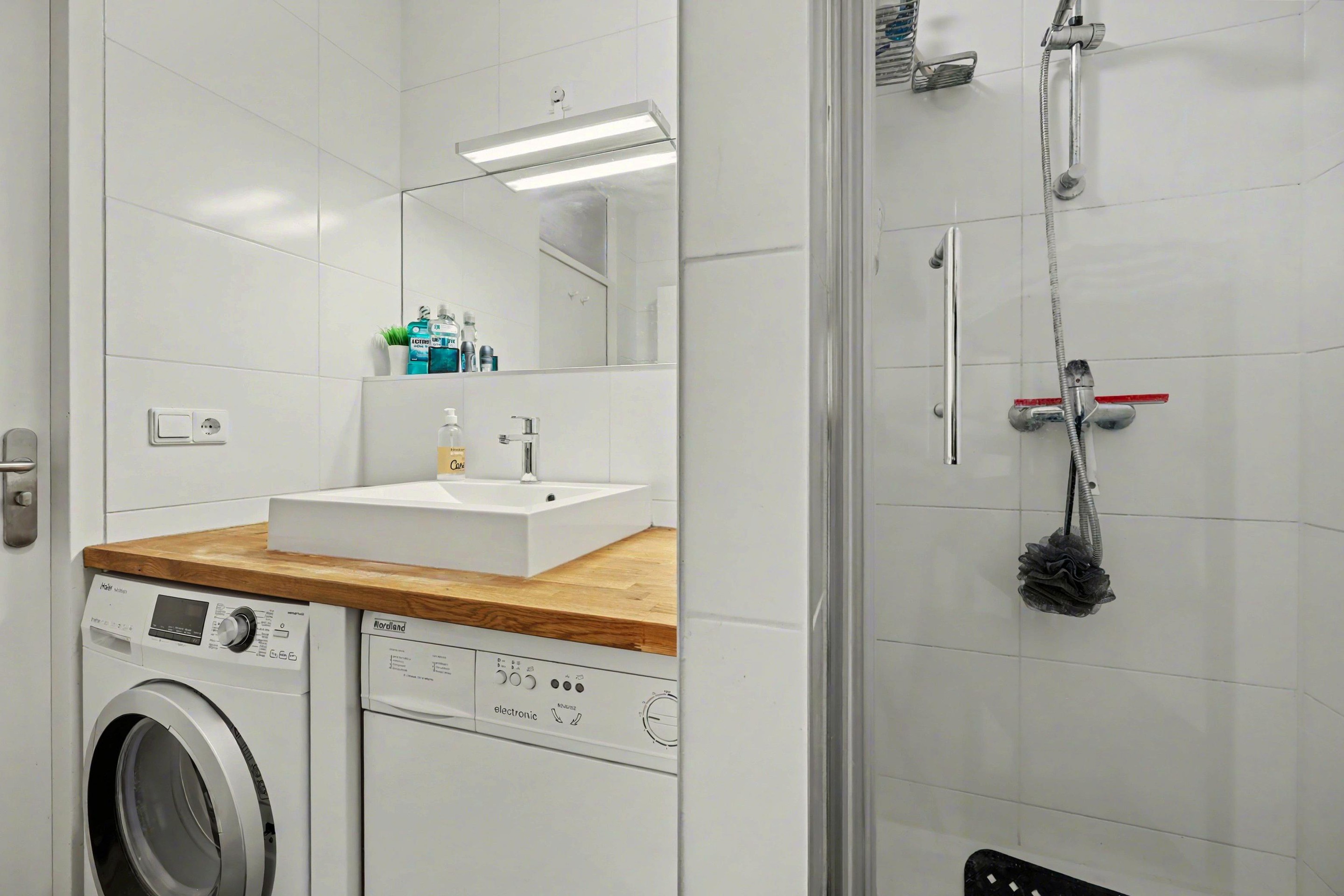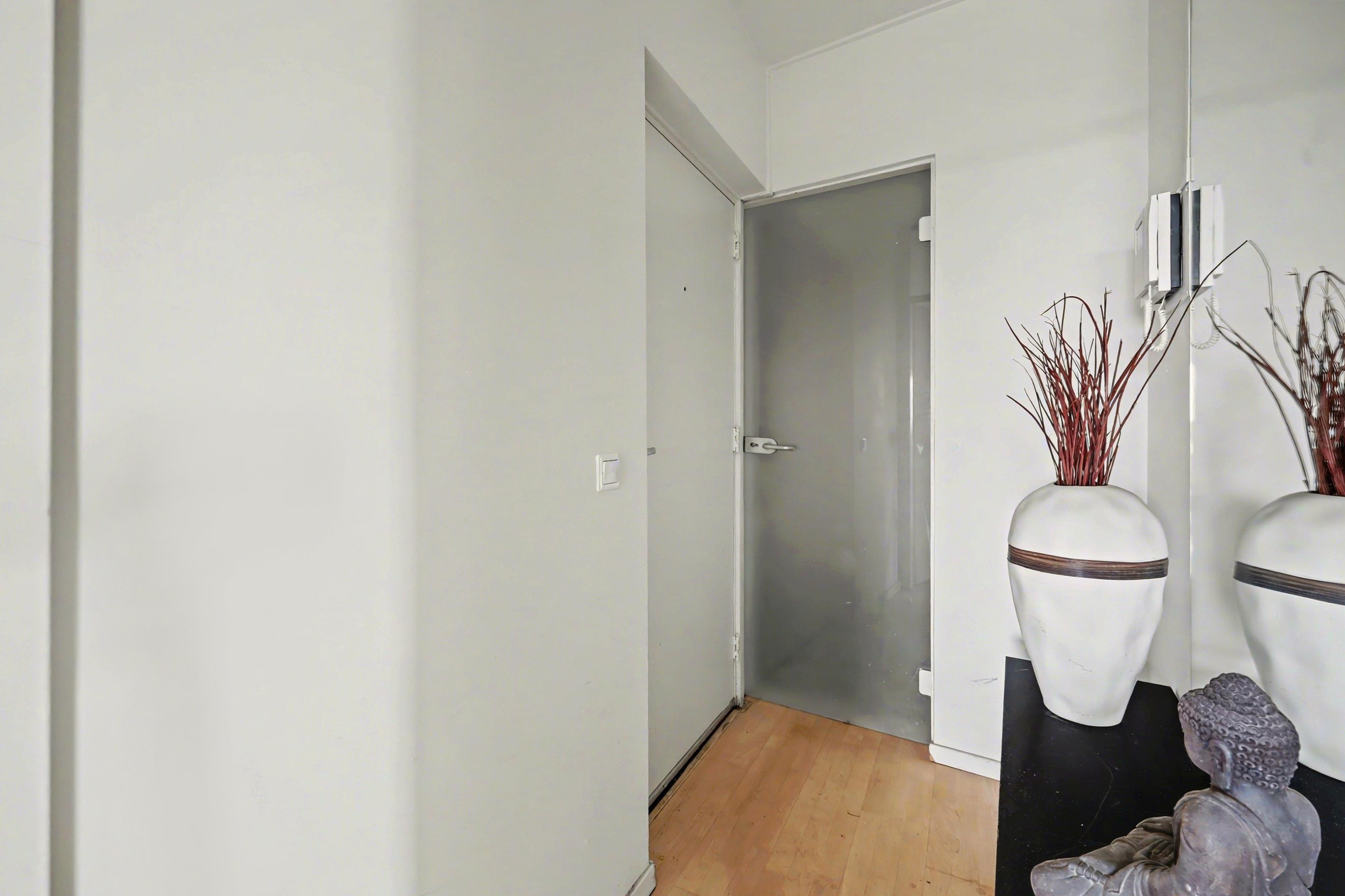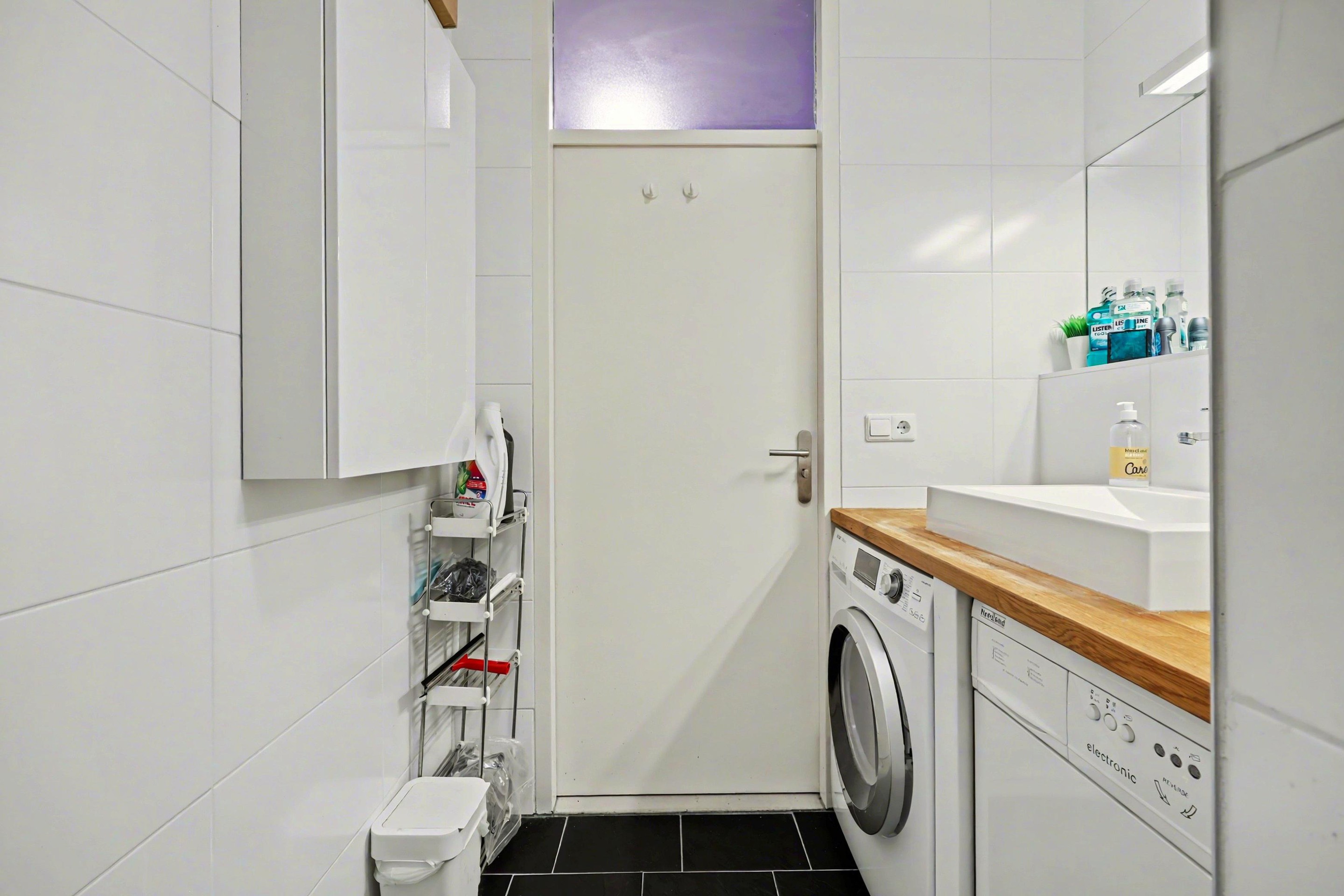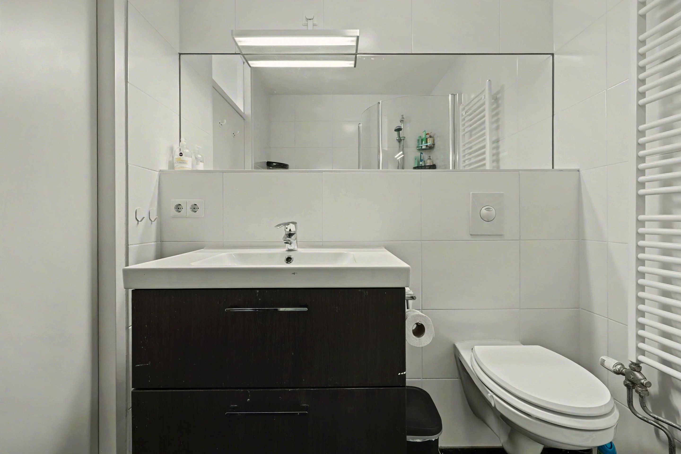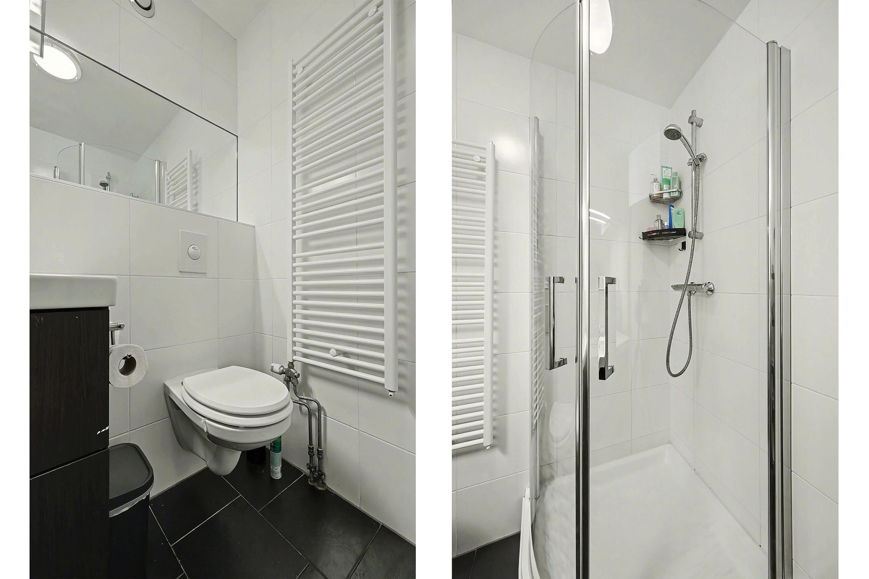 Bij de verkeersruimte na de entree, is een inpandige berging, badkamer met douchecabine, toilet met hangend closet, wastafelmeubel en designradiator en zijn 2 slaapkamers waarbij 1 slaapkamer toegang heeft tot het balkon.