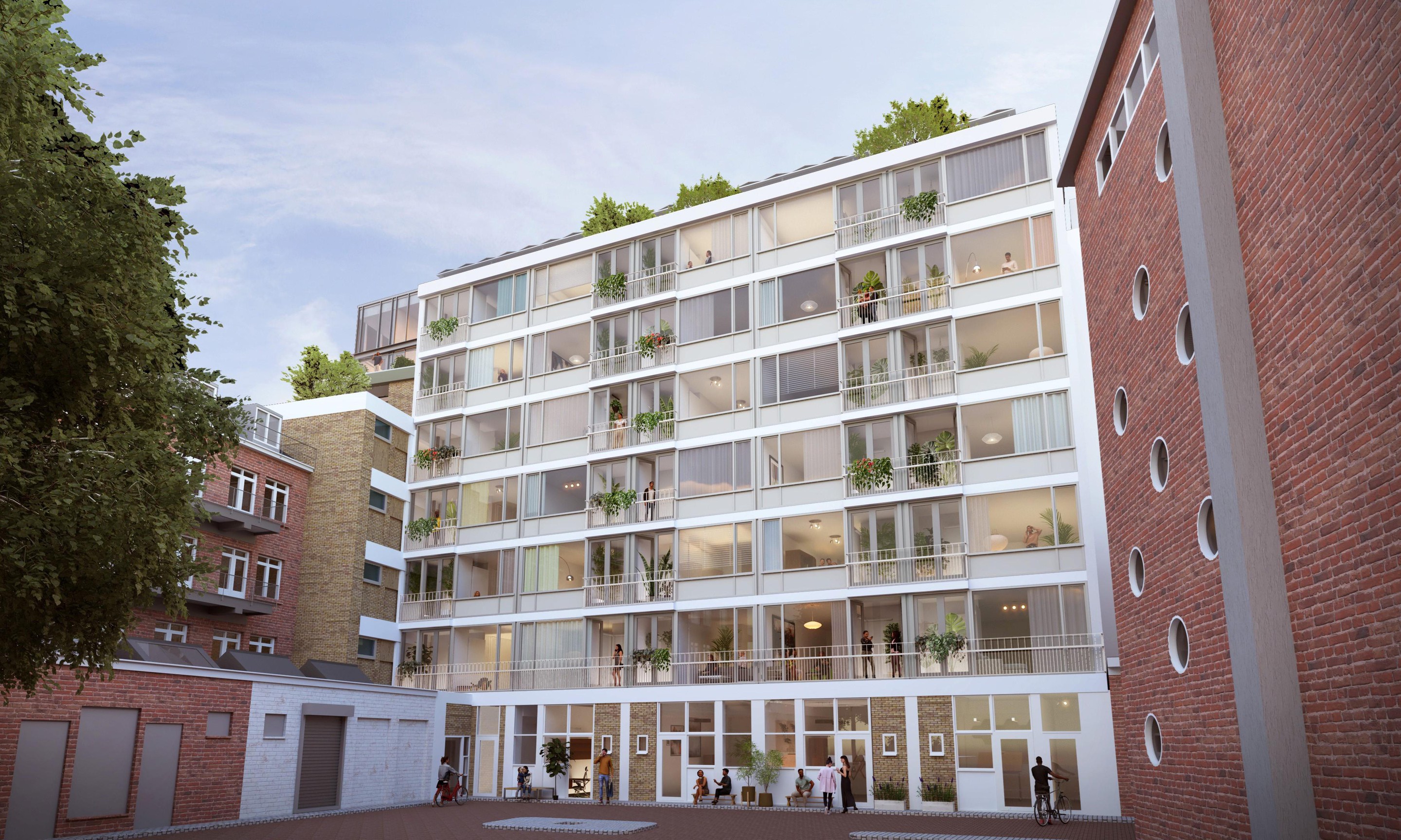 - De plafonds in de appartementen zijn gedeeltelijk glad wit en gedeeltelijk uitgevoerd in ‘exposed concrete’ - het fraaie oude betonnen plafond. Dit geeft de woningen een loftachtige uitstraling doordat de volle hoogte van de verdieping zichtbaar is.