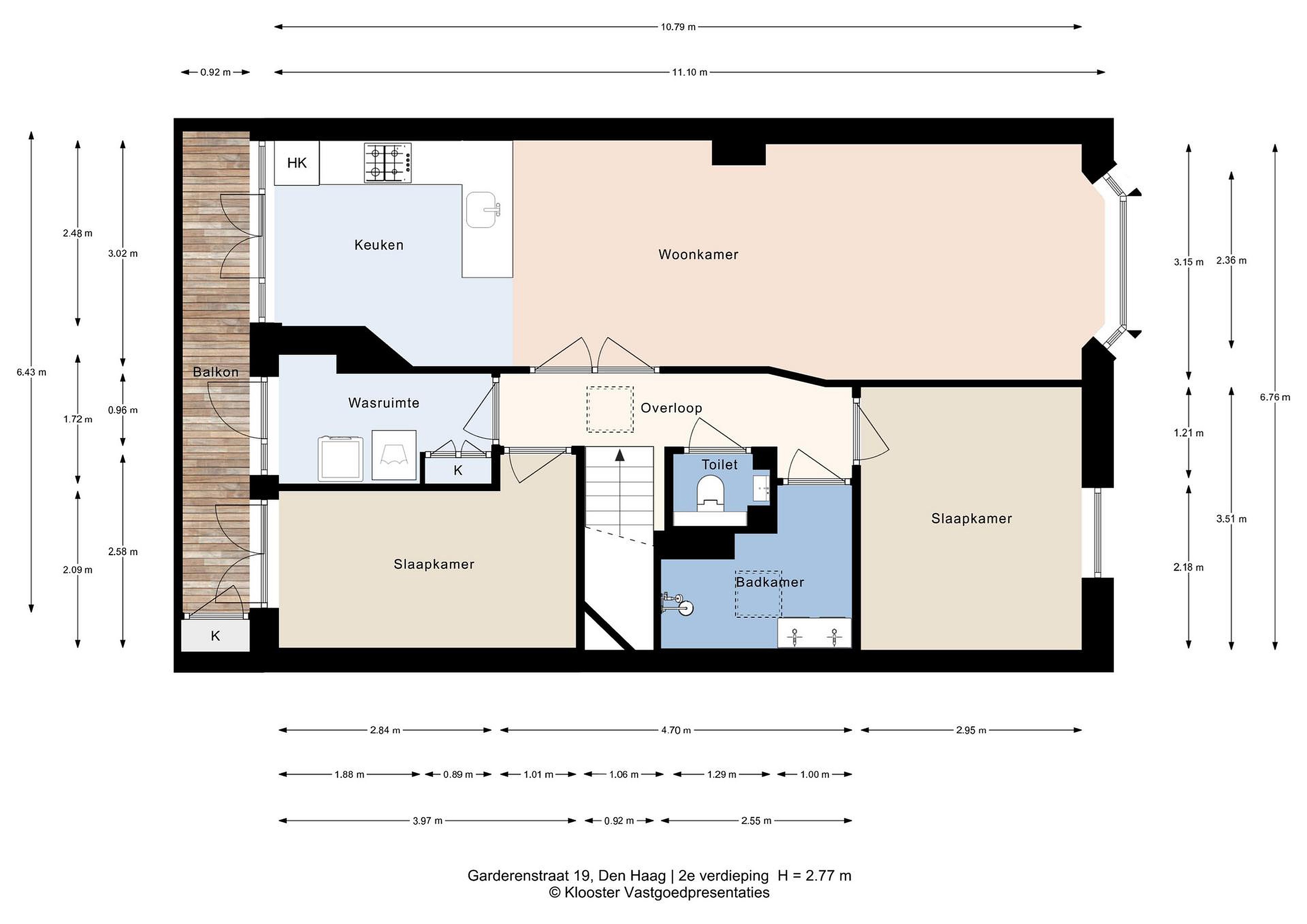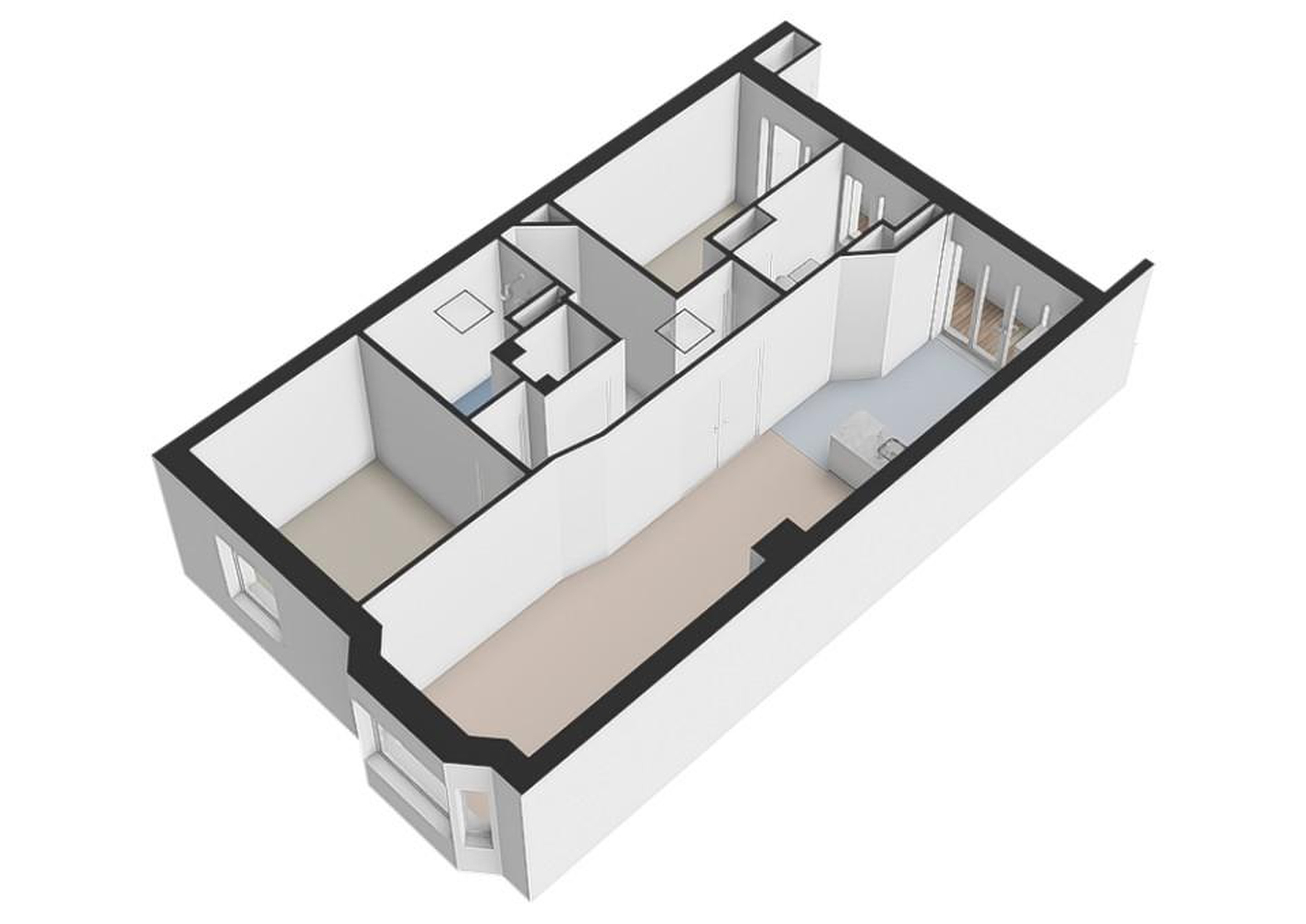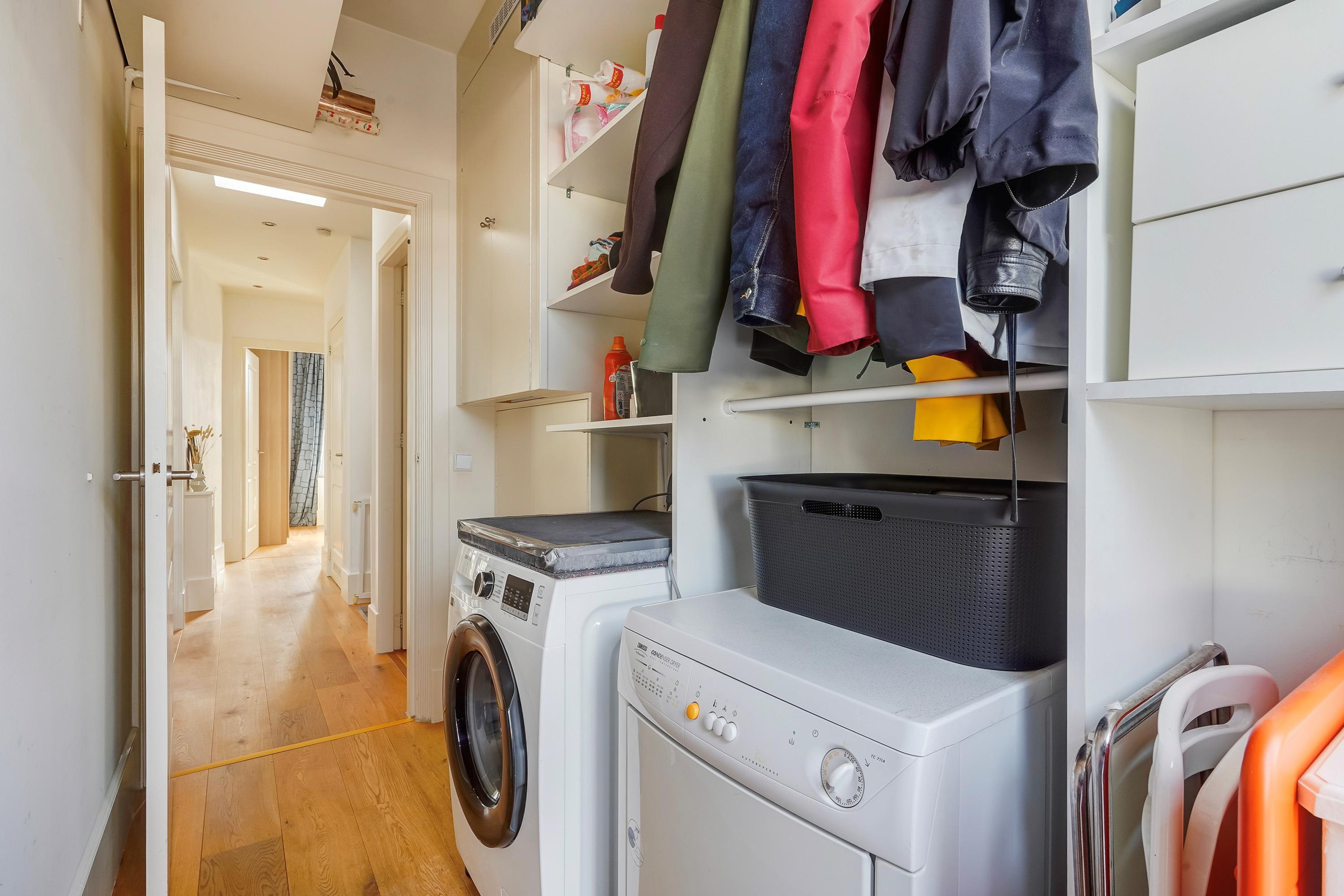 Begane grond Entree woning op de eerste verdieping, hal v.v. meterkast, trapopgang naar de 2e verdieping: woonverdieping. Overloop welke toegang geeft tot alle vertrekken. Ruime woonkamer met open keuken. De keuken is v.v. 4 pits gas kookplaat, afzuigkap, oven, koel-/vriescombi, vaatwasser en toegang tot het balkon. Ruime slaapkamer aan de voorzijde gelegen, badkamer v.v. douche, dubbel wastafelmeubel, lichtkoepel en handdoekradiator. De tweede slaapkamer is aan de achterzijde gelegen en is eveneens ruim opgezet. De voormalig keuken is omgetoverd tot 3e kamer en is thans in gebruik als waskamer alwaar opstelplaats wasmachine-/droger en cv-combi ketel. Aan de achterzijde een balkon over de gehele breedte met vaste kast.