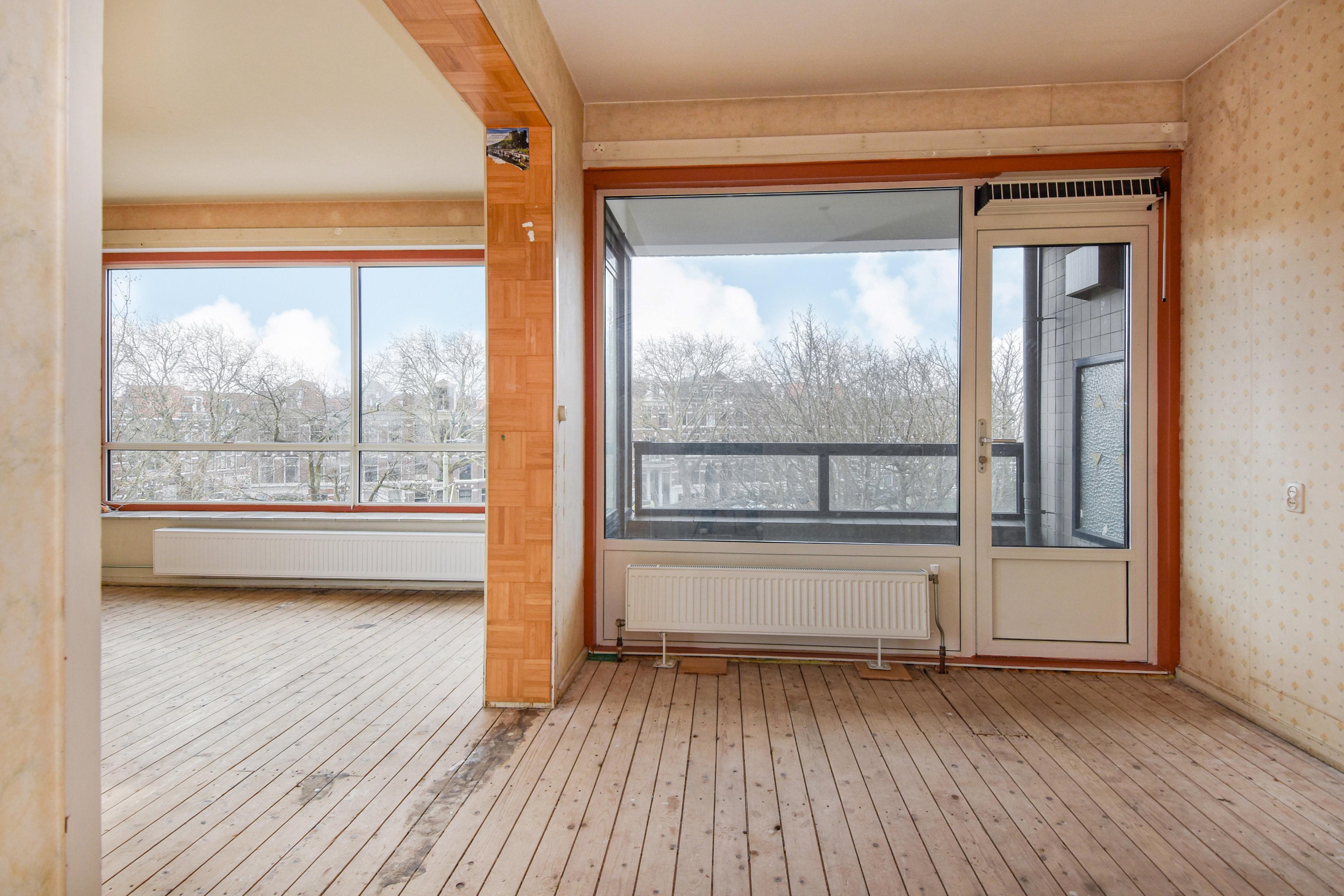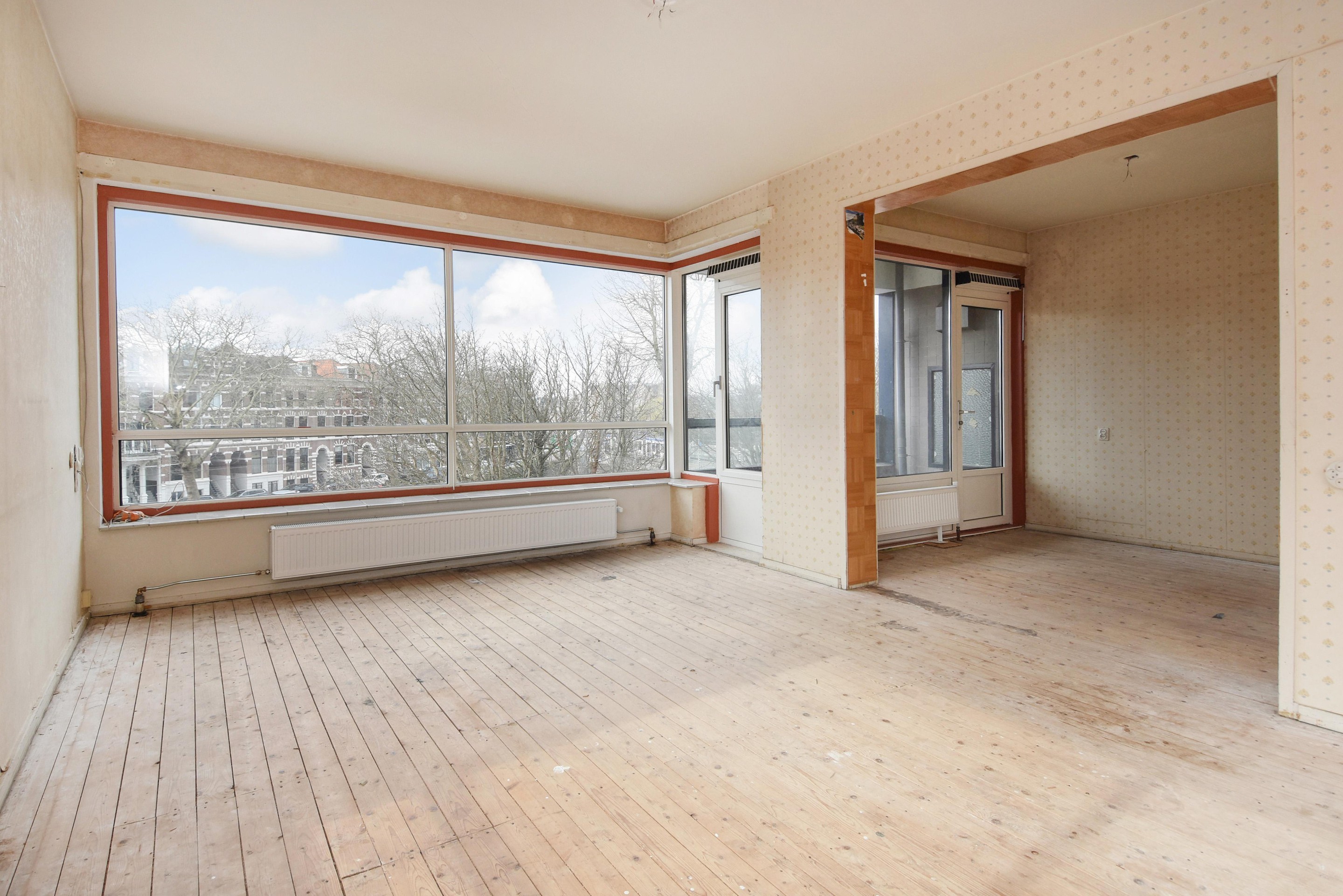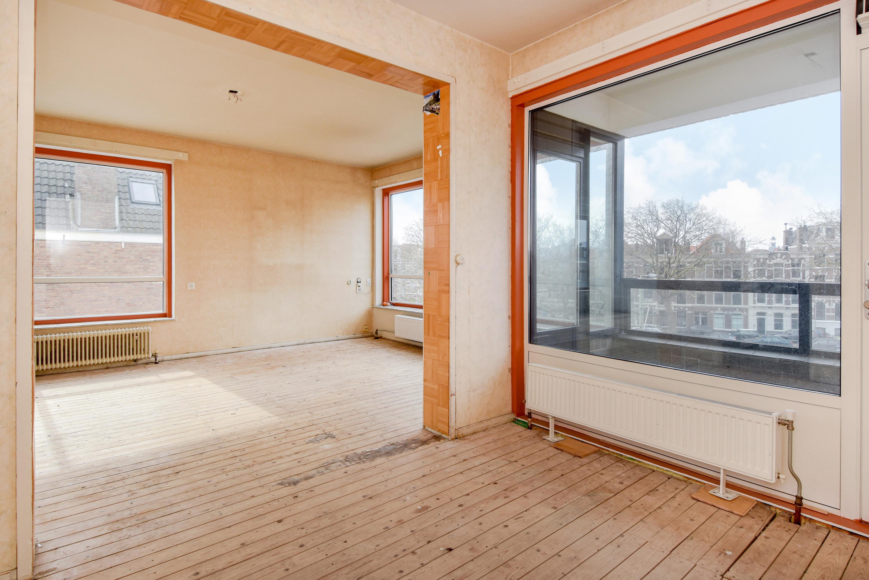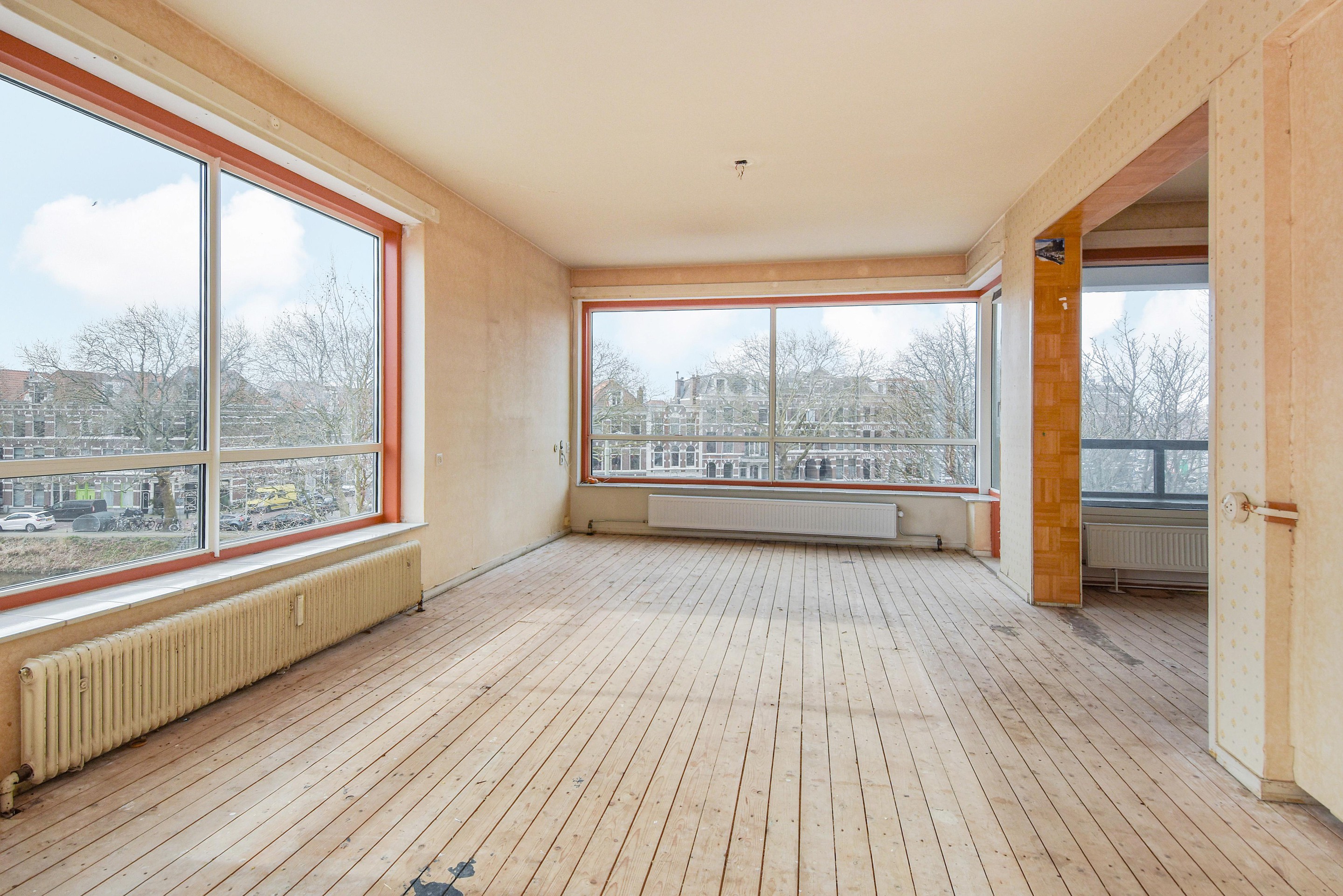 De royale woon-/eetkamer is ontstaan door het samenvoegen van meerdere kamers (voormalig 3 kamers) en biedt daardoor een bijzonder lichte en open leefruimte. Vanuit de woonkamer is er toegang tot het balkon aan de voorzijde met uitzicht over de Conradkade.