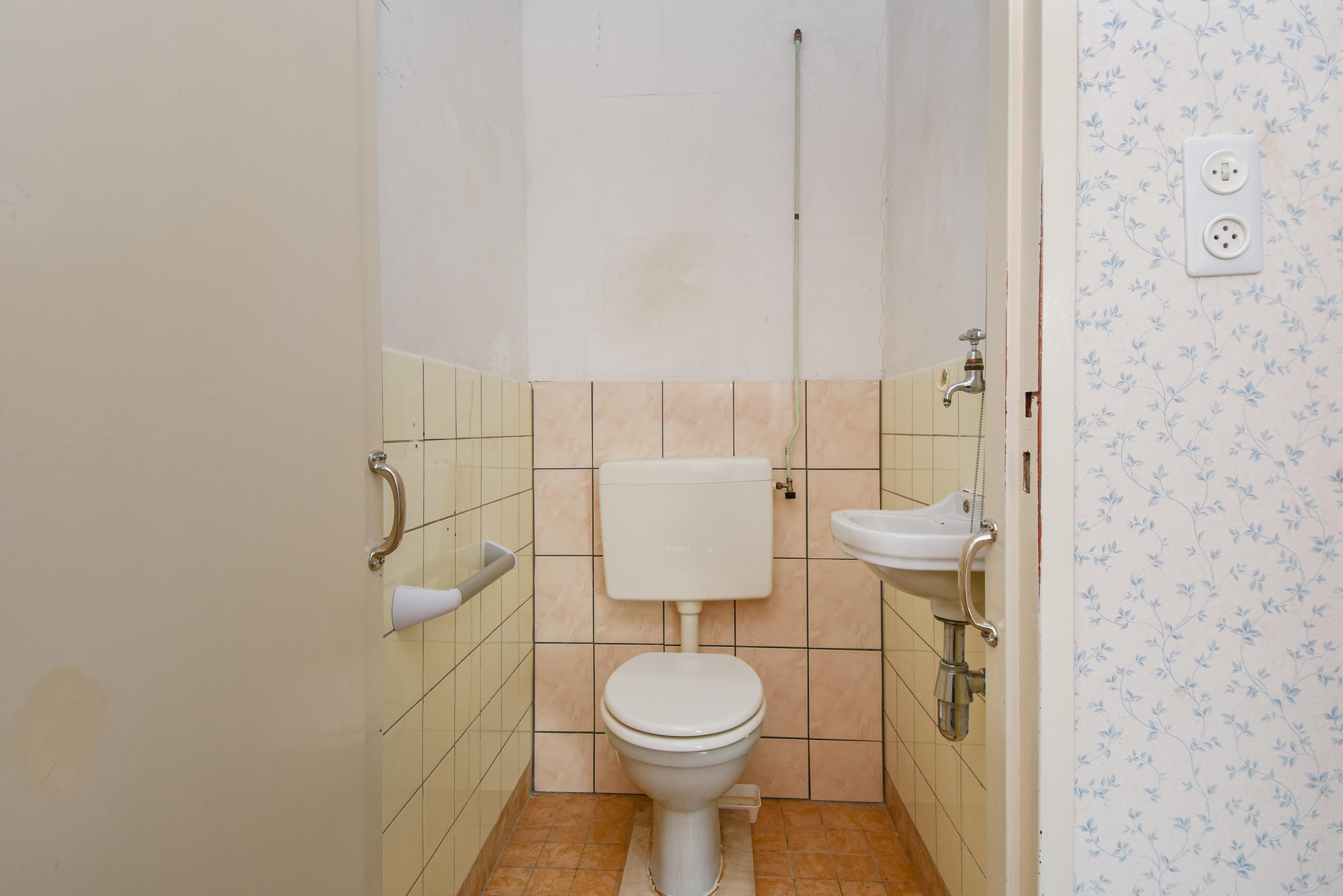 Entree appartement op de eerste verdieping: ruime hal/gang met garderobe, meterkast en separaat toilet met fontein. De badkamer is voorzien van een douche en vaste wastafel.