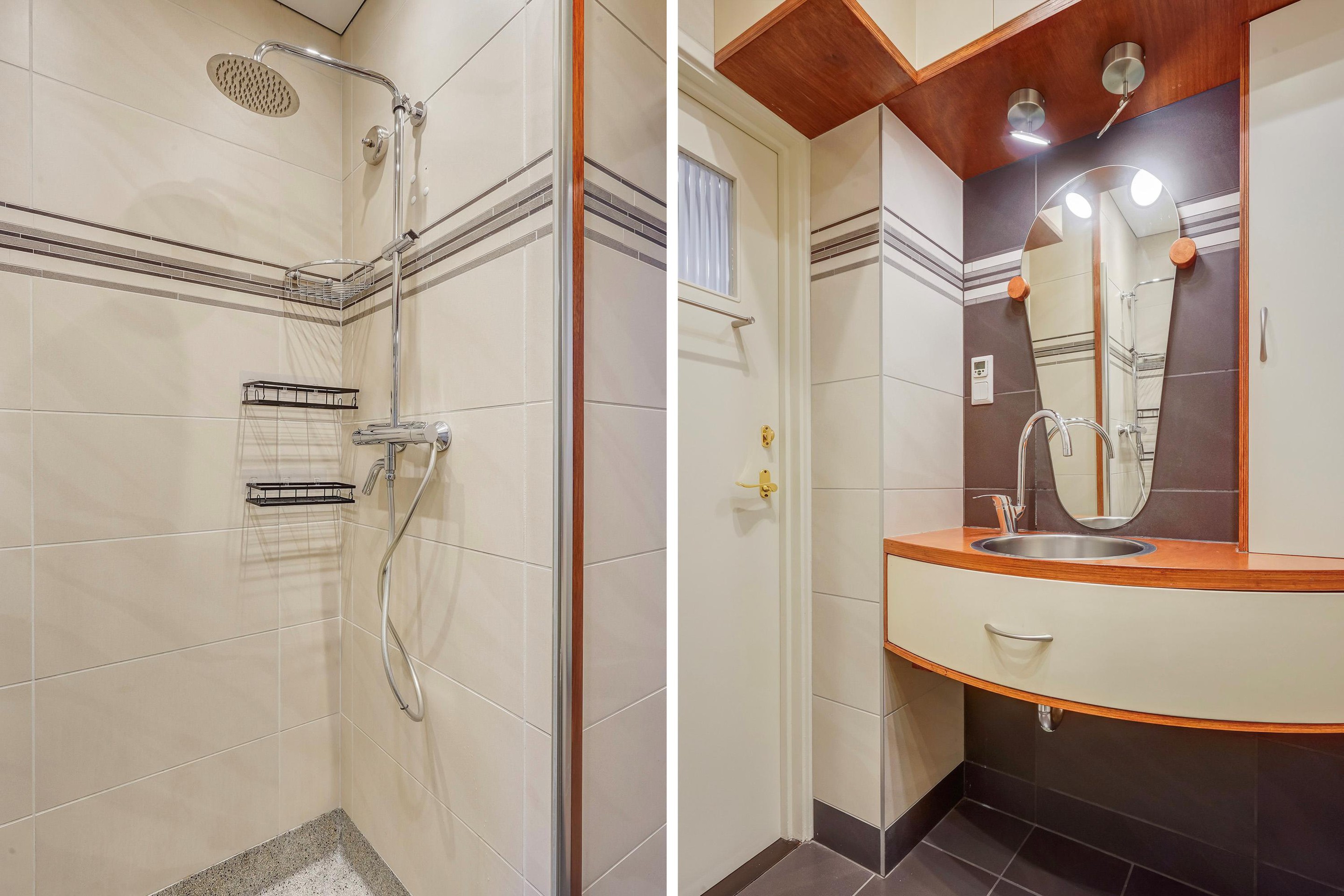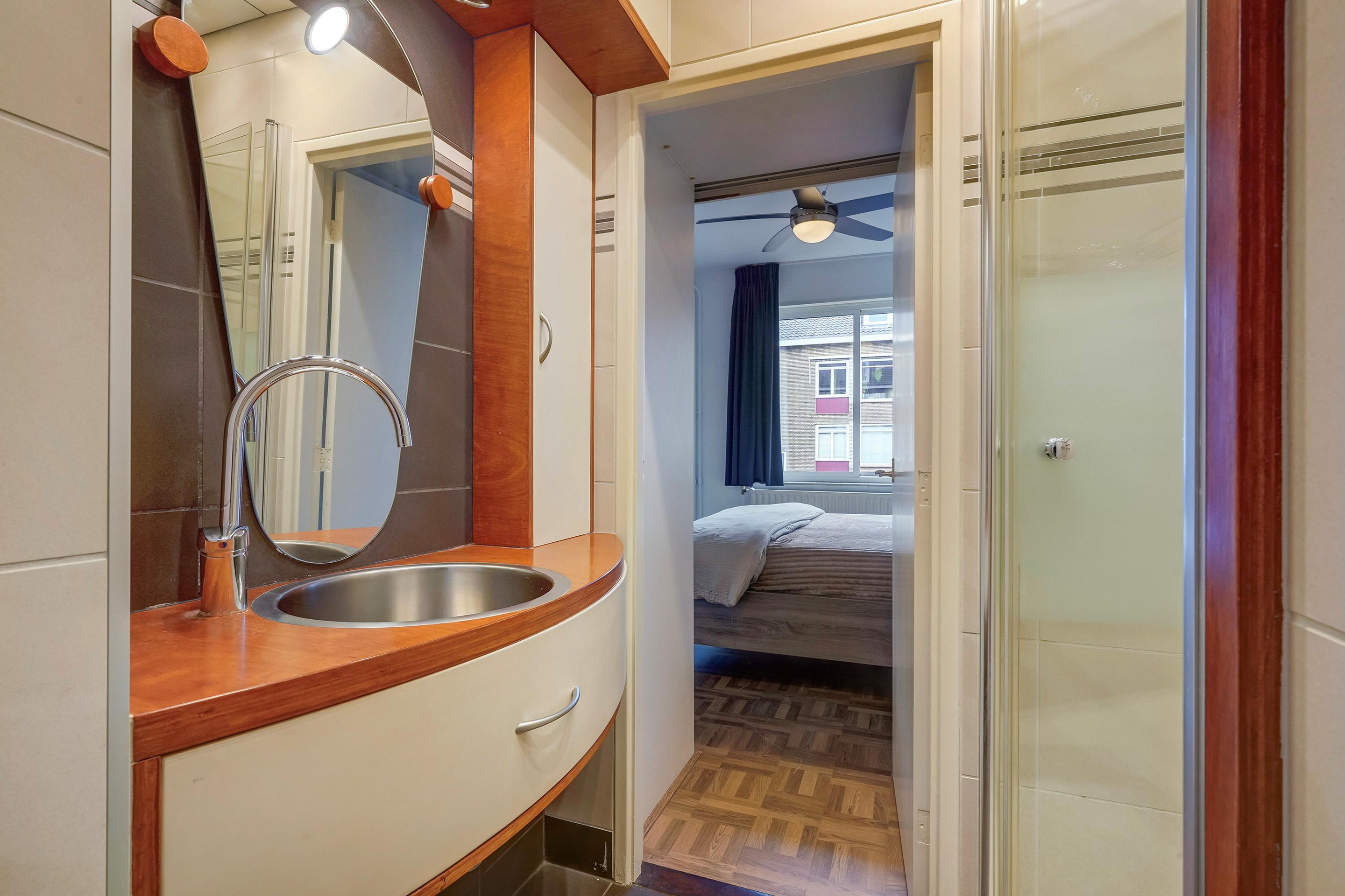 Entree, hal met vaste kasten. Slaapkamer aan de achterzijde met toegang tot het balkon. De badkamer is functioneel en netjes uitgevoerd en voorzien van een inloopdouche met thermostaatkraan, een wastafelmeubel en spiegel. Separaat toilet met zwevend closet en fonteintje.