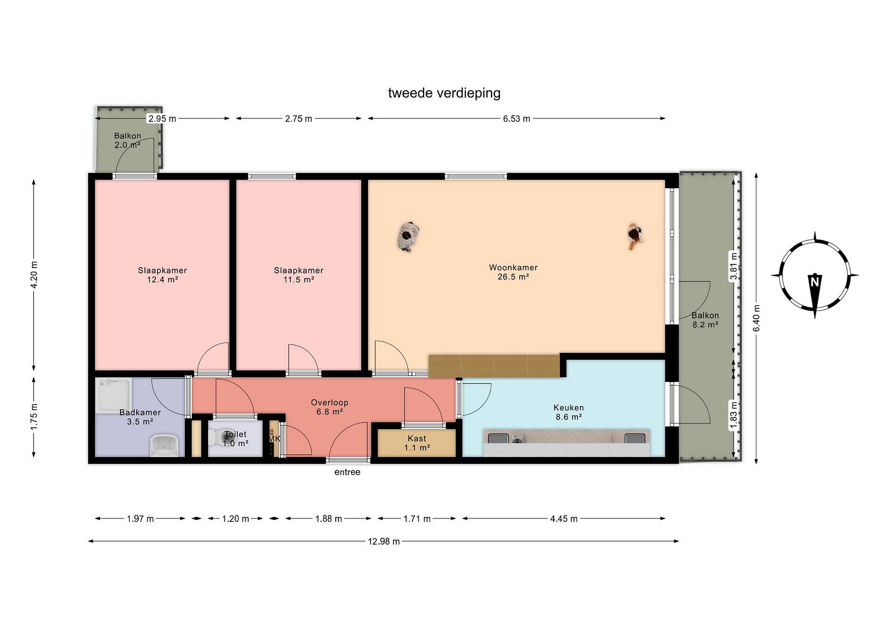 Tweede etage: Gemeenschappelijke hal naar de voordeur. Je gaat naar binnen en komt uit op de centrale overloop, die toegang biedt tot de ruime woonkamer van 26,5 m2, twee ruime slaapkamers van respectievelijk 12,4 m2 en 11,5 m2, de keuken van 8,6 m2, de badkamer van 3,5 m2 ,de toiletruimte en een ruime voorraadkast. Vanuit de woonkamer en keuken kan je op het balkon over de volle breedte van het appartement van 8 m2 op het westen, waardoor je er heerlijk kan genieten van de middag -en avondzon. Daarnaast biedt één van twee slaapkamers toegang tot het tweede balkon van 2 m2. De keuken is voorzien van een aanrecht voor rolstoelgebruikers. Ook de badkamer beschikt over hulpmiddelen voor mensen die moeilijk ter been zijn.