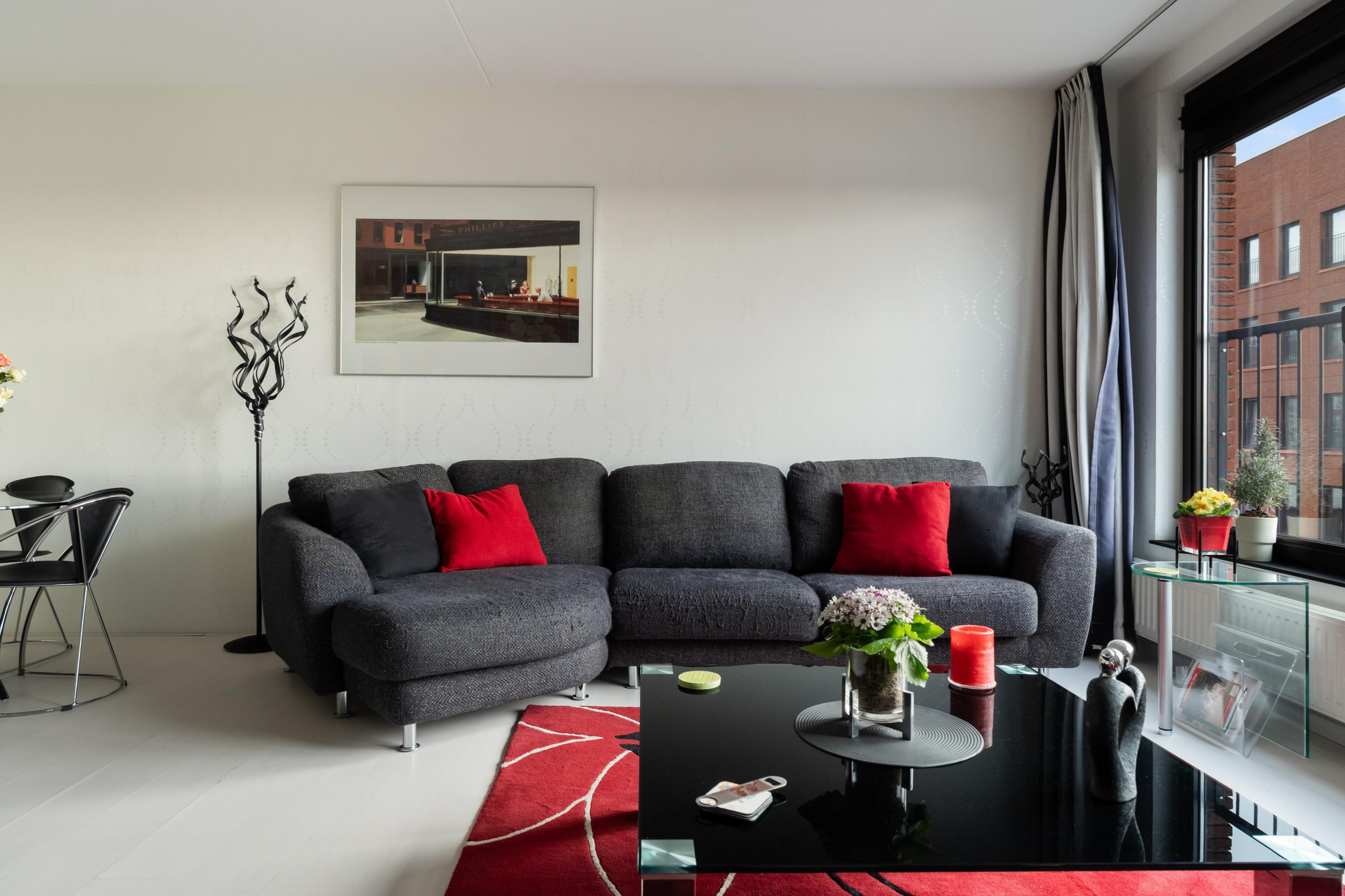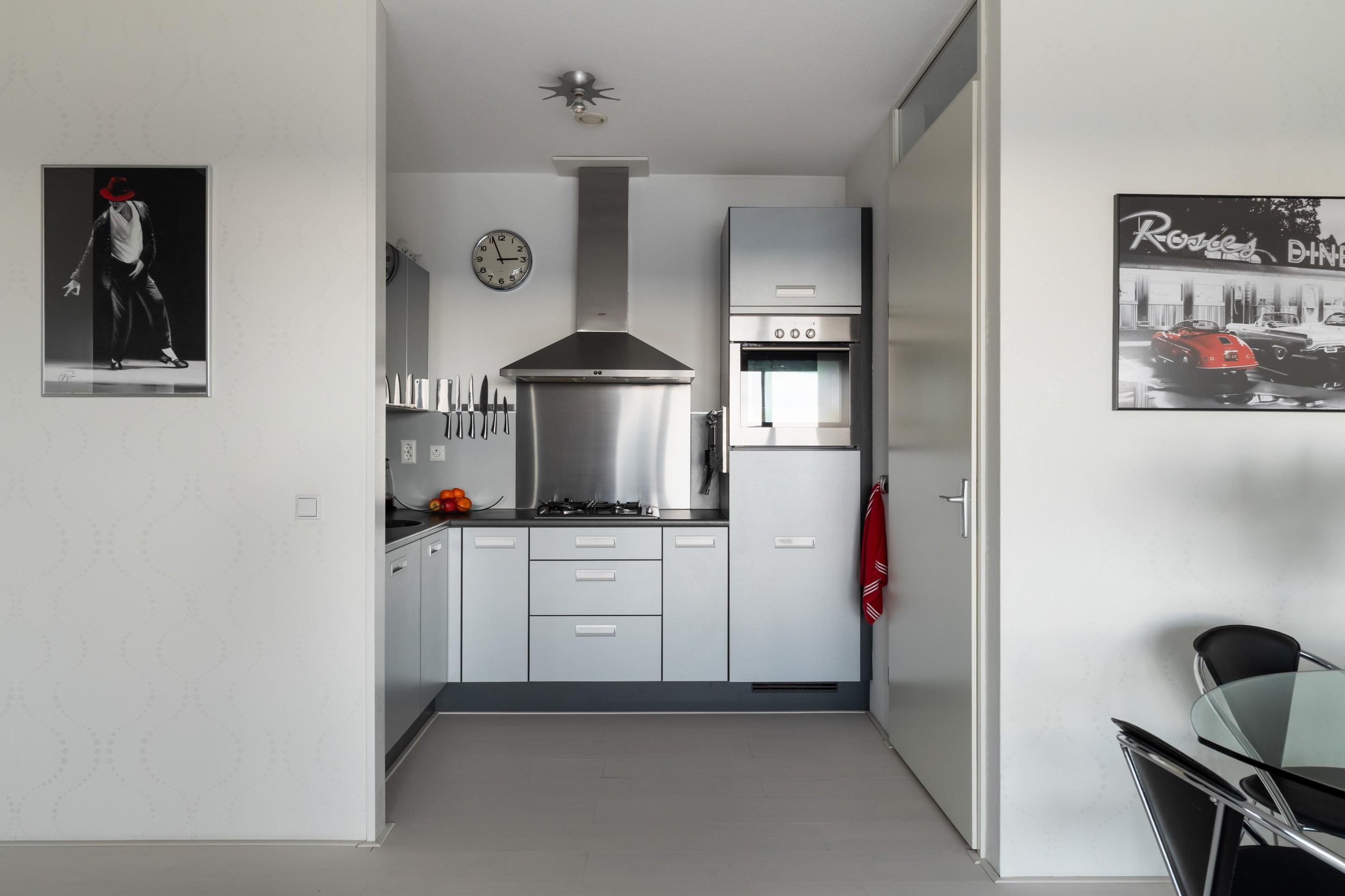 Via de representatieve centrale entree en de lift bereik je moeiteloos de vijfde verdieping. Bij binnenkomst valt direct de prettige lichtinval in de woonkamer op. Grote raampartijen zorgen voor een open en ruimtelijk gevoel en bieden een mooi uitzicht over de omgeving en de groene binnentuin die voor bewoners toegankelijk is. De woonkamer is sfeervol afgewerkt met een nette laminaatvloer en verzorgde wandafwerking, waardoor je hier zo kunt intrekken.