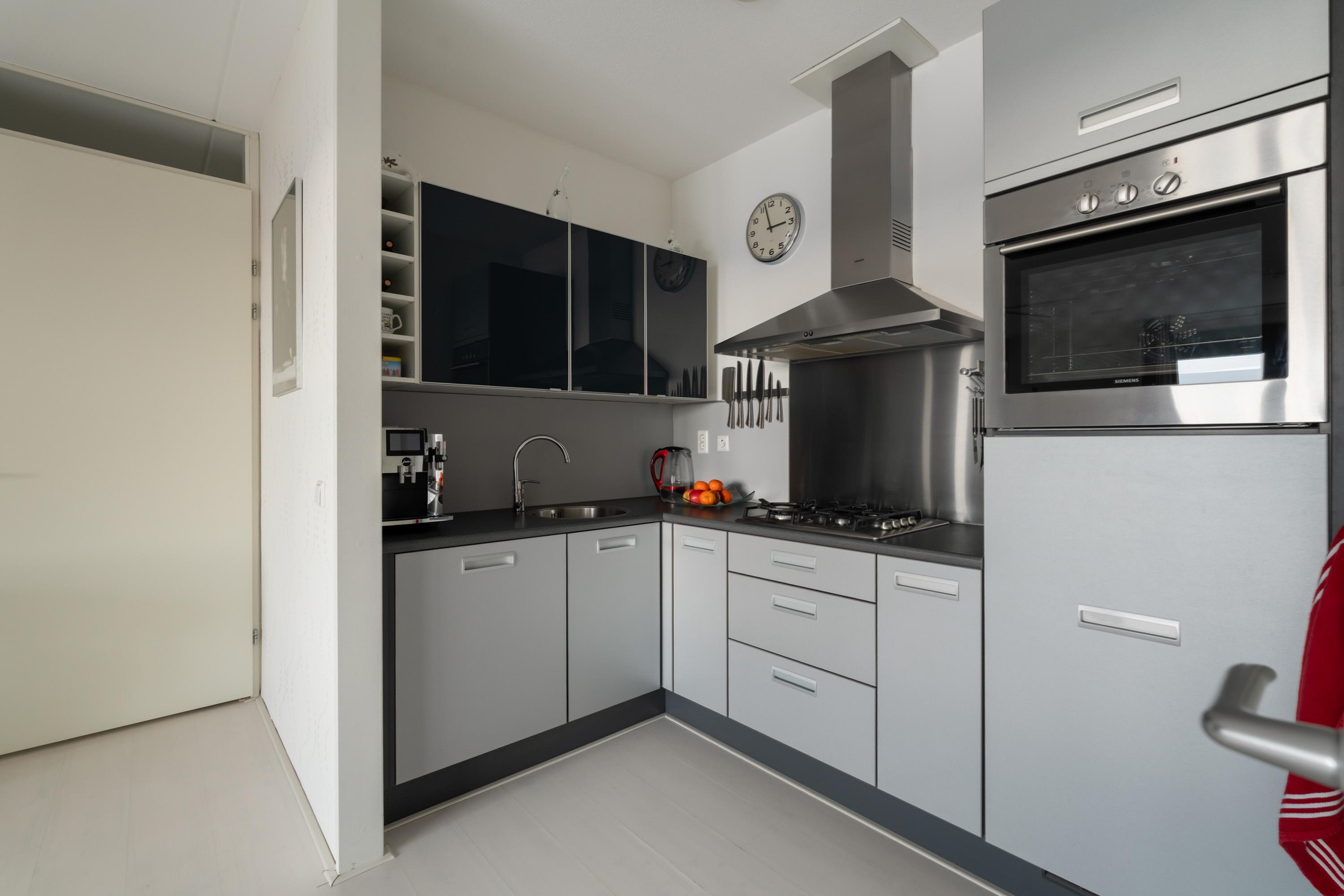 De open keuken met stijlvol composiet werkblad is compact maar efficiënt ingericht. Je beschikt hier over alle benodigde inbouwapparatuur, waaronder een 4-pits gaskookplaat, afzuigkap, koelkast en een spoelbak. Alles is logisch geplaatst zodat koken hier prettig en overzichtelijk blijft. Direct naast de keuken bevindt zich bovendien een ruime inloopkast, ideaal als extra bergruimte voor voorraad en huishoudelijke spullen.
