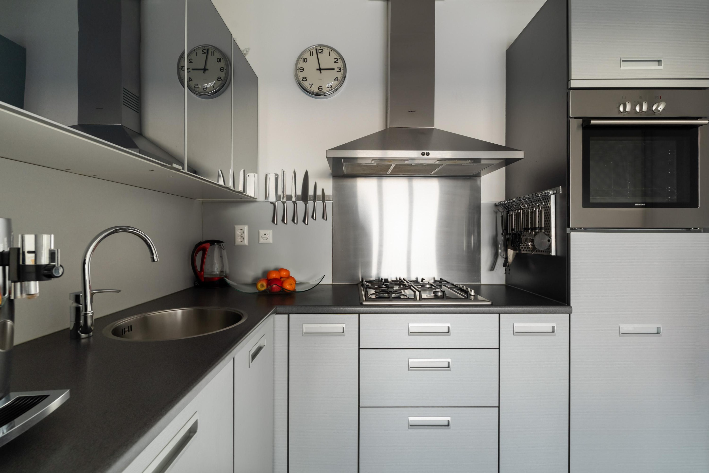 The open kitchen with a stylish composite worktop is compact yet efficiently designed. It is equipped with all necessary built-in appliances, including a 4-burner gas hob, extractor hood, refrigerator and sink. Everything is logically arranged to keep cooking comfortable and practical. Adjacent to the kitchen you will also find a spacious walk-in storage closet, ideal for groceries and household items.