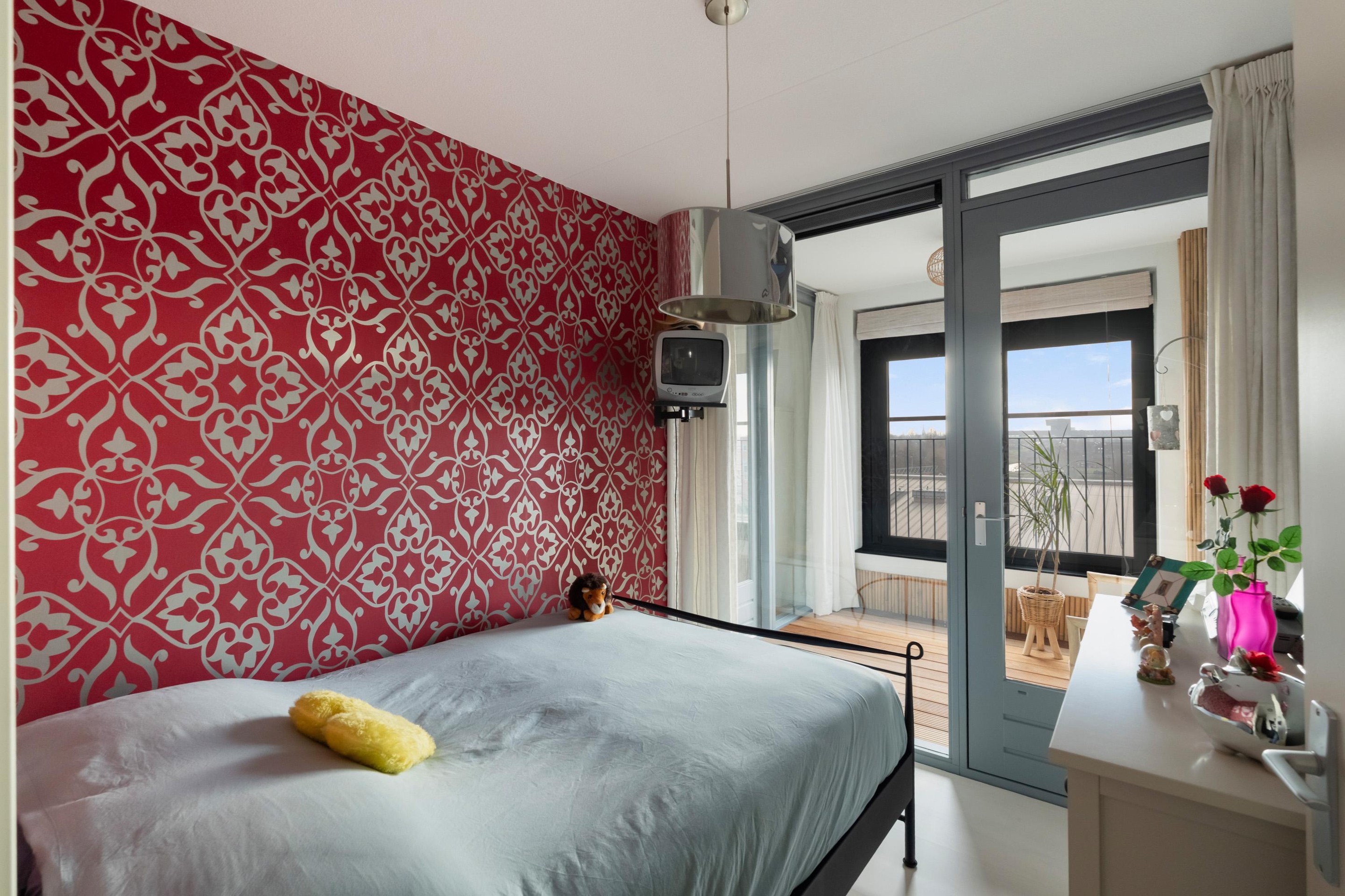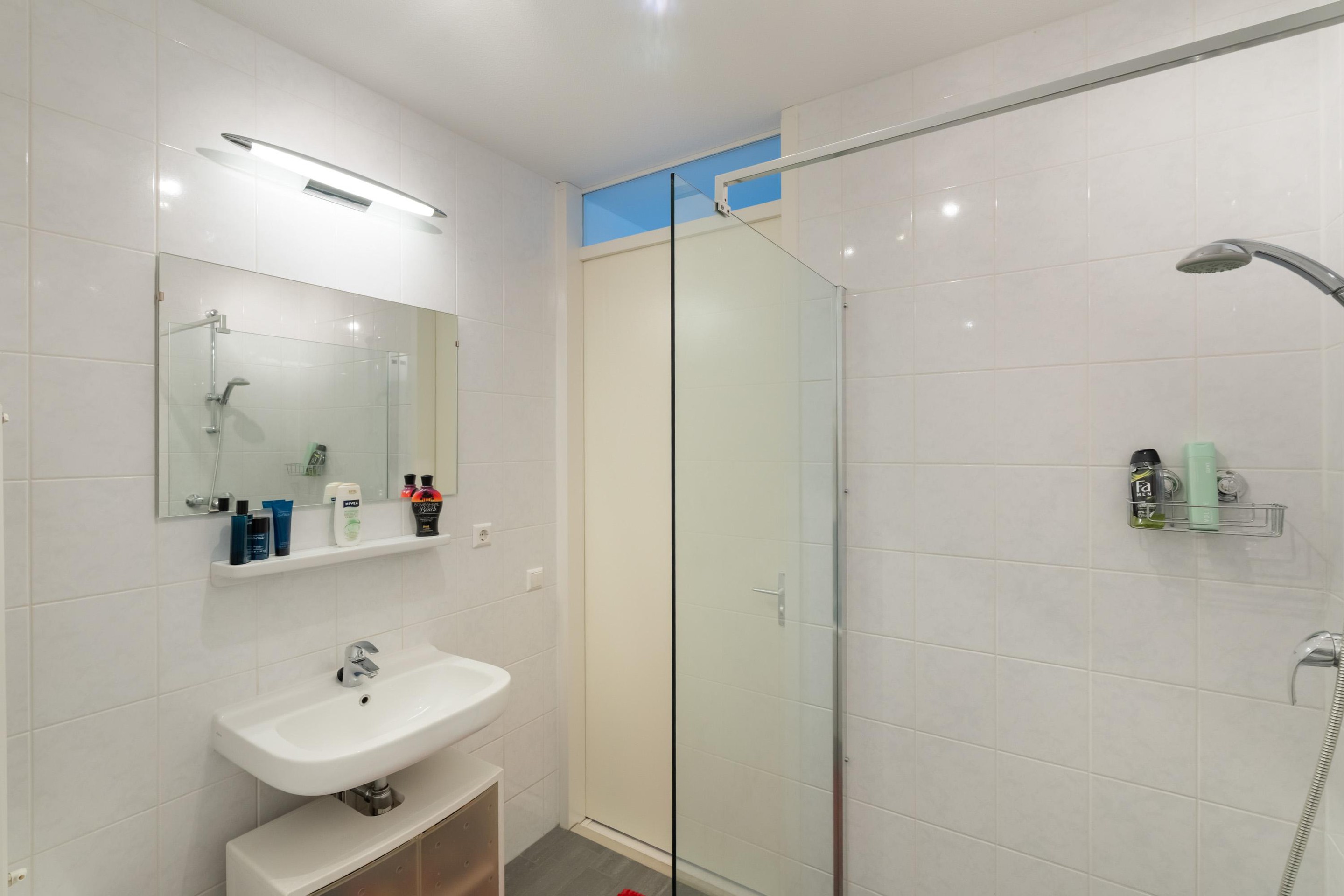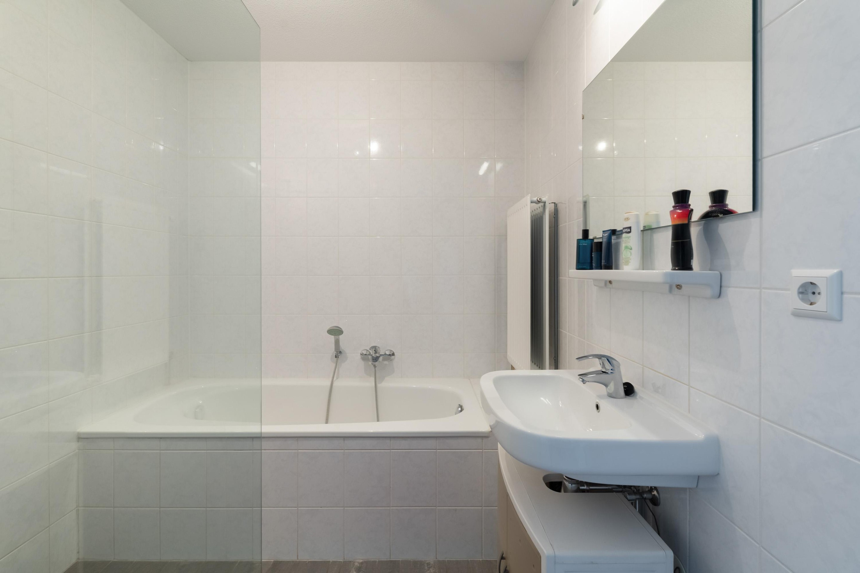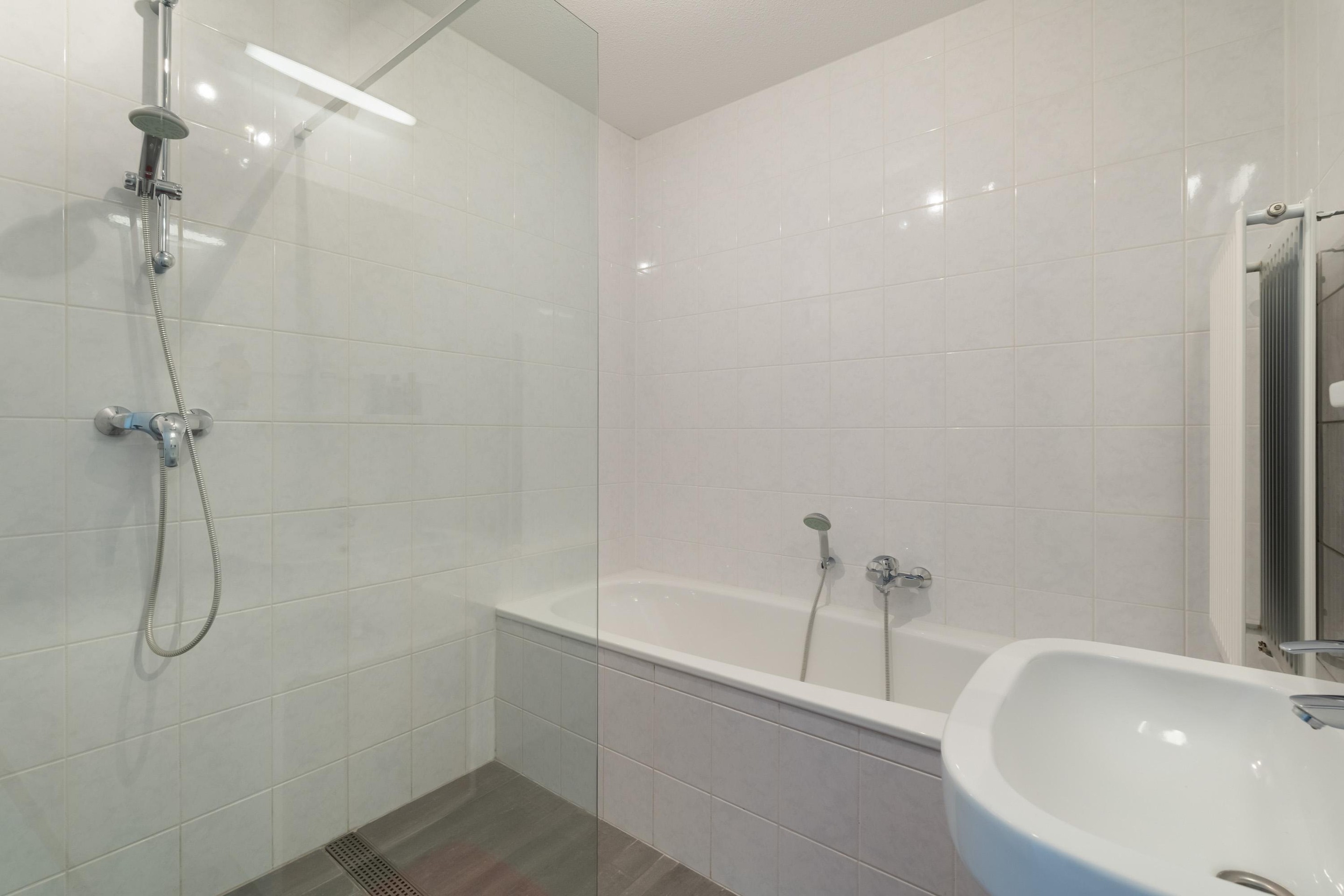 De hoofdslaapkamer en de tweede slaapkamer zijn beide van goed formaat en voorzien van grote ramen met vrij uitzicht, wat zorgt voor veel daglicht en een prettige sfeer. De volledig betegelde badkamer is compleet uitgevoerd met een ligbad, een inloopdouche en een wastafel — alles wat je nodig hebt voor een frisse start van de dag of een ontspannen moment in de avond.