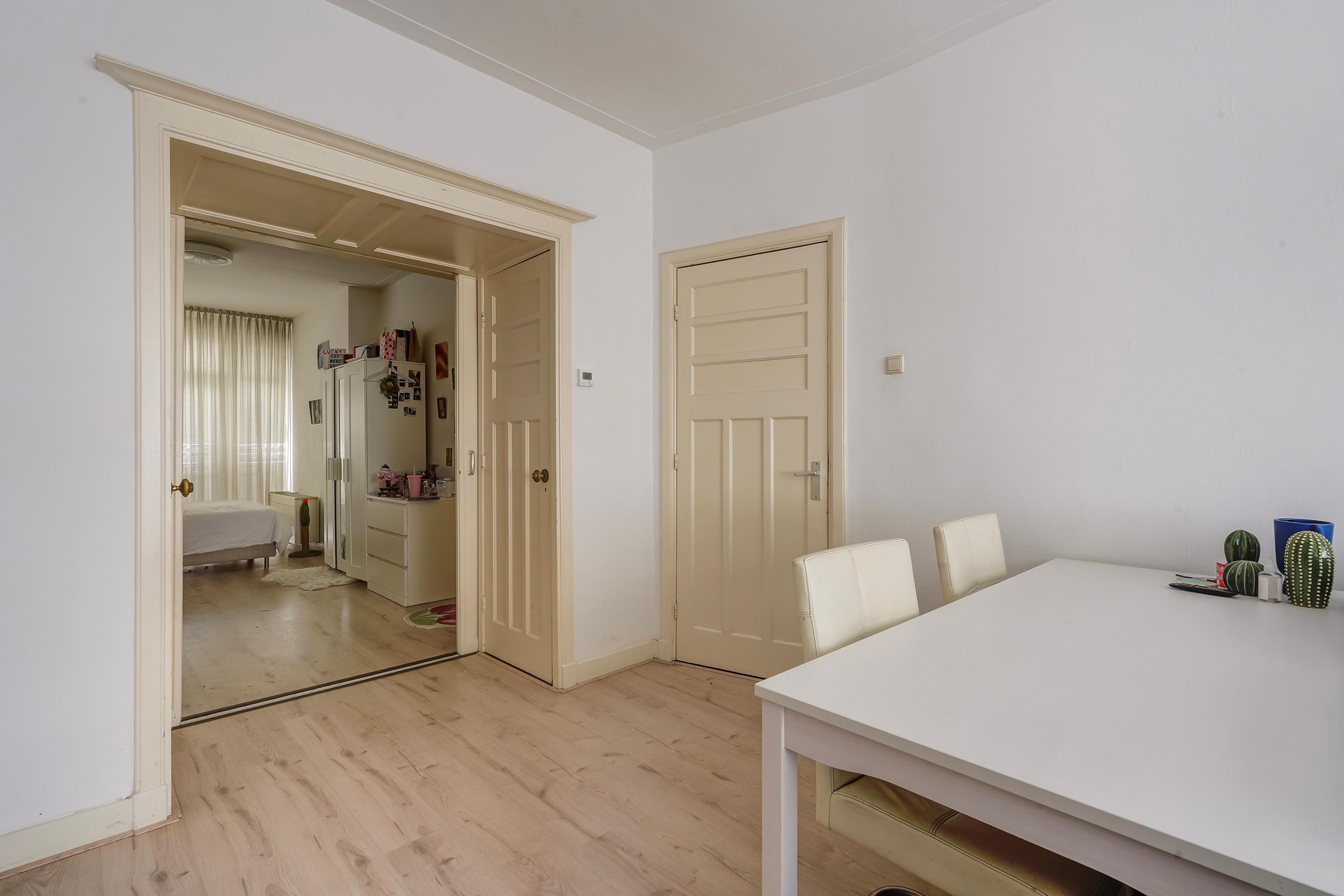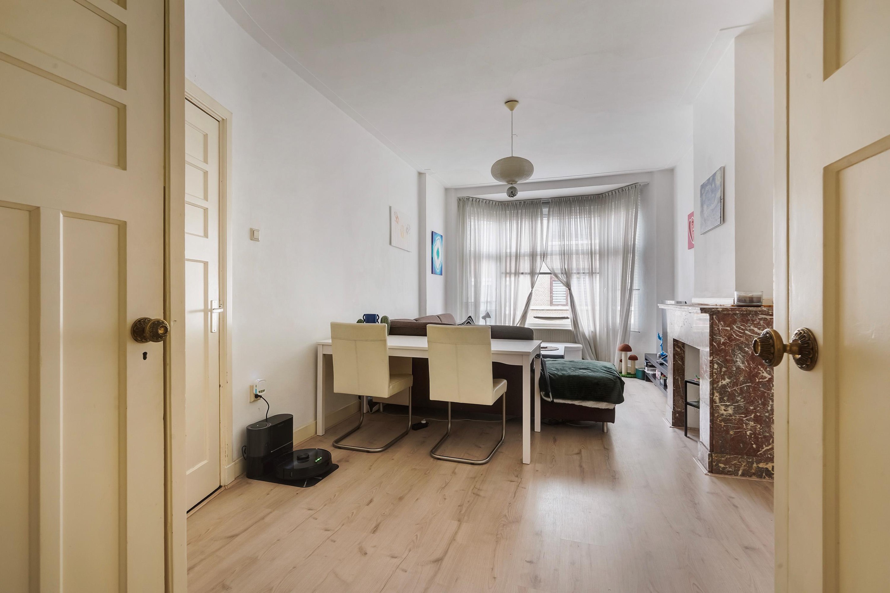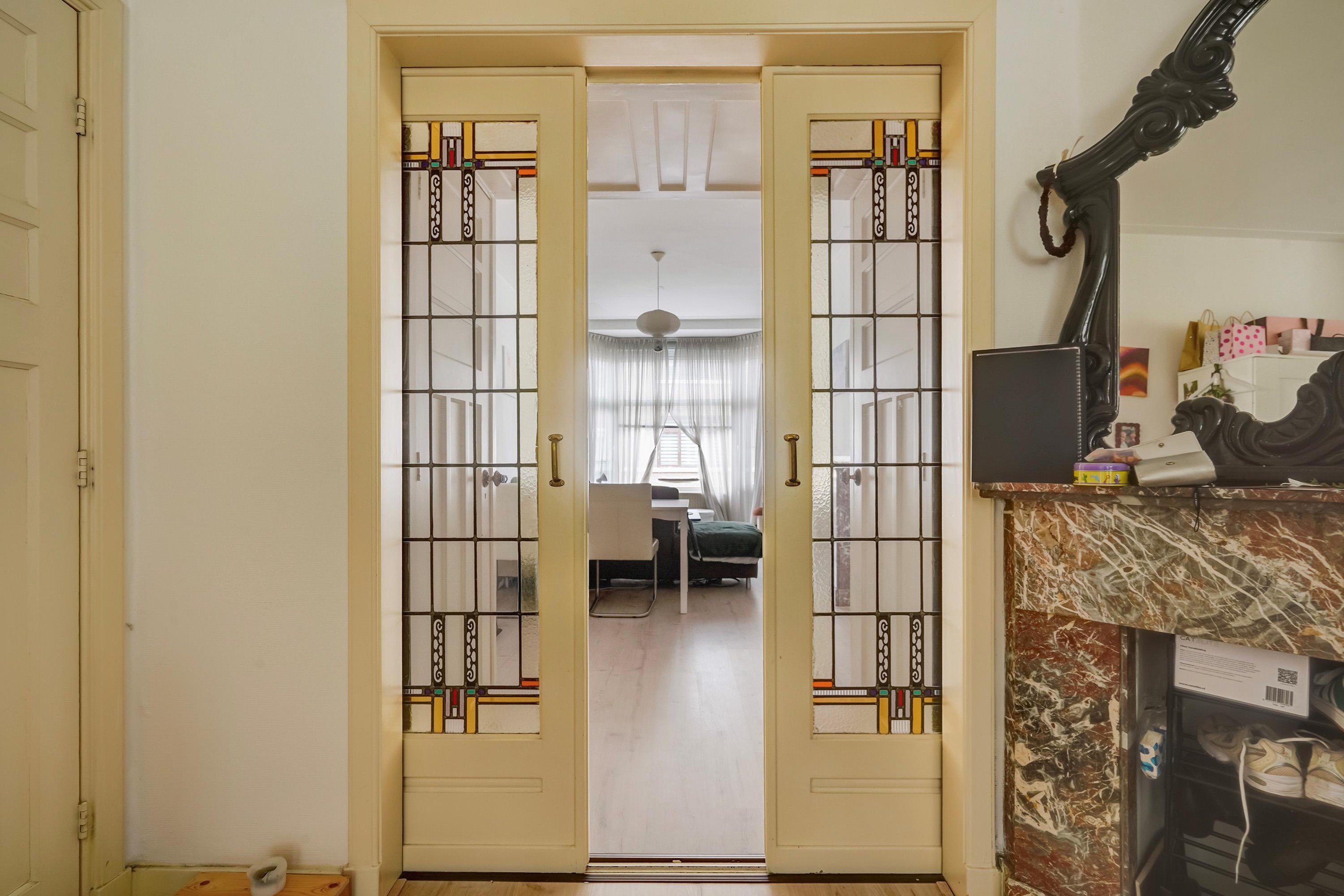 De lichte woonkamer bevindt zich aan de voorzijde van de woning en profiteert van grote raampartijen die zorgen voor een prettige lichtinval. Aan de achterzijde bevindt zich een ruime slaapkamer met directe toegang tot het balkon. Deze kamer kan desgewenst ook uitstekend dienen als woon-/eetkamer, waardoor een royale leefruimte ontstaat. De tussengelegen schuifseparatie is uitgerust met het originele glas-in-lood.
