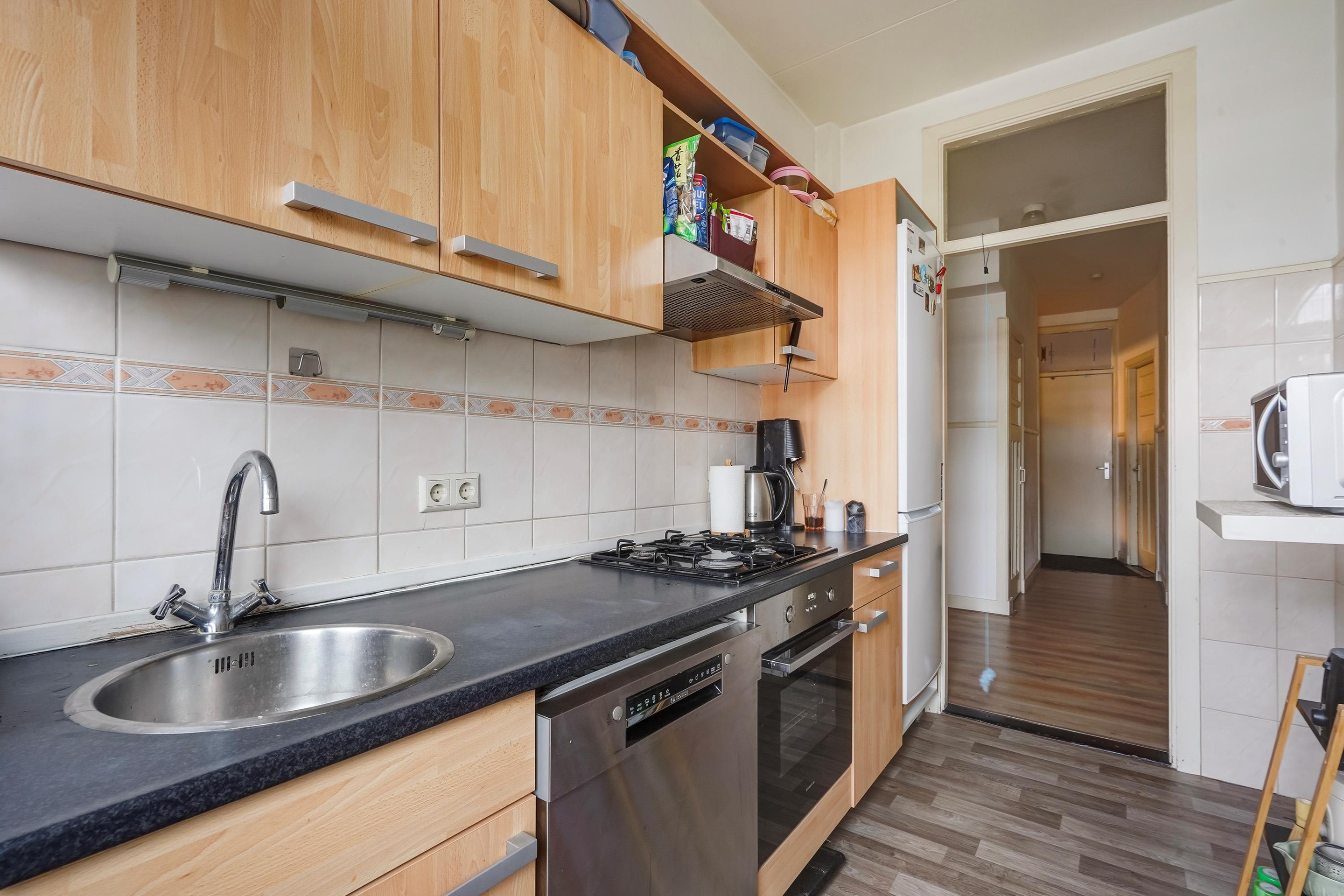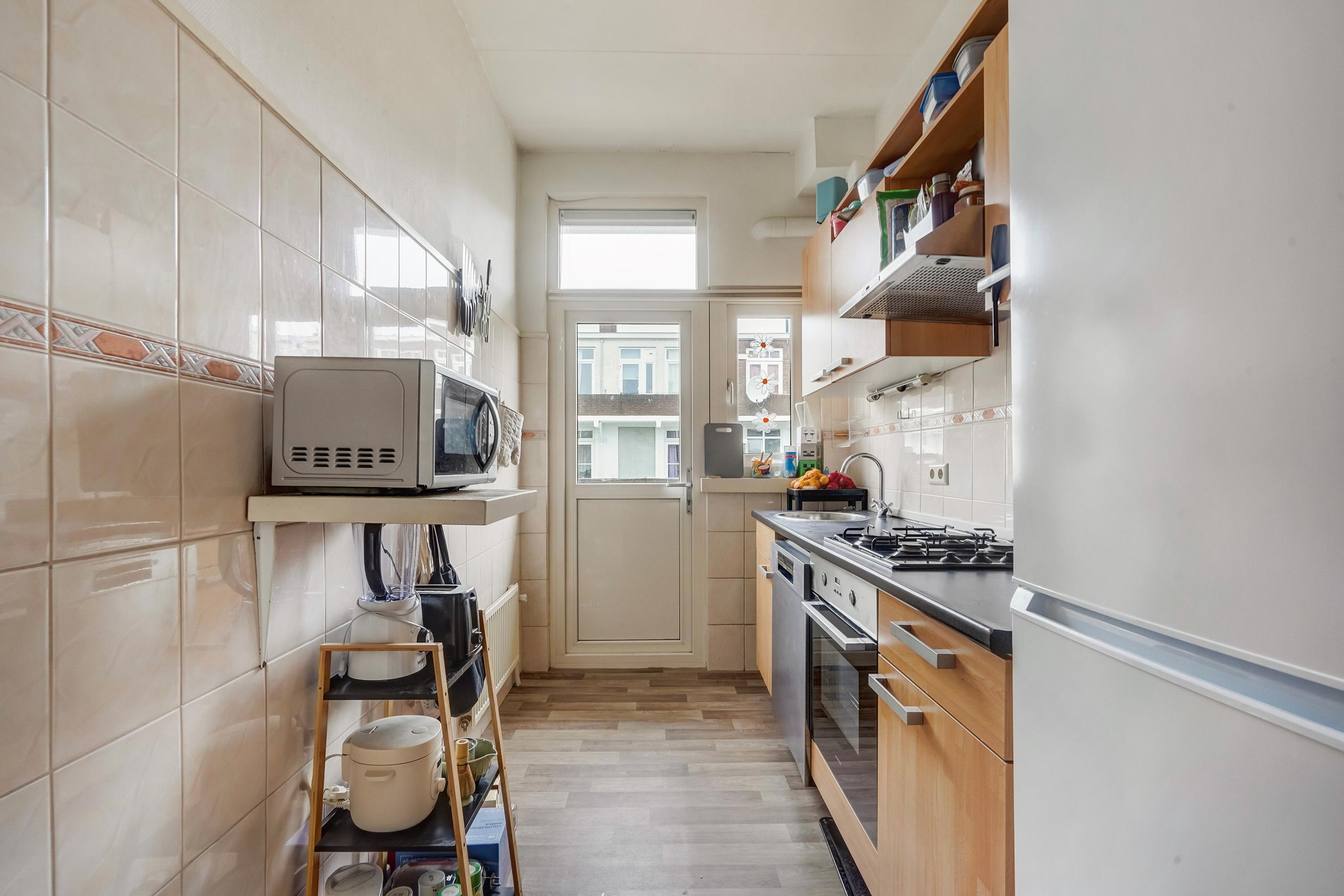 Ook vanuit de keuken is er toegang tot het achtergelegen balkon – een fijne plek om van de buitenlucht te genieten.