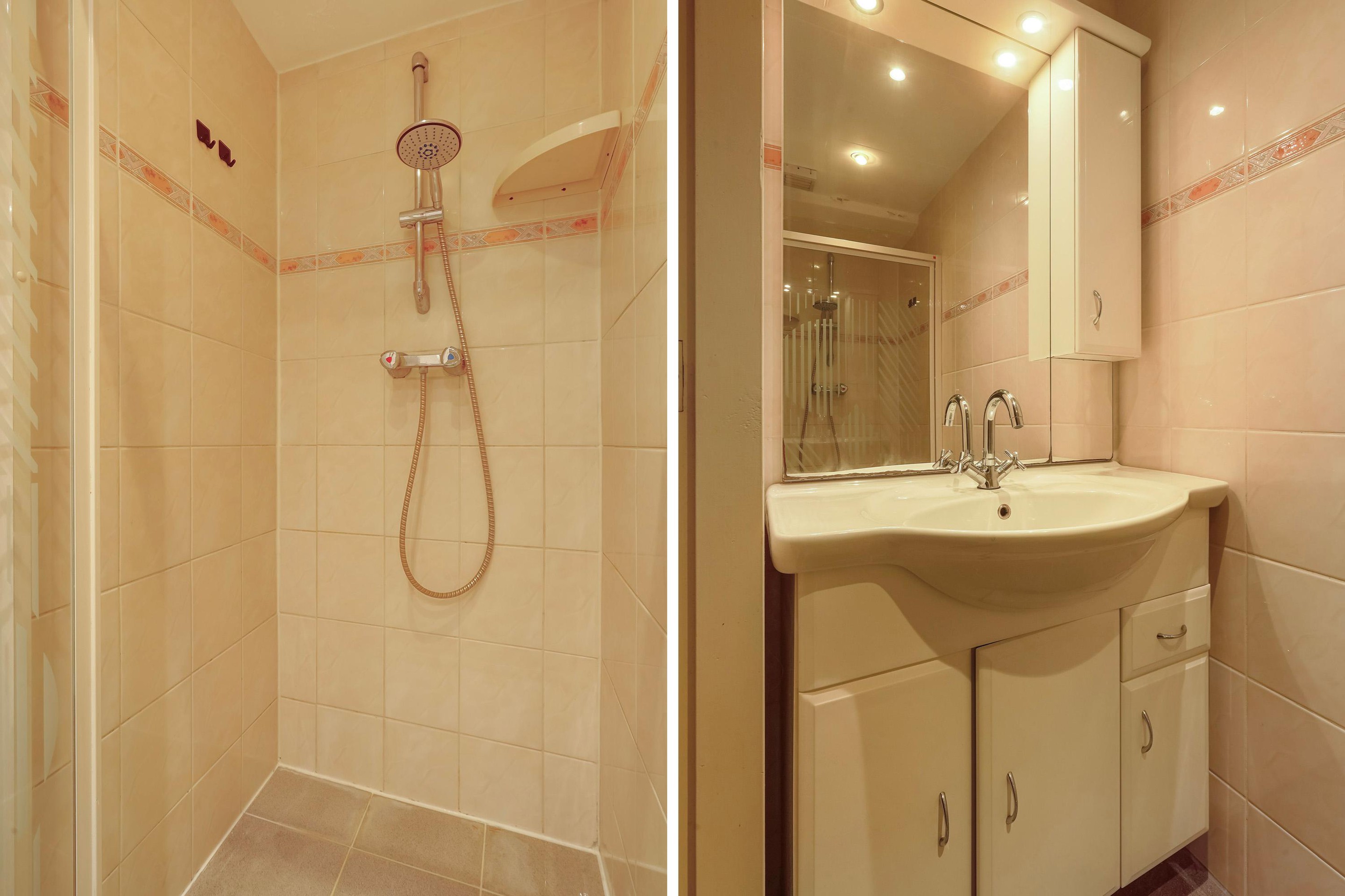 De badkamer is volledig betegeld en voorzien van een douchecabine en wastafelmeubel.