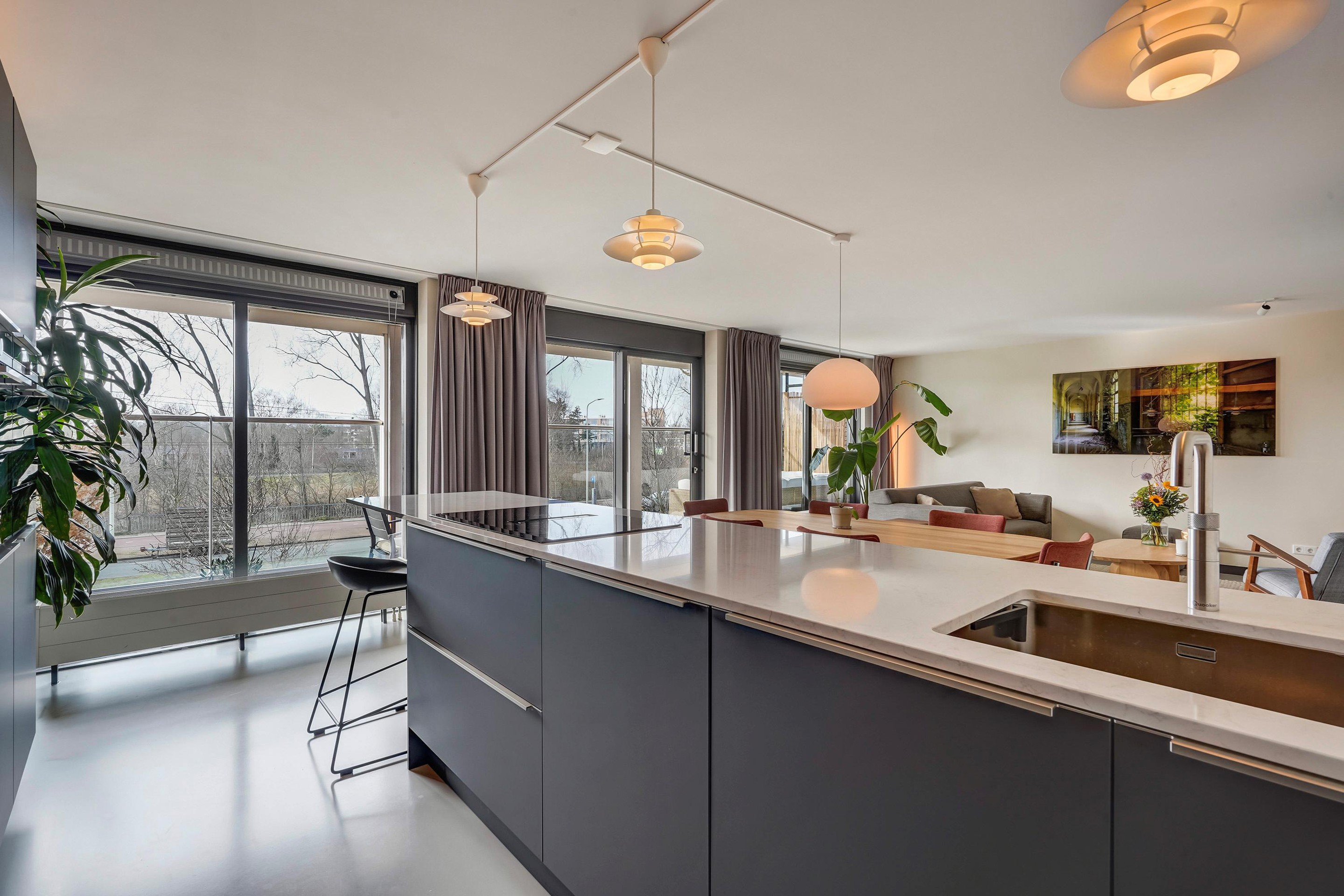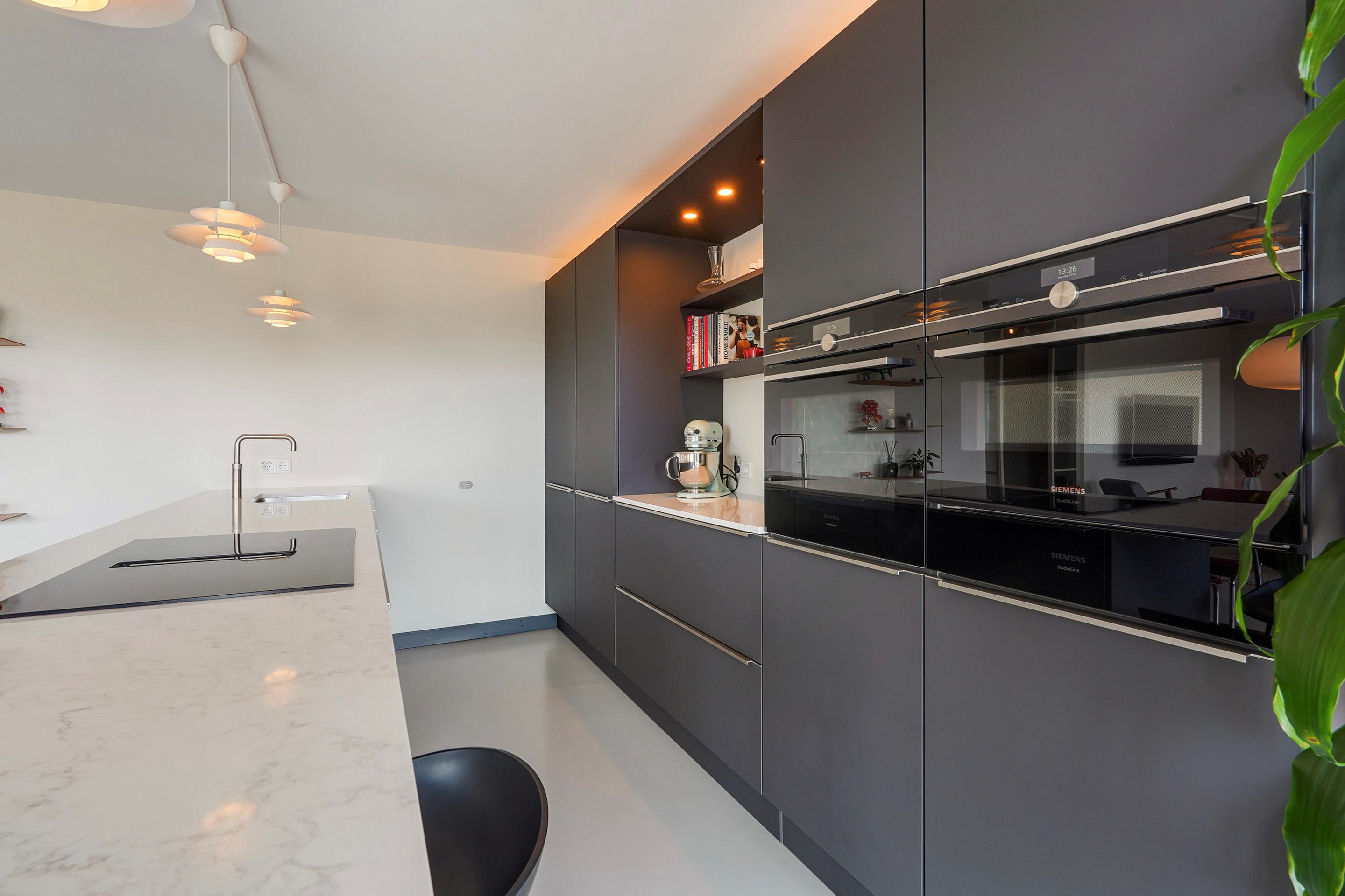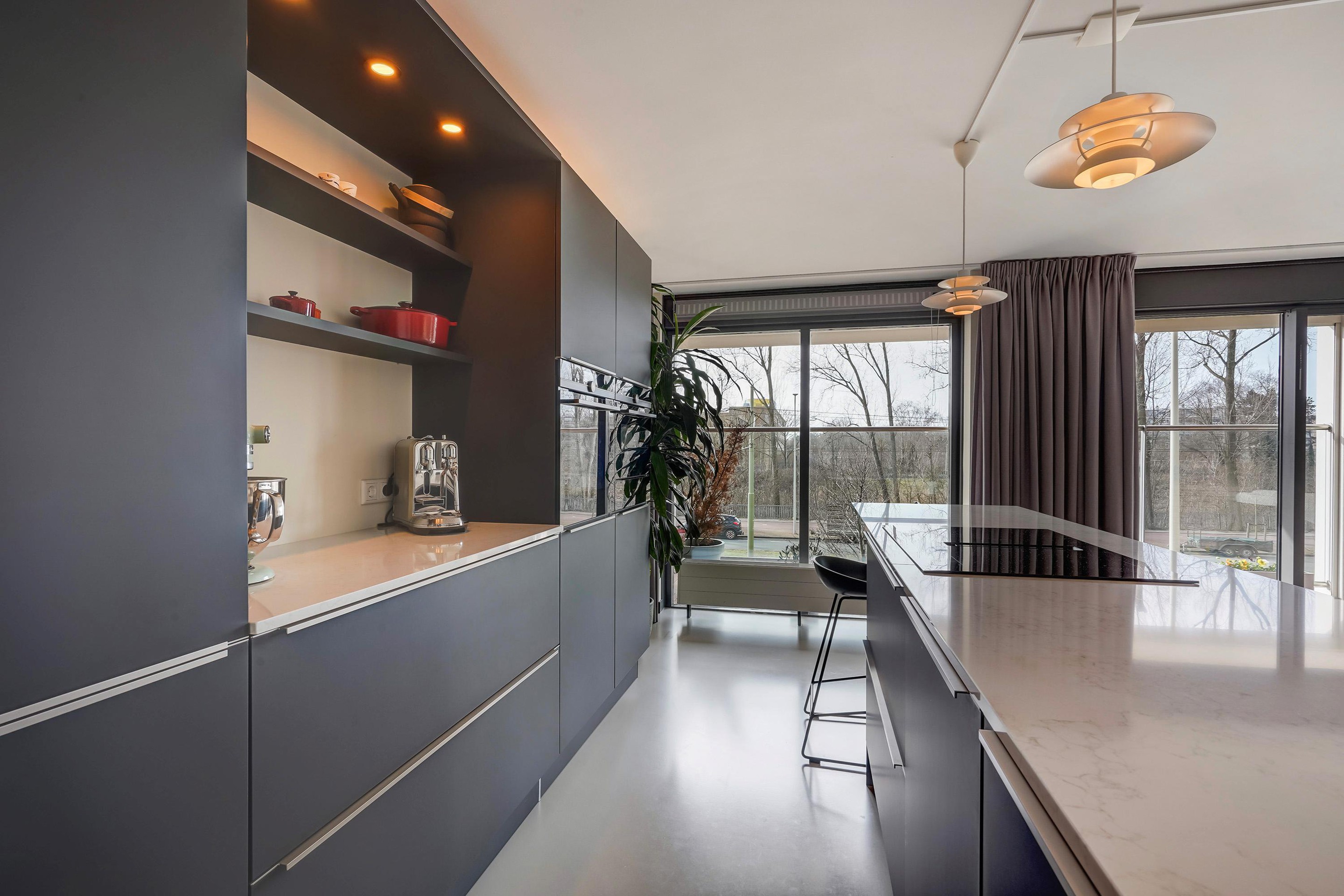 De luxe open keuken is uitgevoerd in mat donkergrijs met een licht composiet werkblad en vormt het stijlvolle hart van de woning. Het royale kookeiland met barfunctie biedt volop werk- en bergruimte en is perfect om aan te koken én te borrelen. De keuken is voorzien van hoogwaardige inbouwapparatuur, waaronder een inductiekookplaat met geïntegreerde afzuiging, (combi)oven met warmhoud lade, stoomoven, Quooker, vaatwasser en volledige hoogte koelkast en aparte ruime vriezer, De kastenwand met geïntegreerde verlichting zorgt voor een strak en sfeervol geheel.