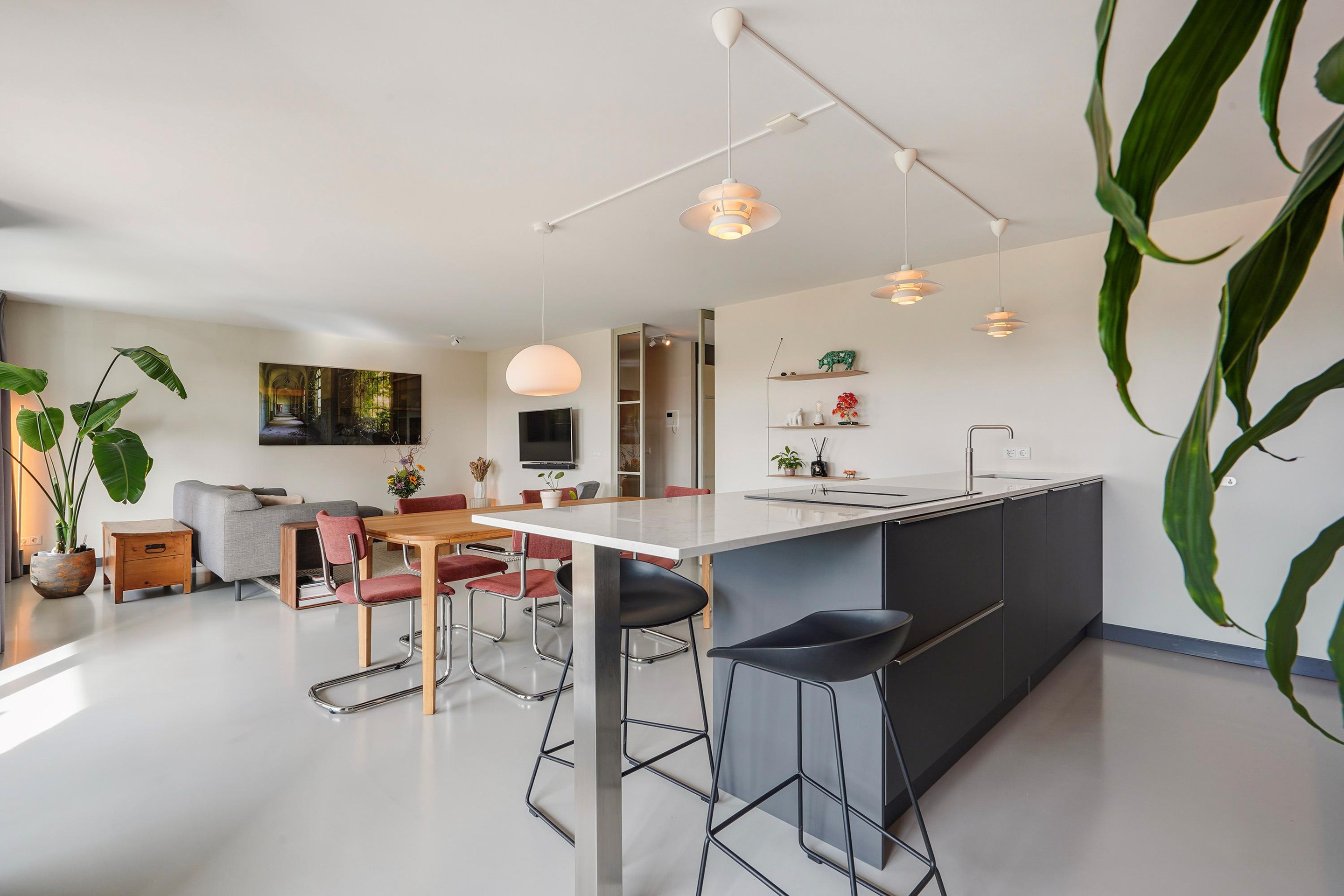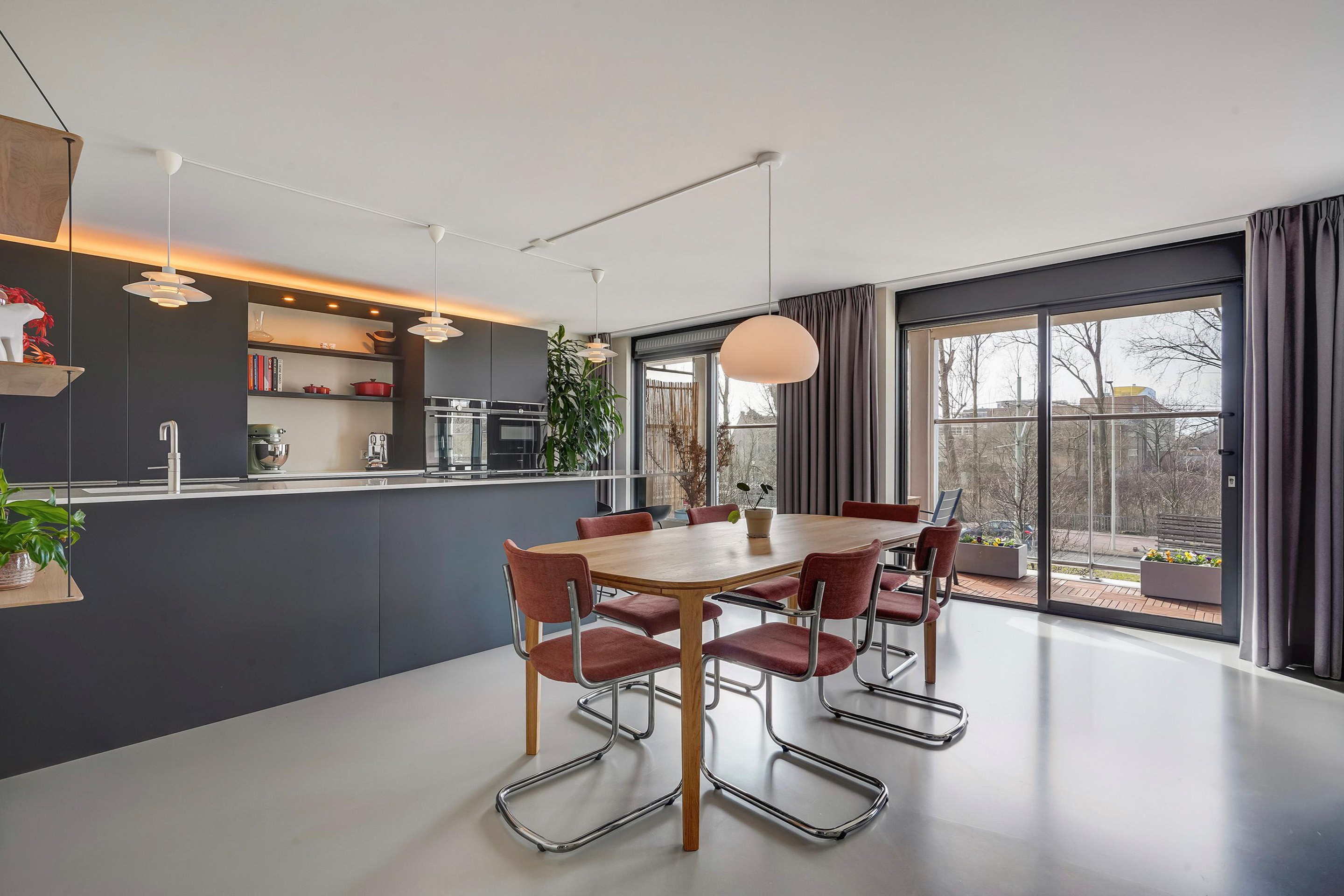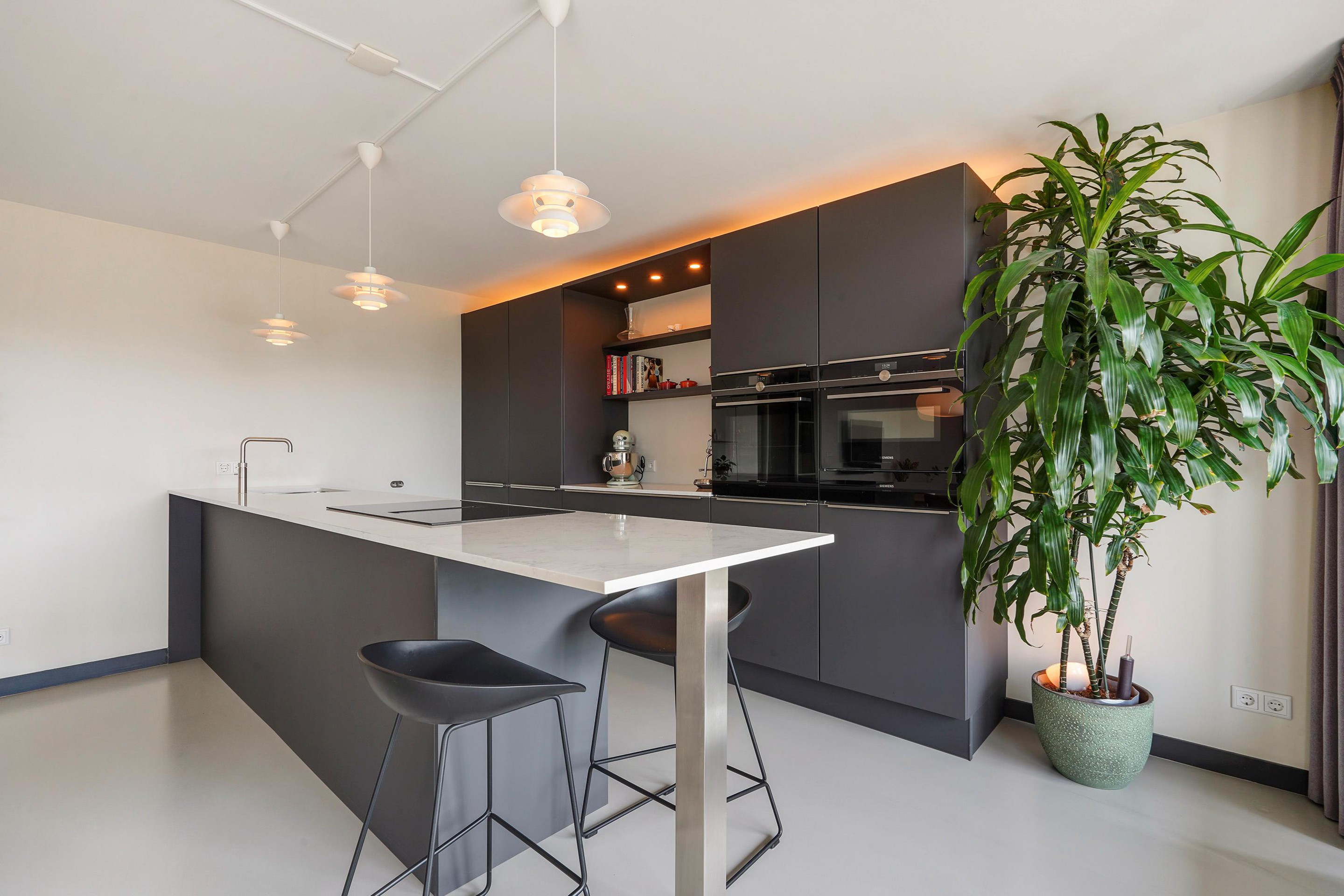 De luxe open keuken is uitgevoerd in mat donkergrijs met een licht composiet werkblad en vormt het stijlvolle hart van de woning. Het royale kookeiland met barfunctie biedt volop werk- en bergruimte en is perfect om aan te koken én te borrelen. De keuken is voorzien van hoogwaardige inbouwapparatuur, waaronder een inductiekookplaat met geïntegreerde afzuiging, (combi)oven met warmhoud lade, stoomoven, Quooker, vaatwasser en volledige hoogte koelkast en aparte ruime vriezer, De kastenwand met geïntegreerde verlichting zorgt voor een strak en sfeervol geheel.