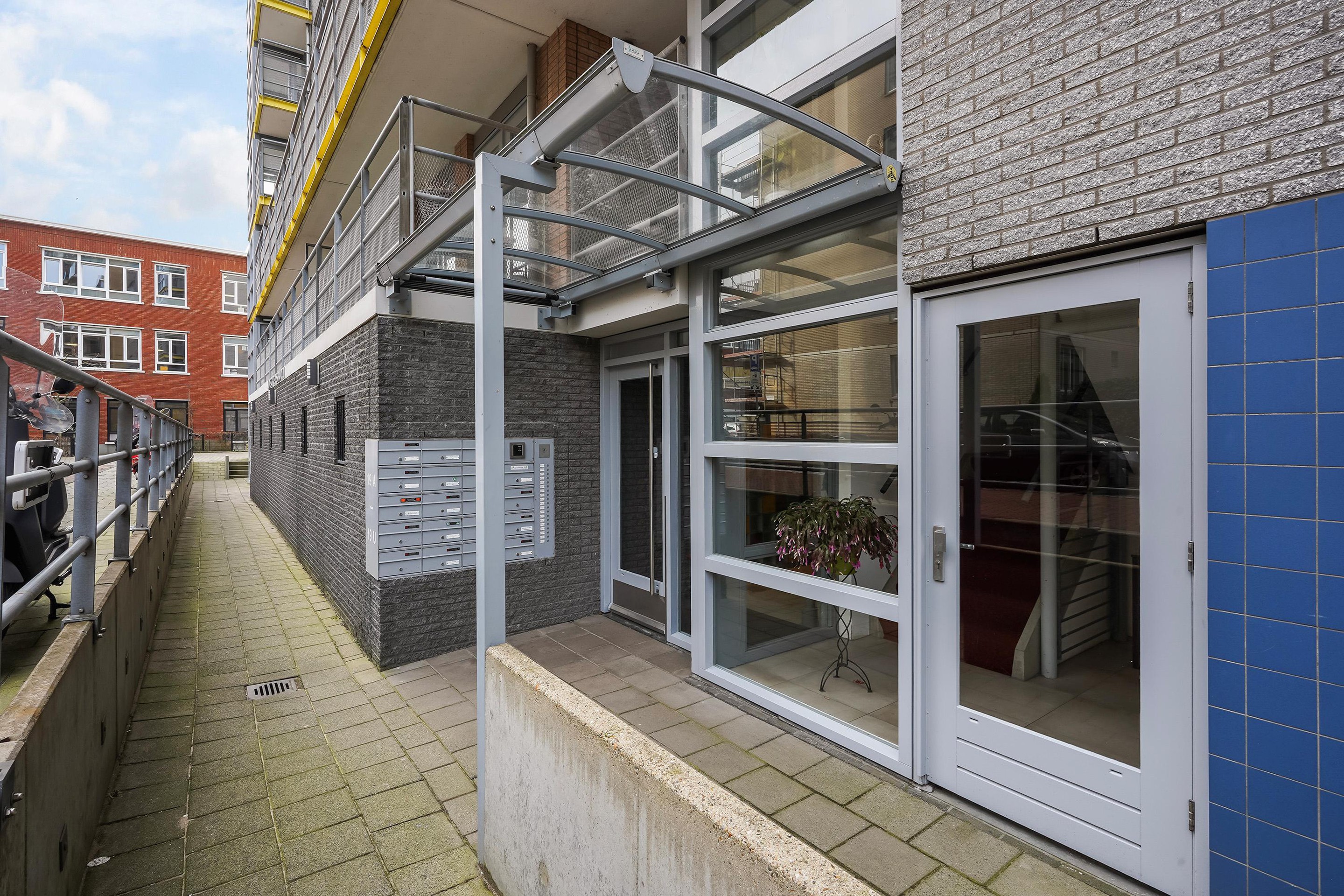 Afgesloten entree met bellentableau en brievenbussen. De lift en de toegang tot het trappenhuis en de privé berging – ideaal voor fietsen en extra opslag.
