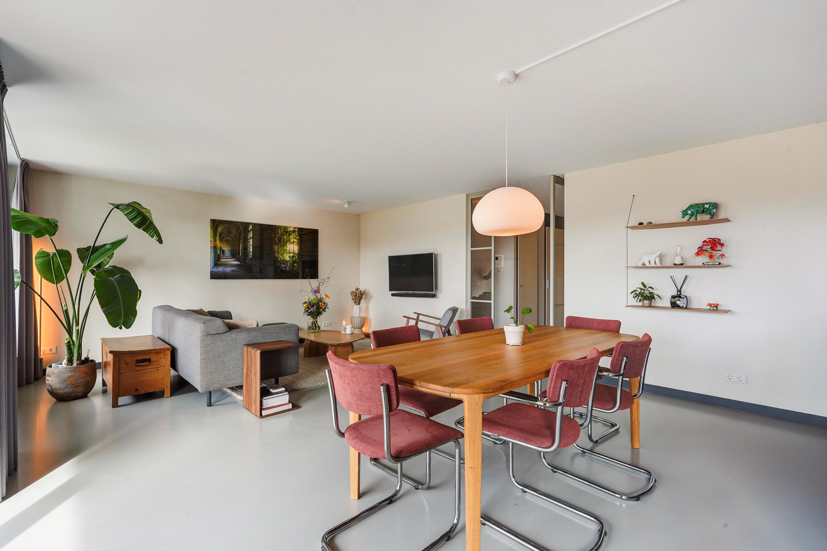 De lichte en royale woon-/eetkamer bevindt zich aan de voorzijde en biedt via grote raampartijen toegang tot het brede balkon op het Zuidwesten, voorzien van elektrische zonwering. Dankzij de grote glaspartijen geniet u hier van veel daglicht en een vrij uitzicht. De strakke afwerking geeft de ruimte een eigentijdse uitstraling.