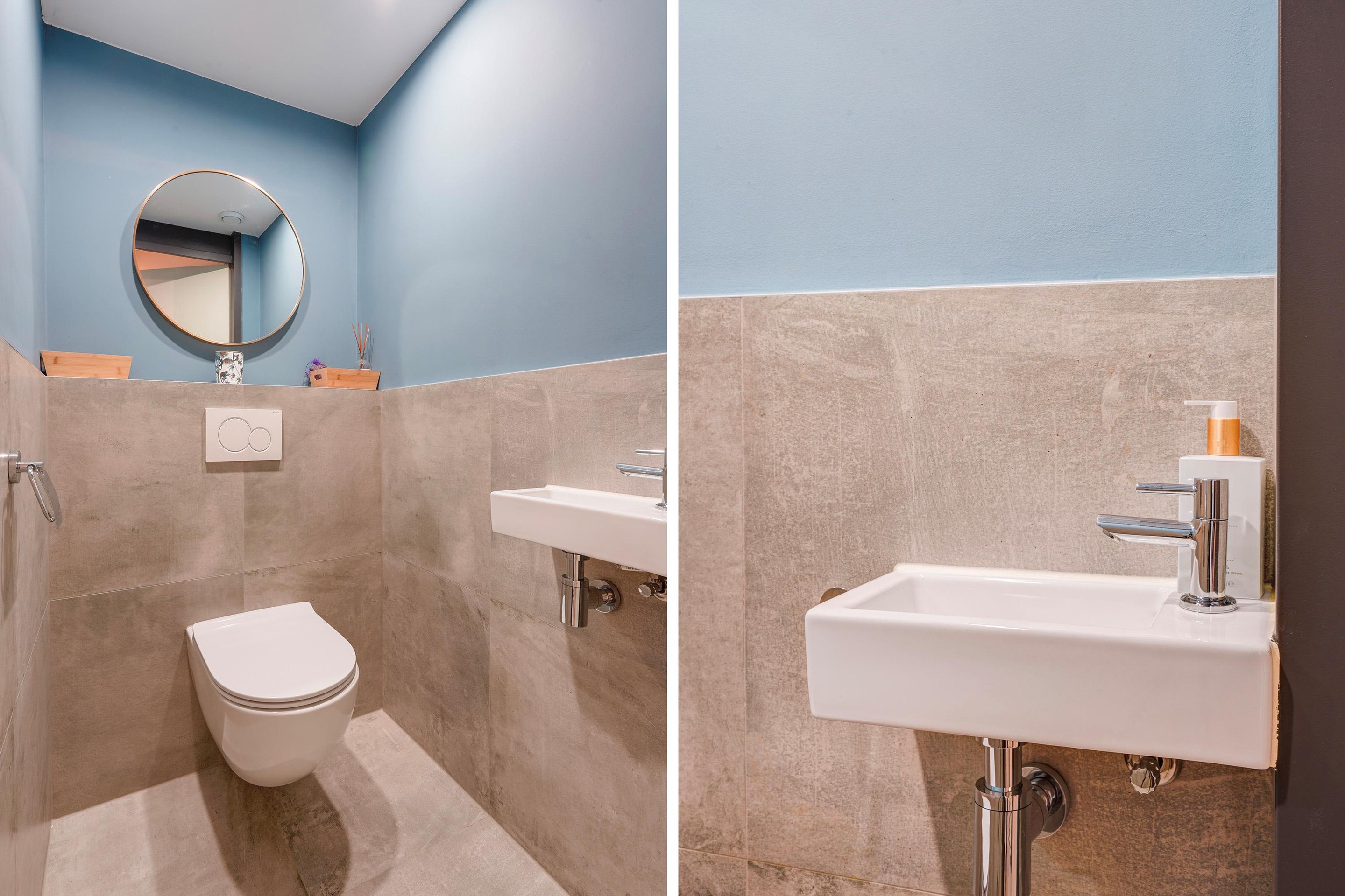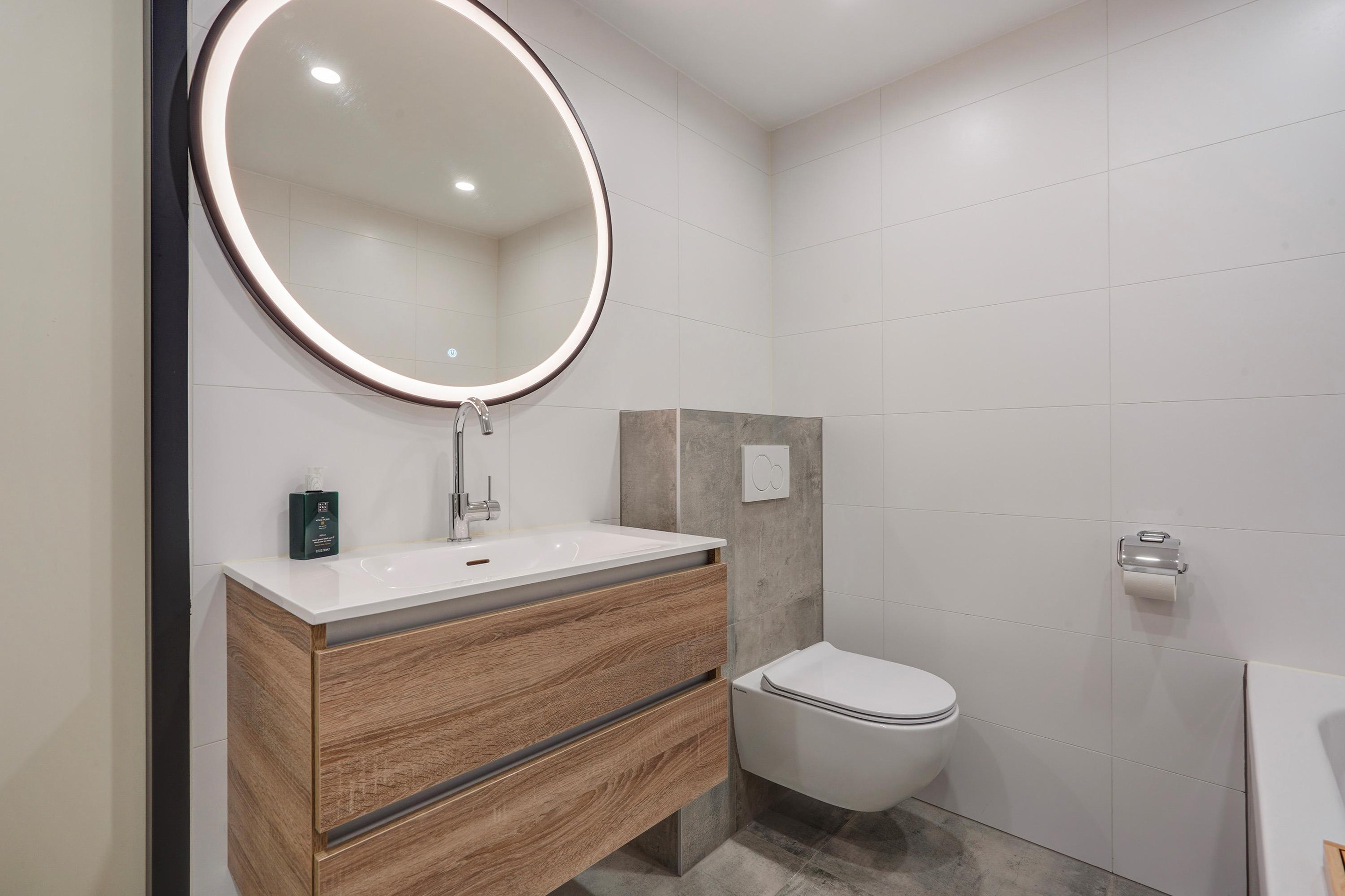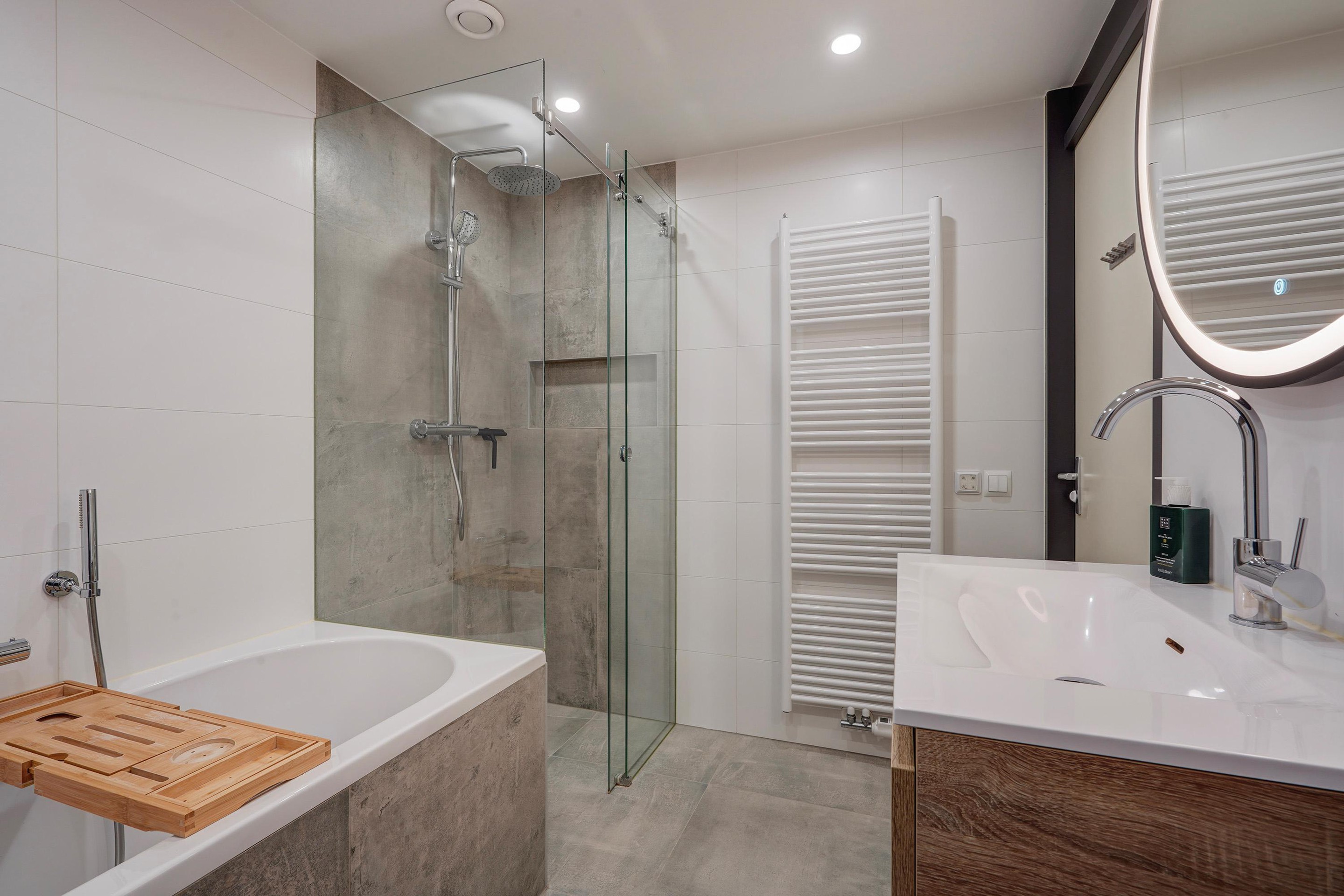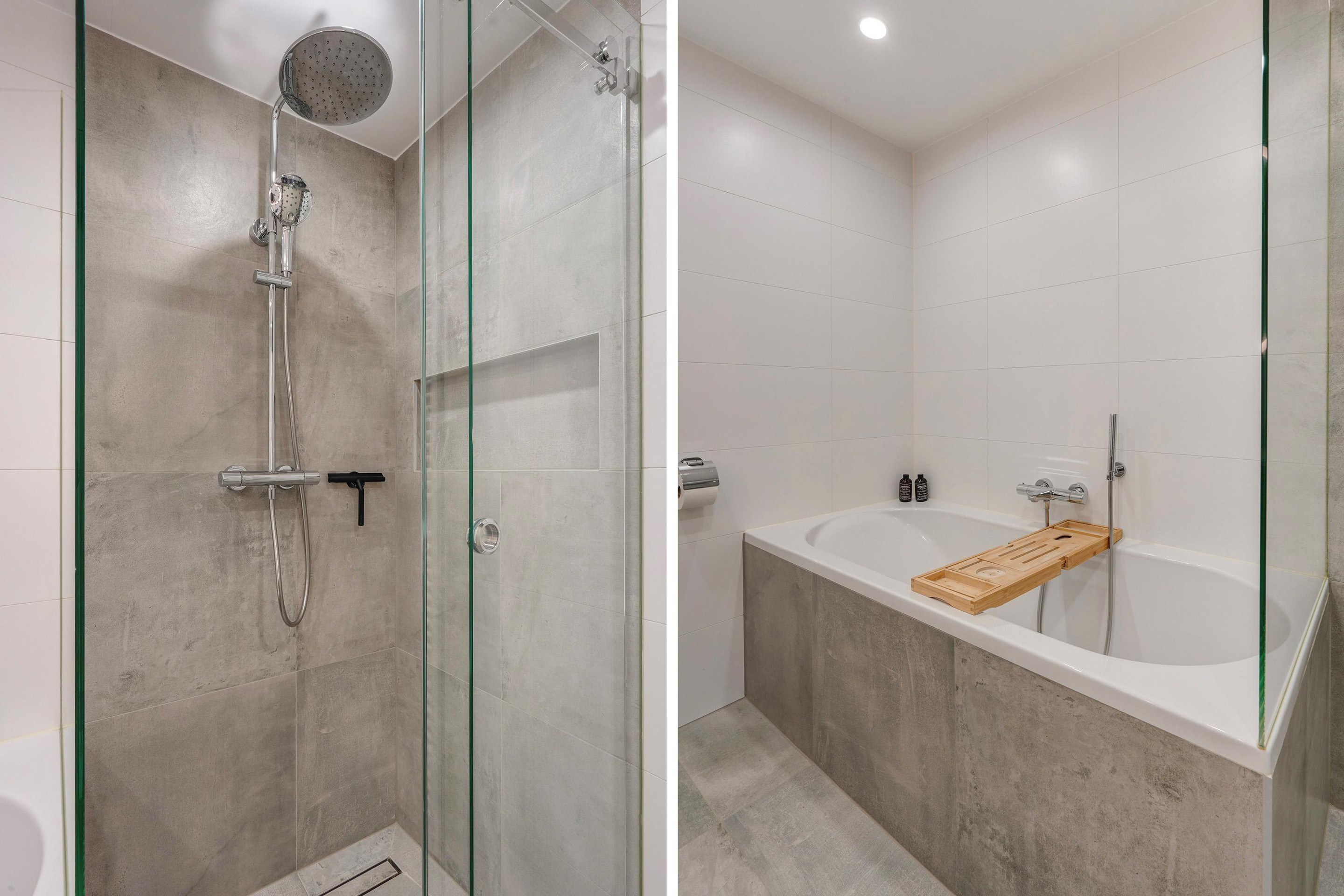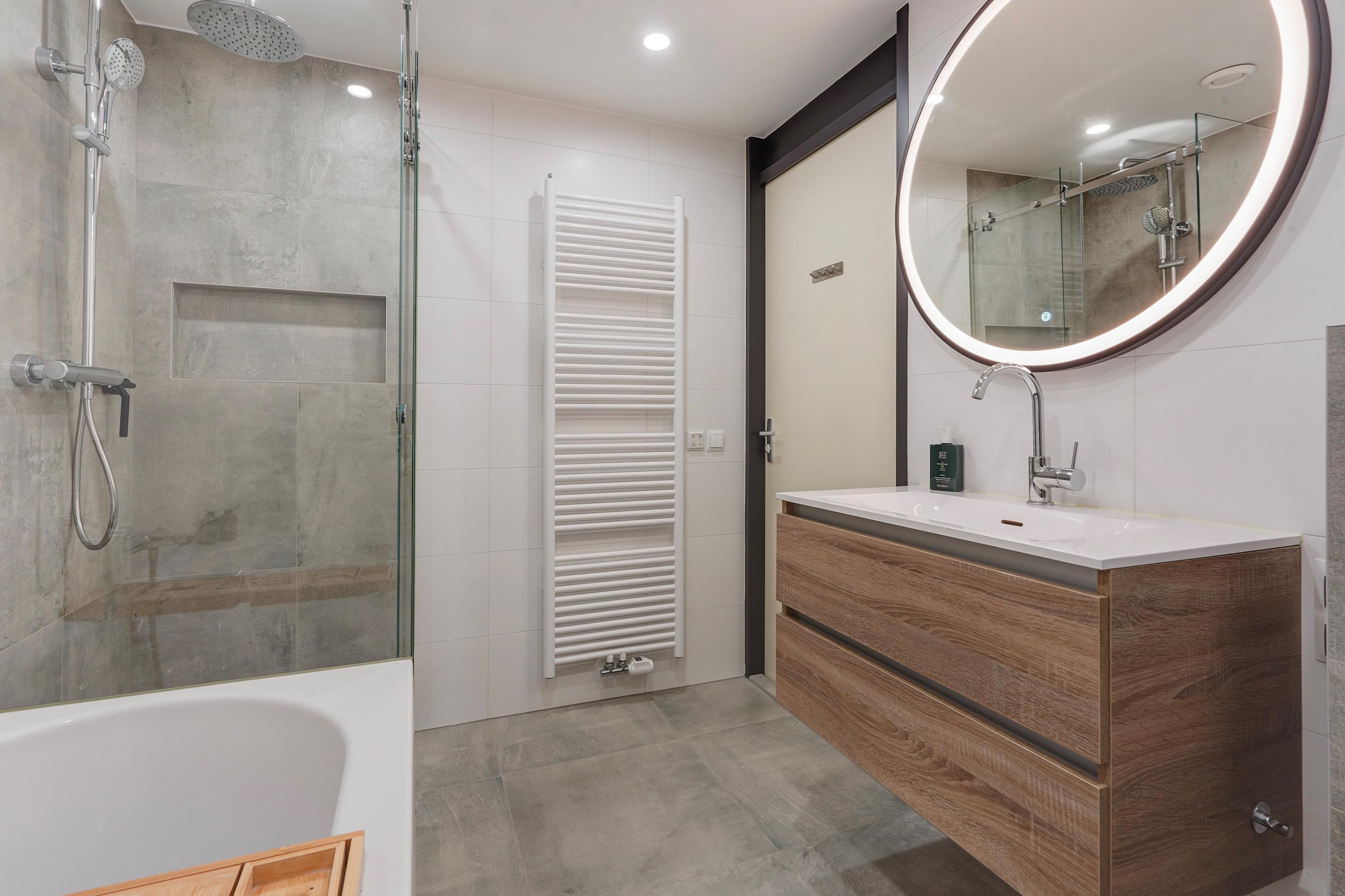 De badkamer is strak en eigentijds afgewerkt met een stijlvolle combinatie van lichte wandtegels en betonlook accenten. De ruimte beschikt over een ruime inloopdouche met glazen wand en regendouche, een comfortabel ligbad, tweede toilet en een modern wastafelmeubel met veel bergruimte. De verwarmde handdoekradiator en het verlichte en verwarmde spiegelarmatuur zorgen voor een luxe hotelgevoel.