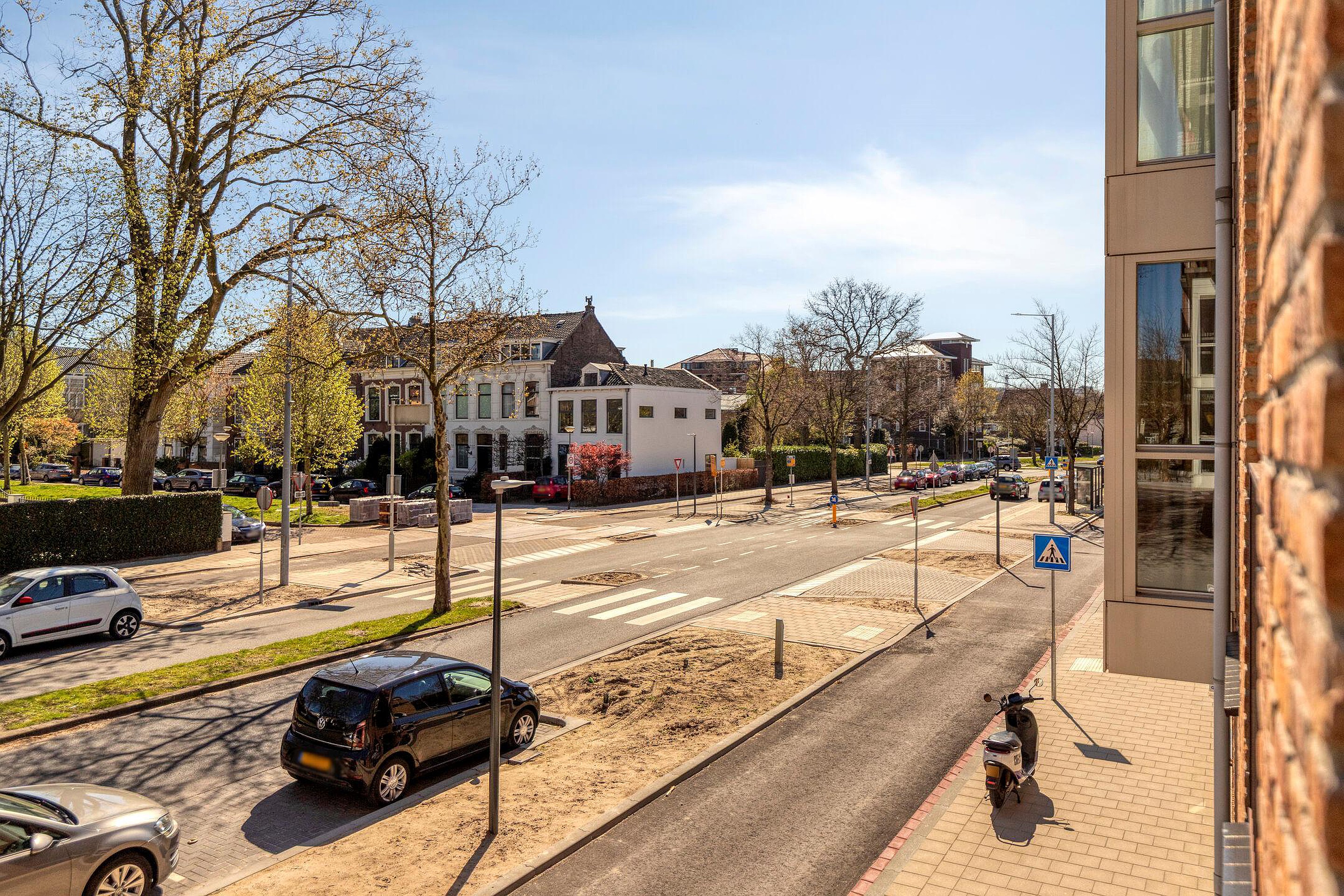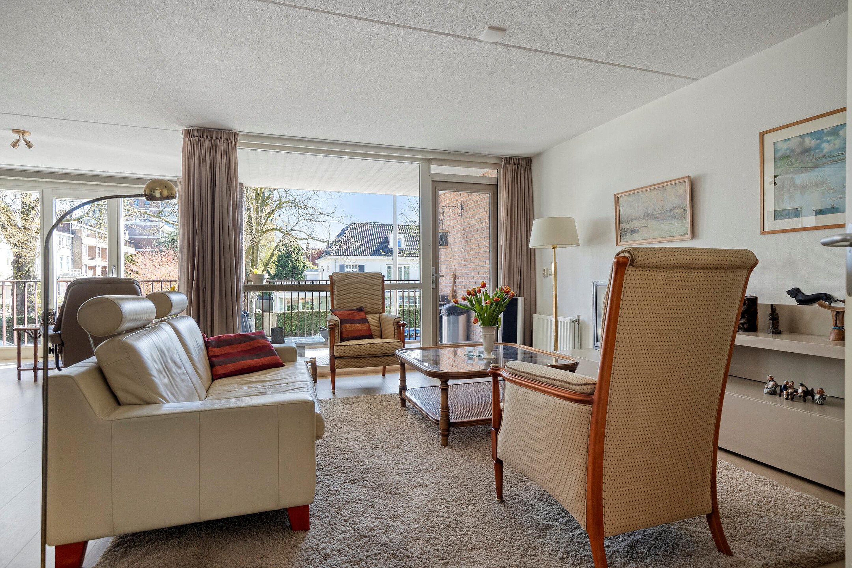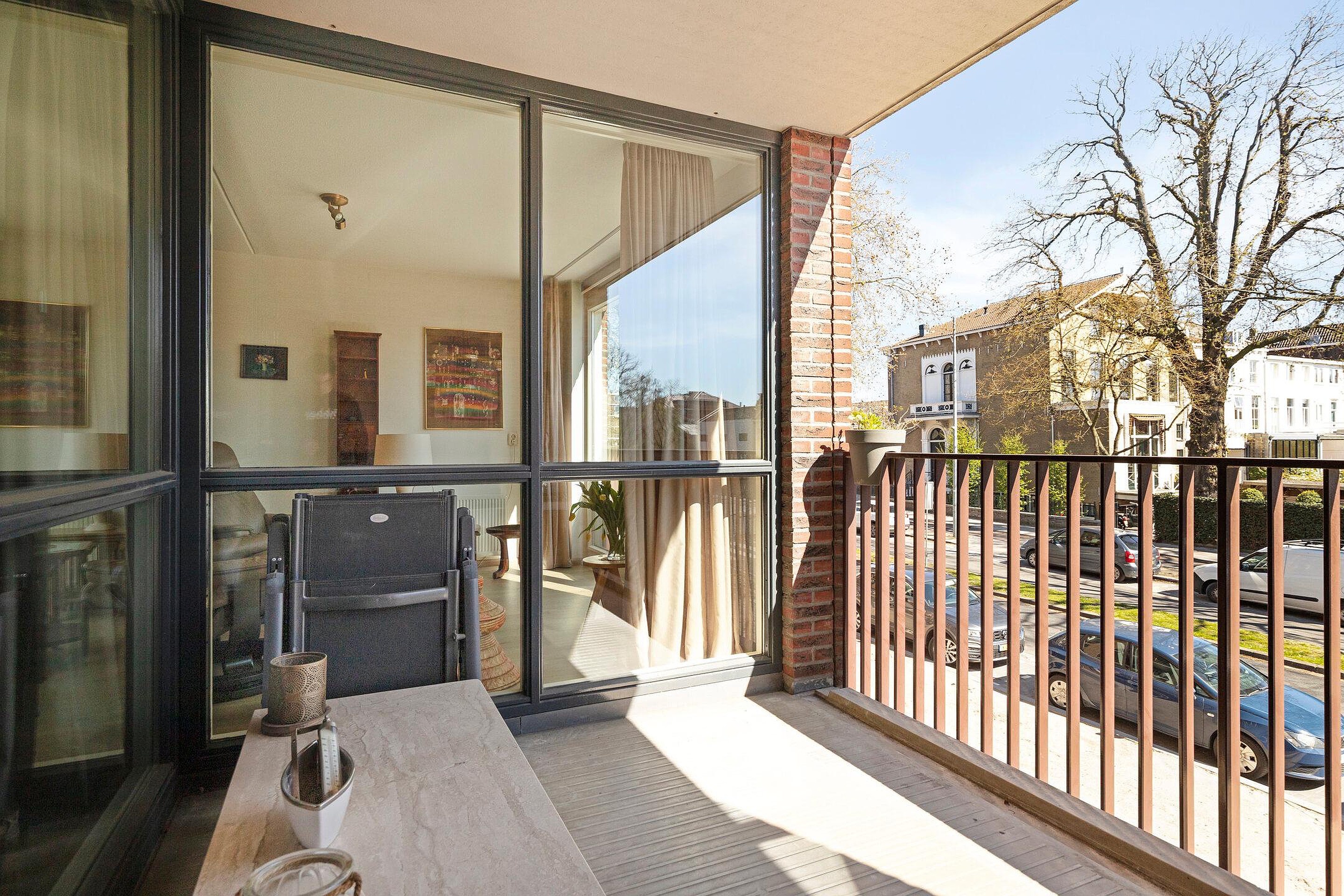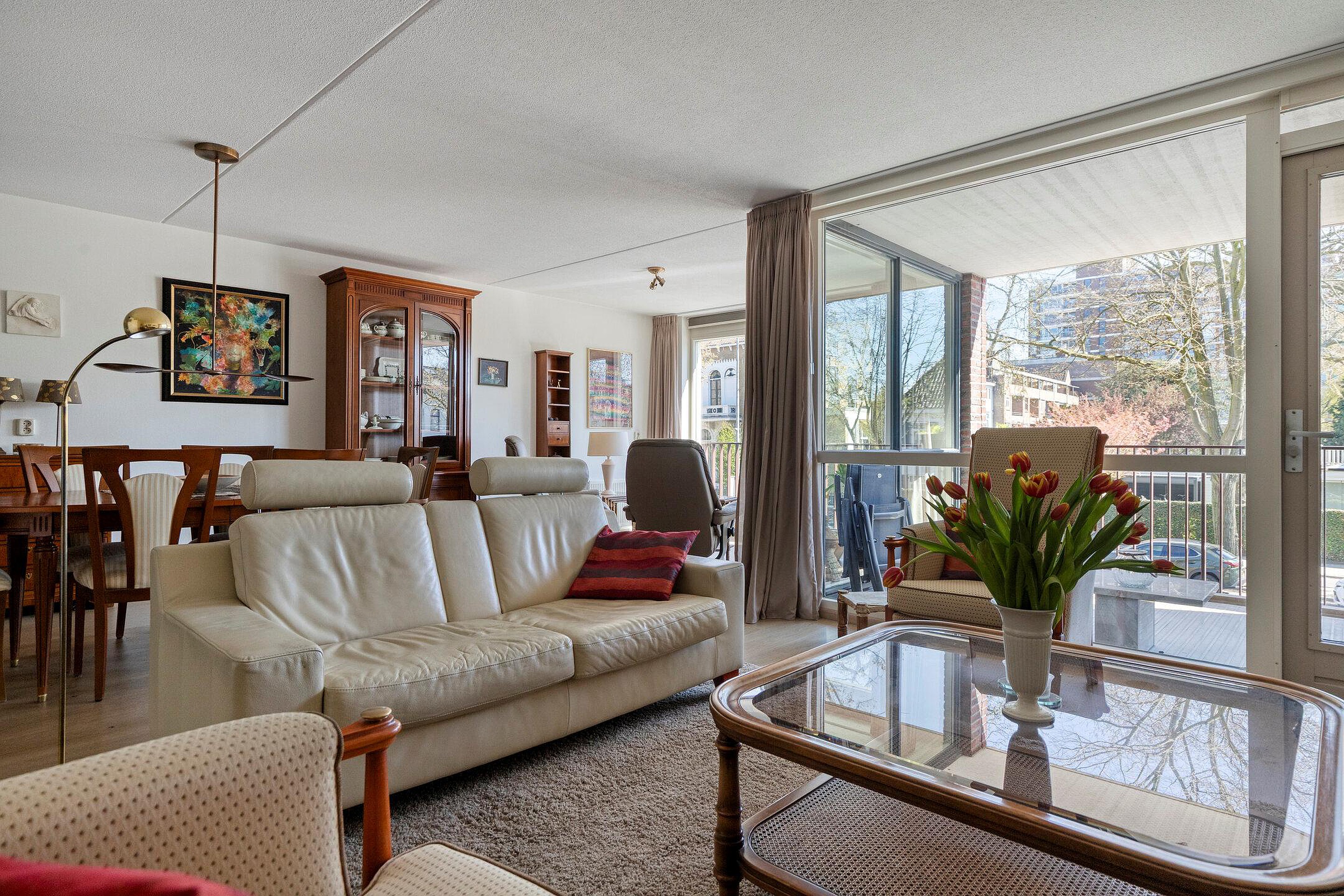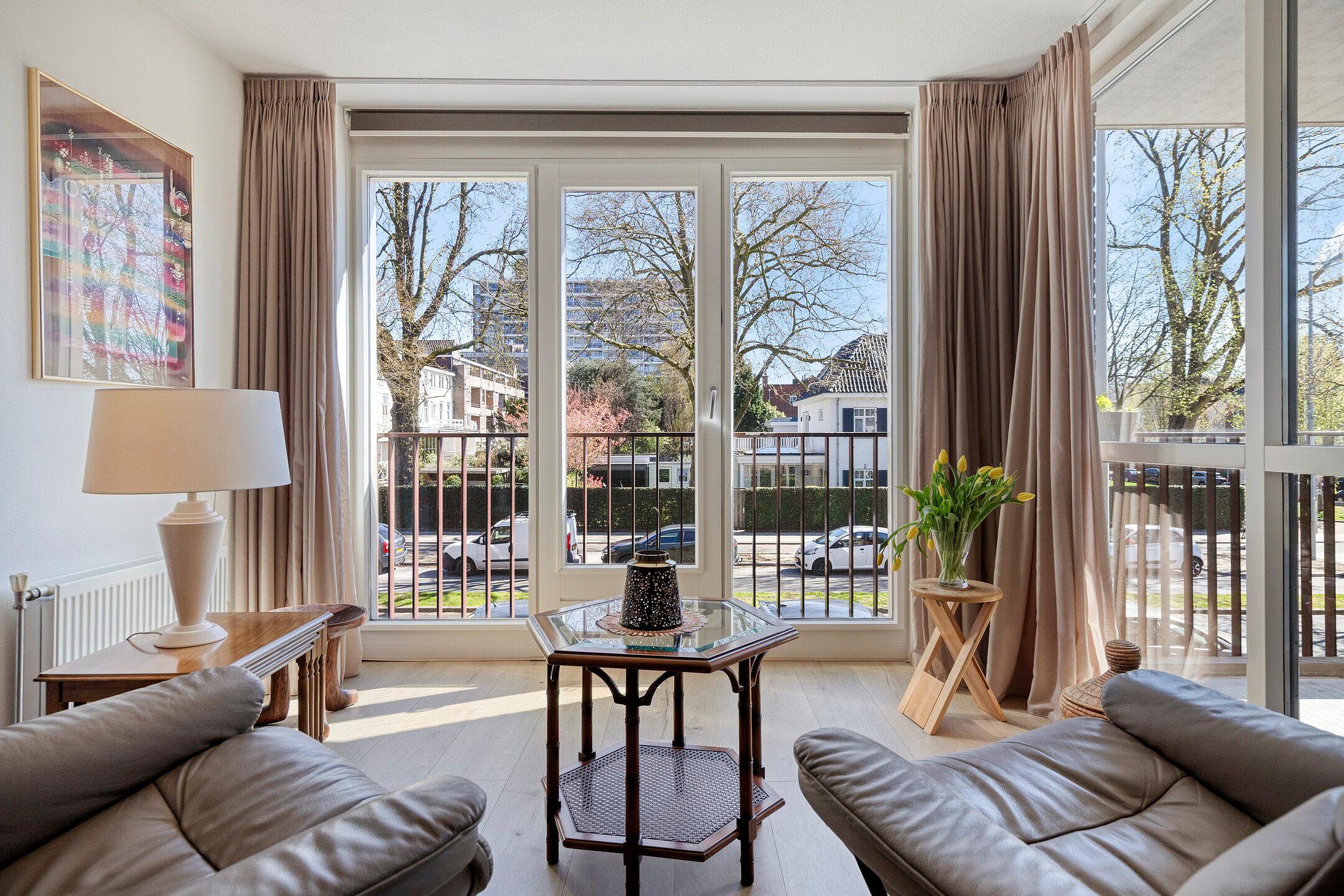 De woonkamer is heerlijk licht door de grote raampartij en heeft toegang tot het balkon op het zuidwesten. Wat kan je hier heerlijk zitten in de lente/zomer! Boven het bruisende leven van de stad met prachtig zicht richting het centrum.