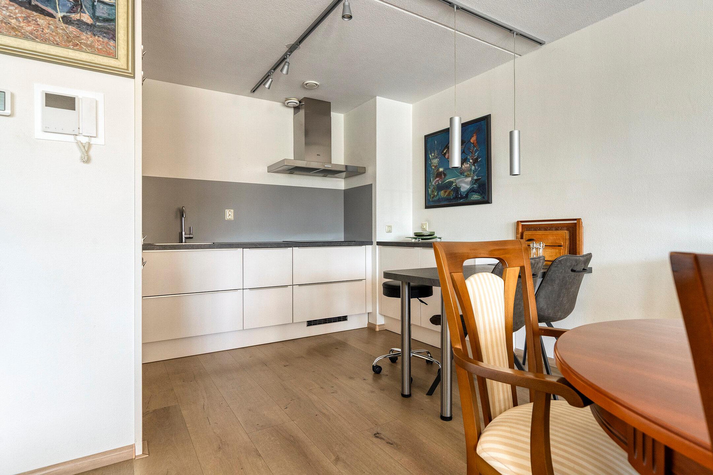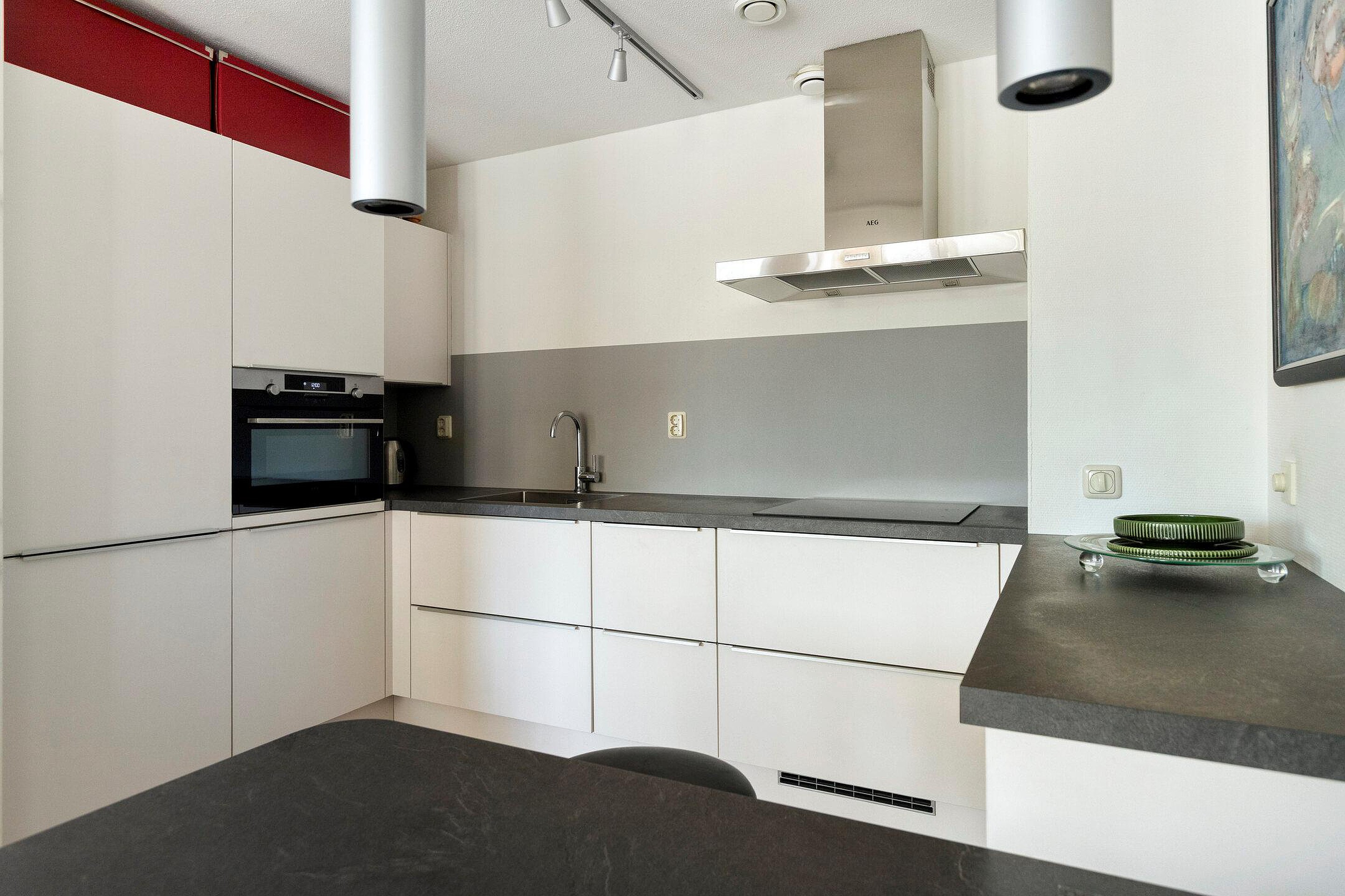 De woning heeft een moderne open keuken met inbouwapparatuur waaronder een oven, koelkast, vriezer, vaatwasser, inductiekookplaat en afzuigkap.