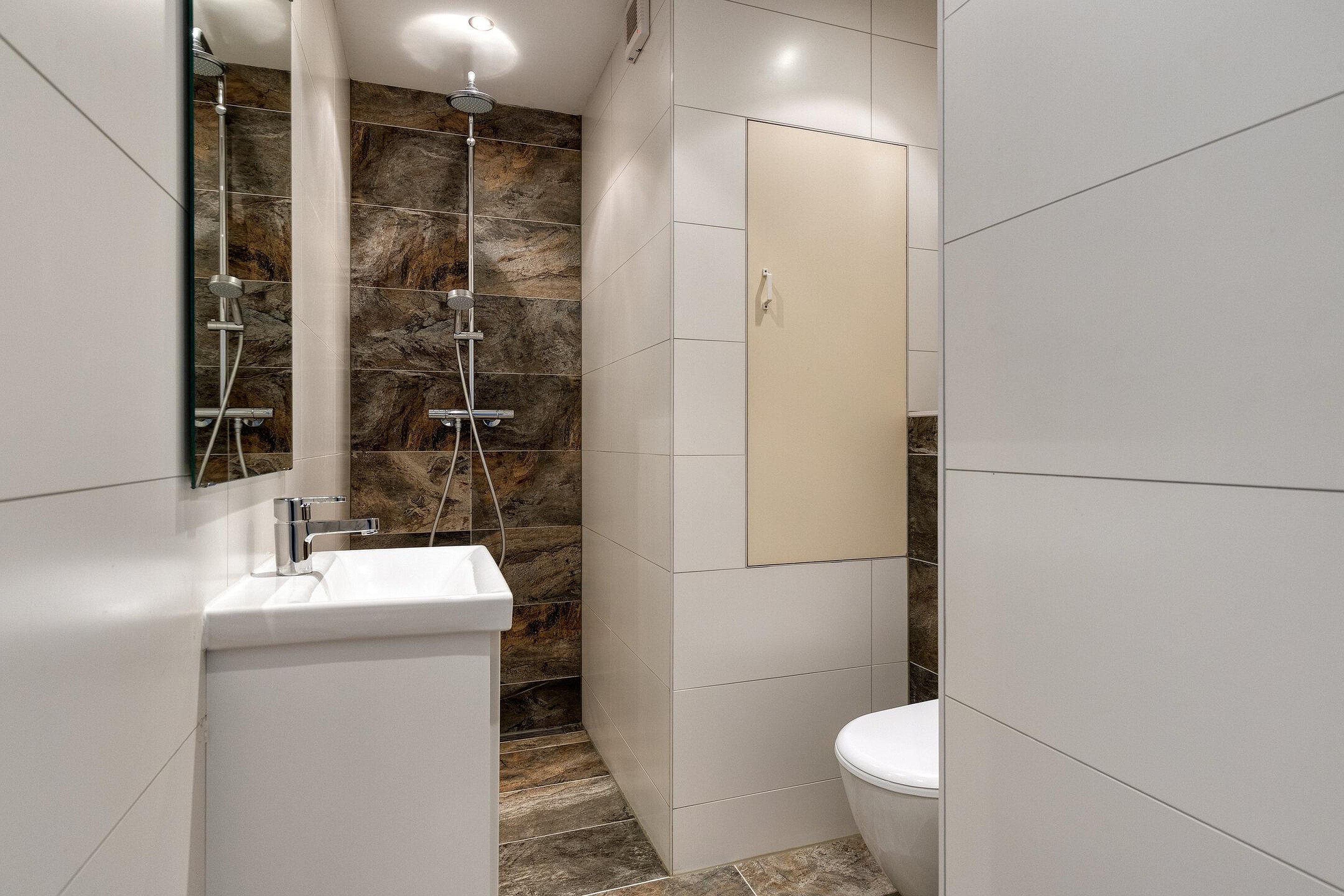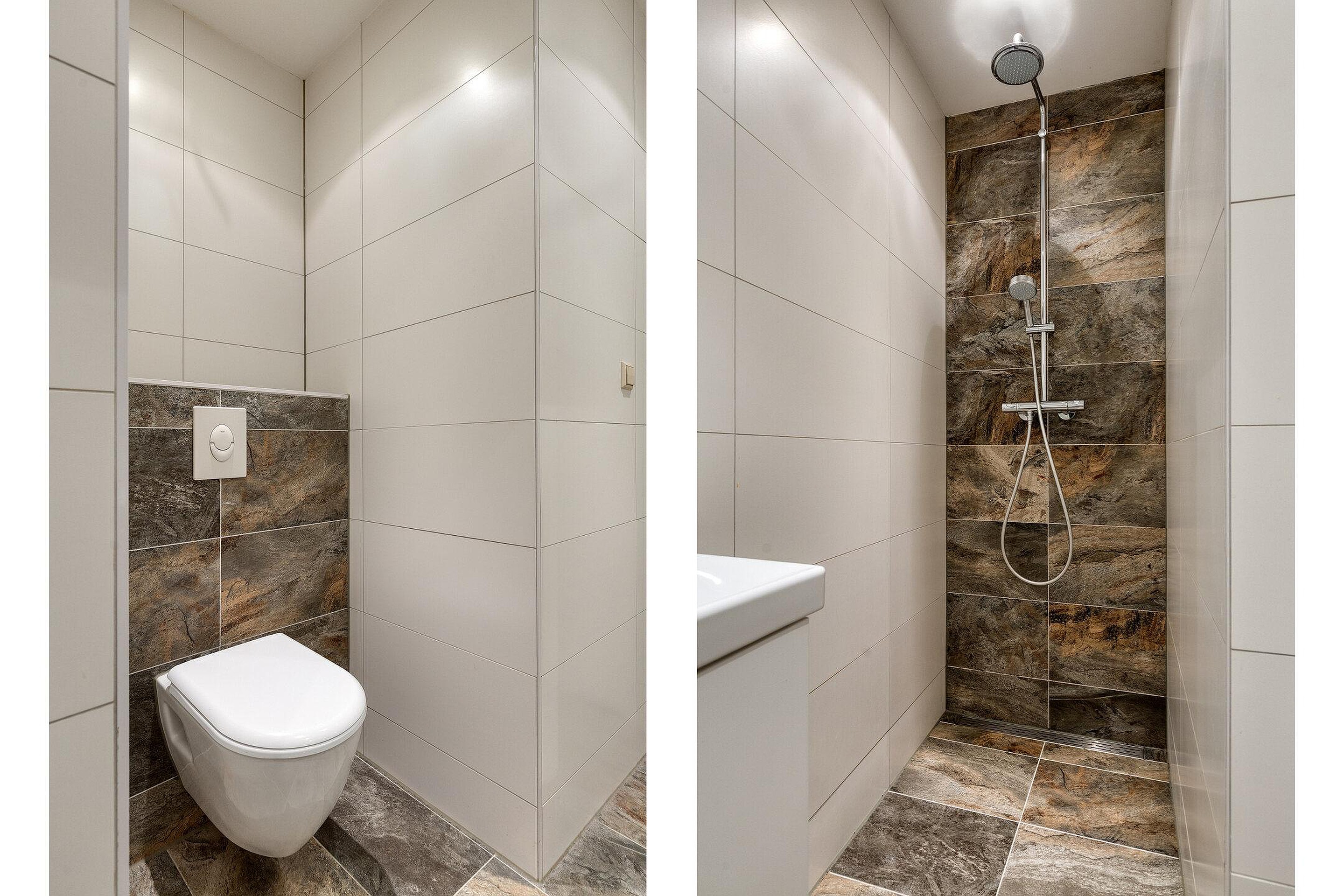 Moderne, geheel betegelde badkamer met inloopdouche, wastafelmeubel en toilet.