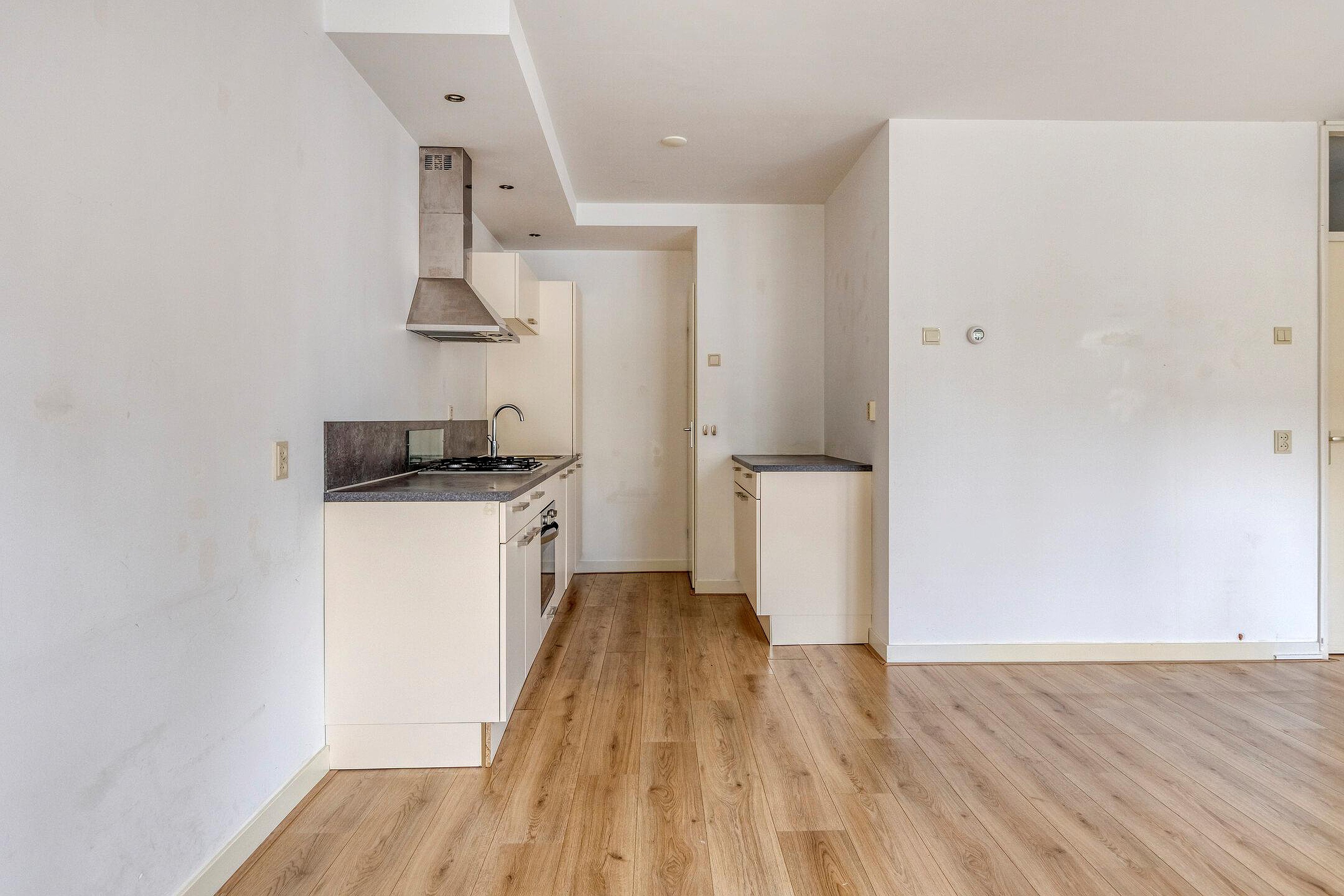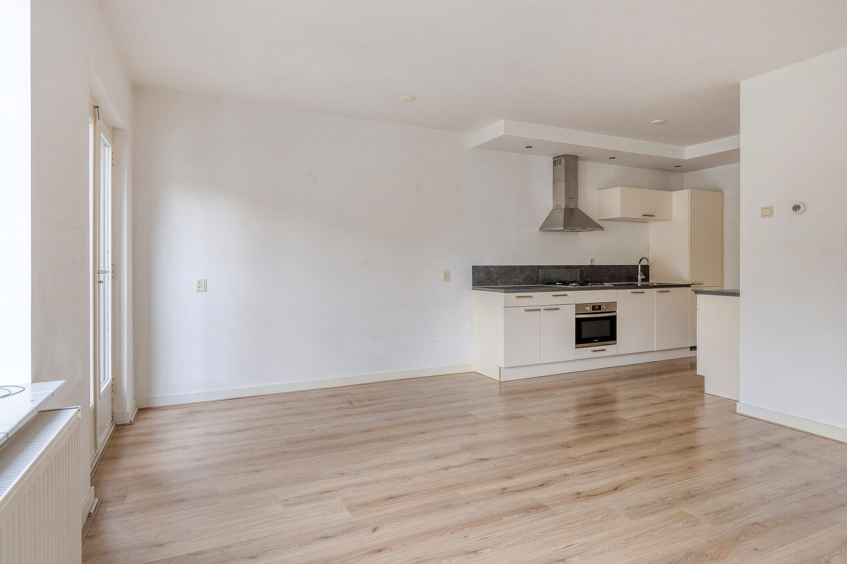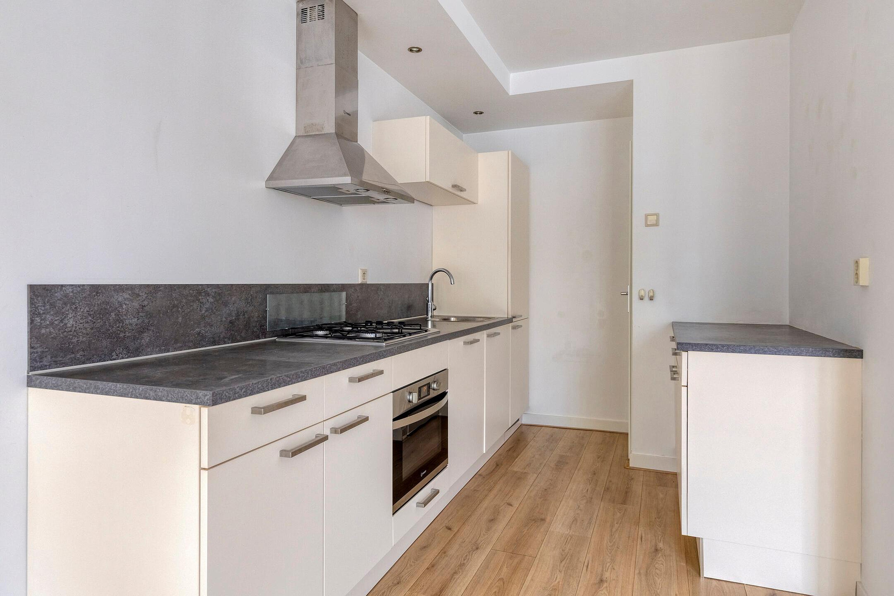 De lichte woonkamer met laminaatvloer heeft een charmant Frans balkon met fraai uitzicht op de Lange Haven. De moderne open keuken beschikt over een nette inrichting en diverse inbouwapparatuur. Er is een vaste kast voor de wasmachine.