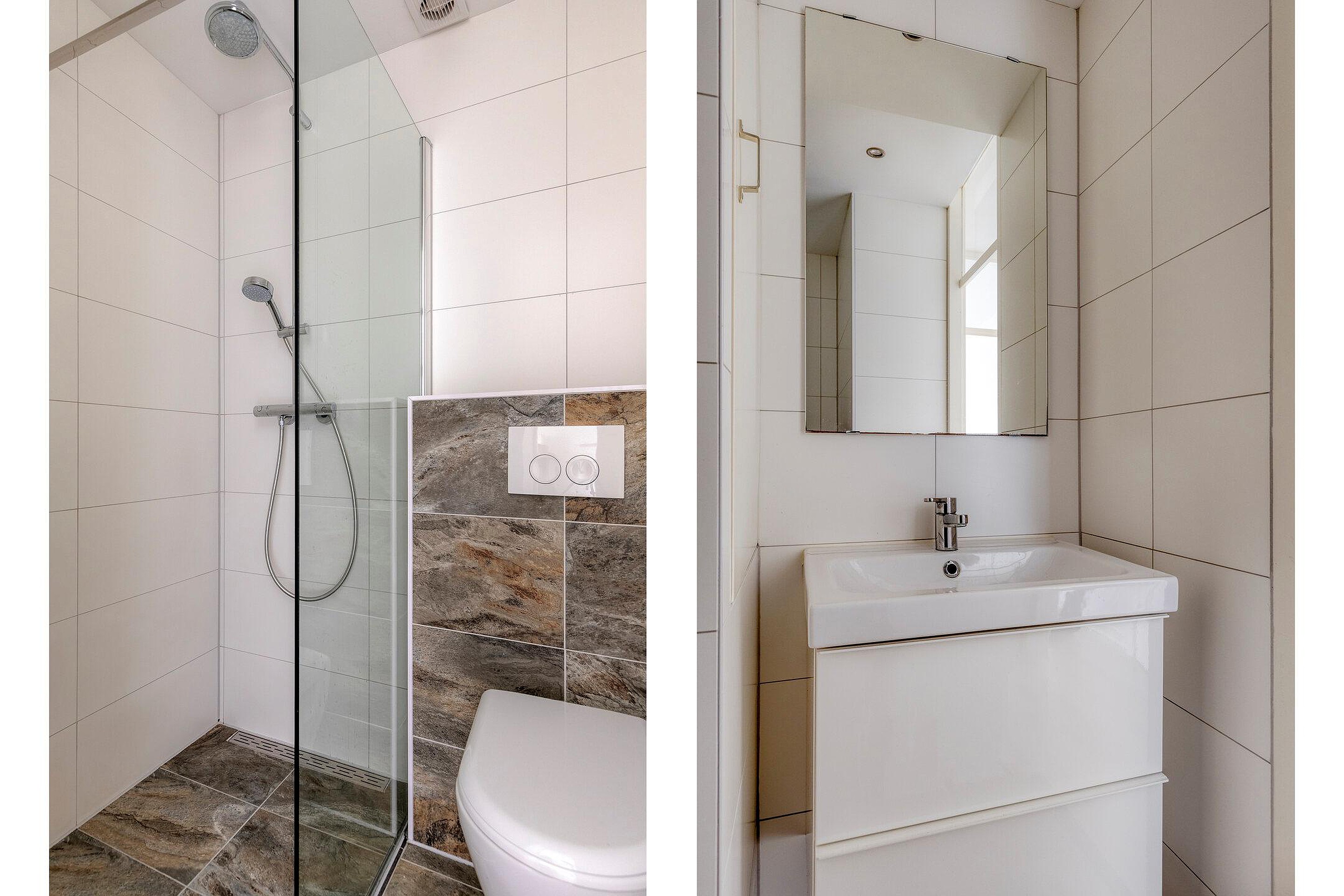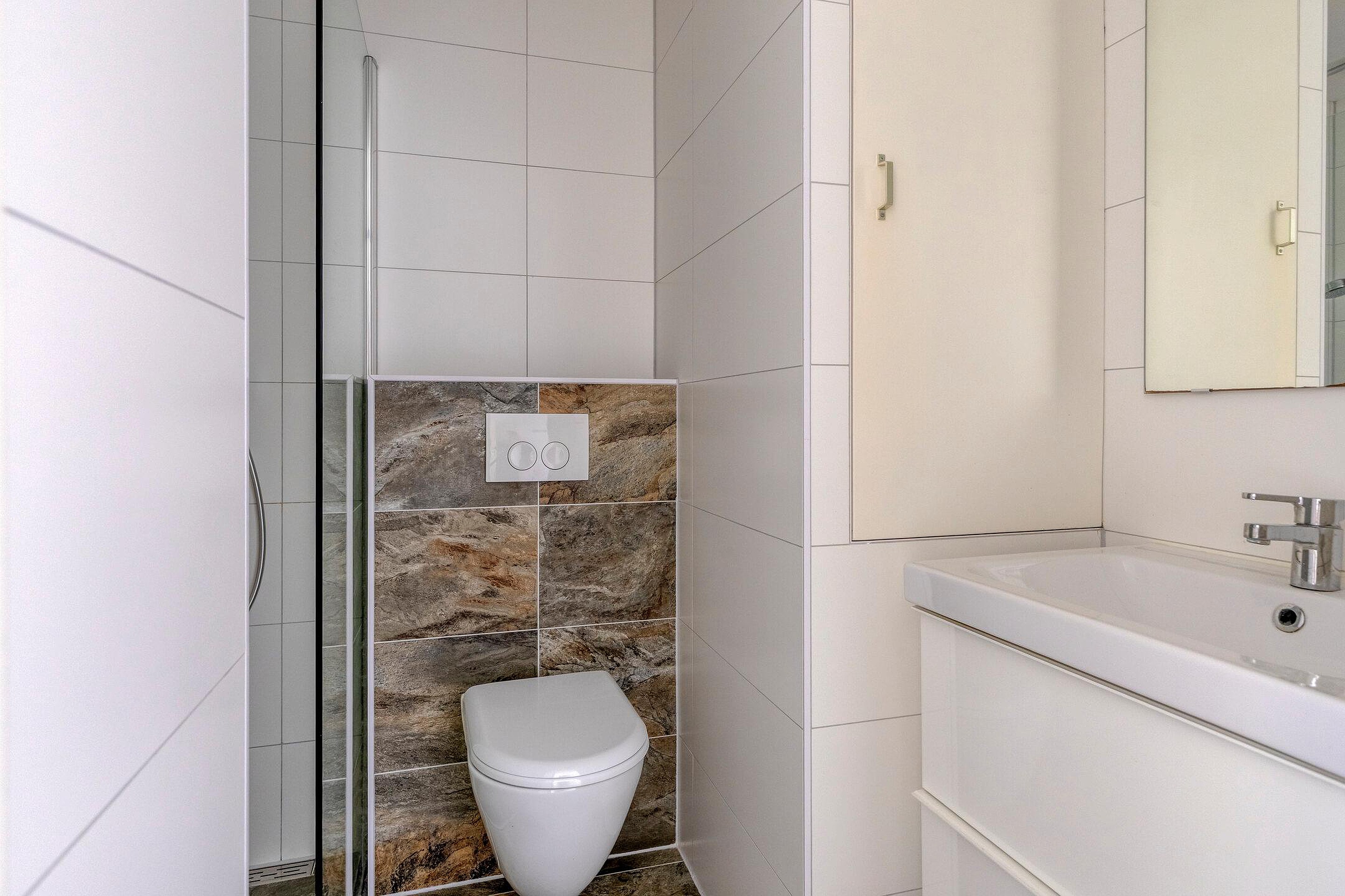 De badkamer is stijlvol afgewerkt met een inloopdouche, wastafelmeubel en toilet.