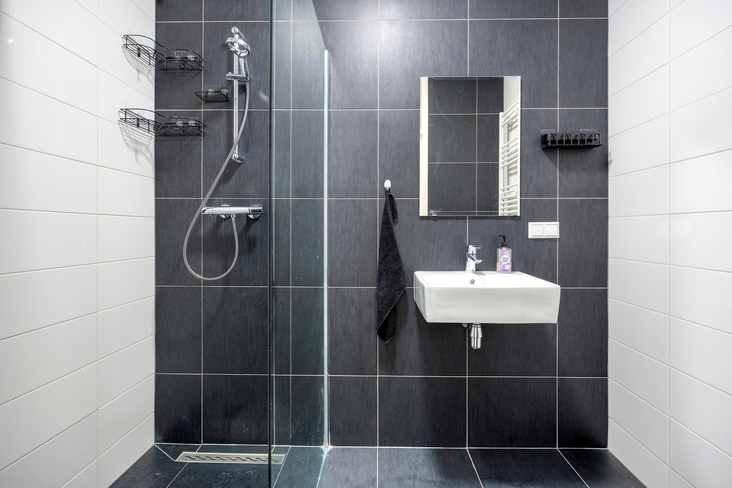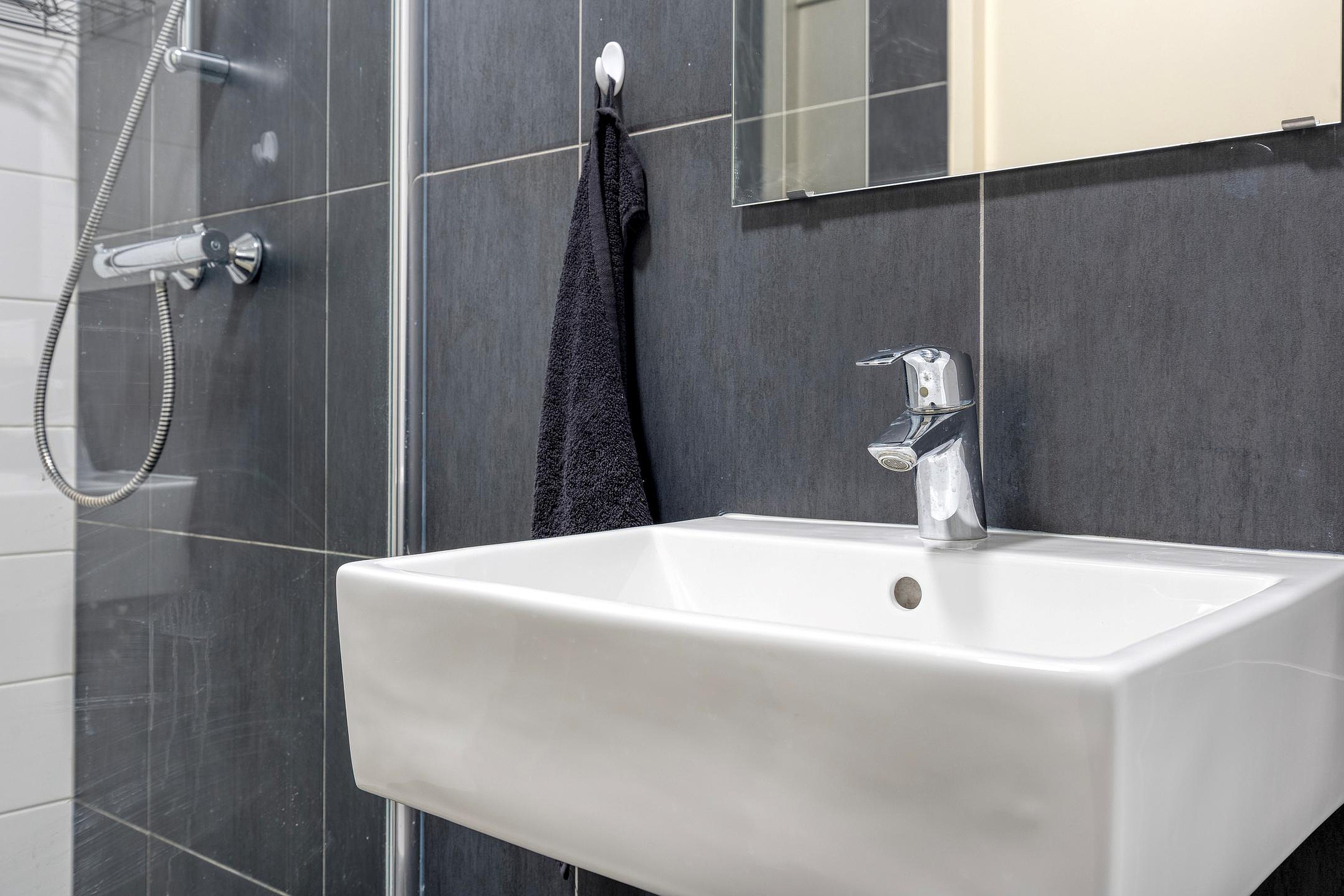 Badkamer in bijpassende stijl met wastafel, ligbad/douche, glazen douchewand, thermostaatkraan, handdoekradiator en wasmachine-aansluiting.