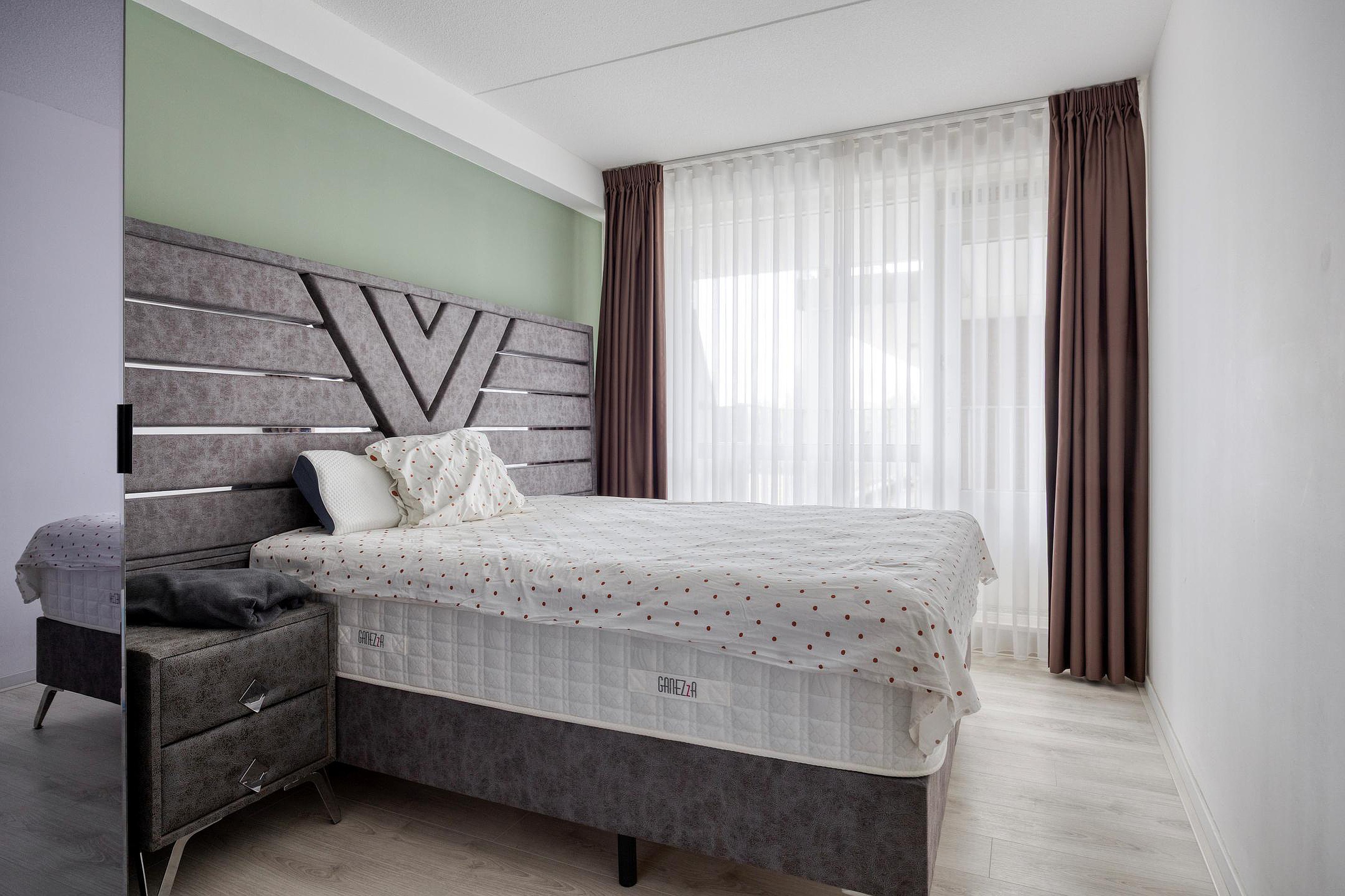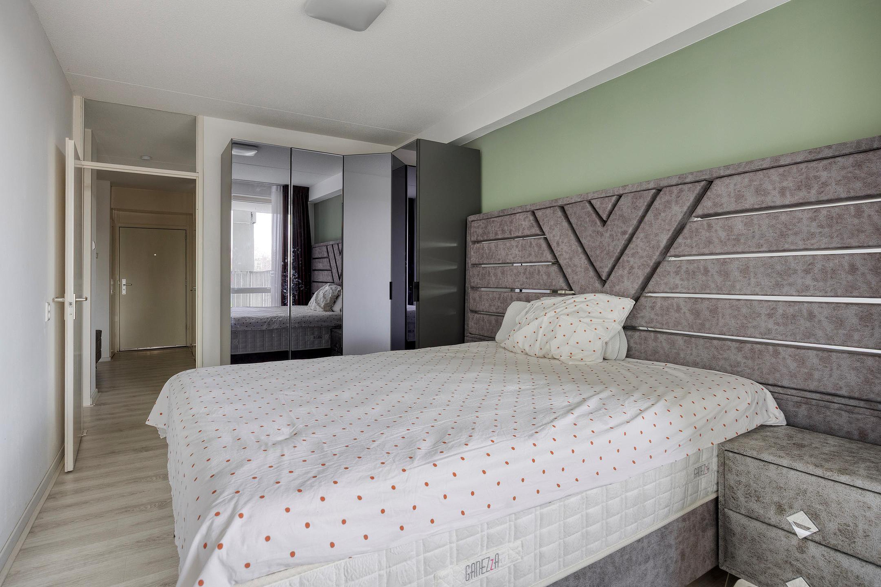 Ruime slaapkamer met laminaatvloer en directe toegang tot het balkon. Zonnig balkon op het noordwesten met vrij uitzicht.