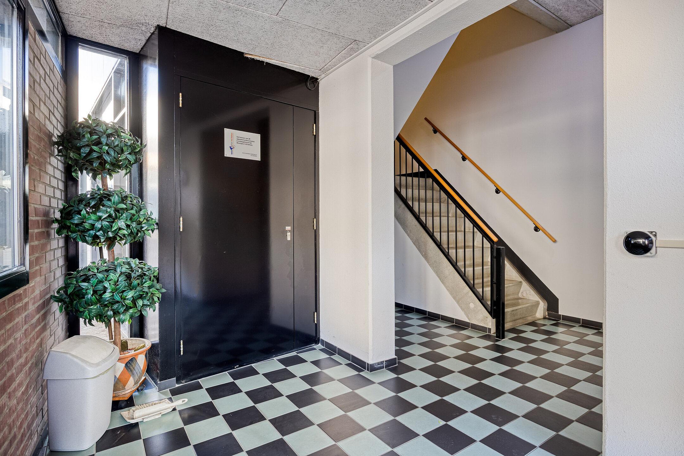 Afgesloten entree met intercom, brievenbussen en liftinstallatie.