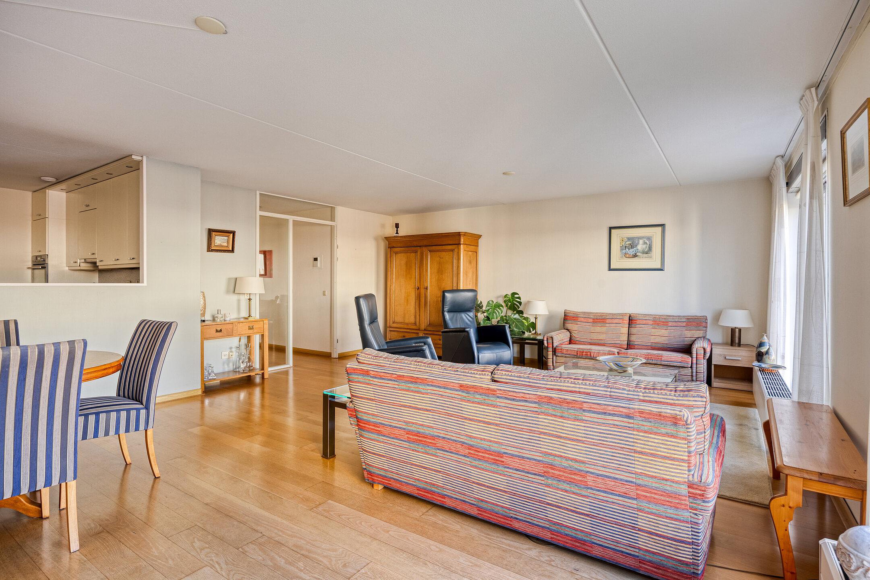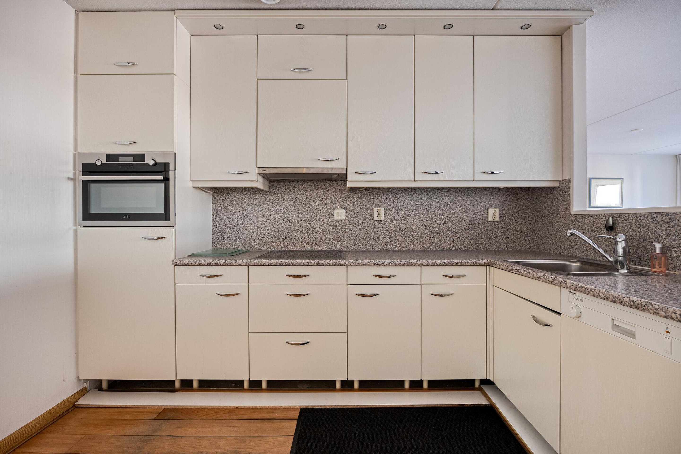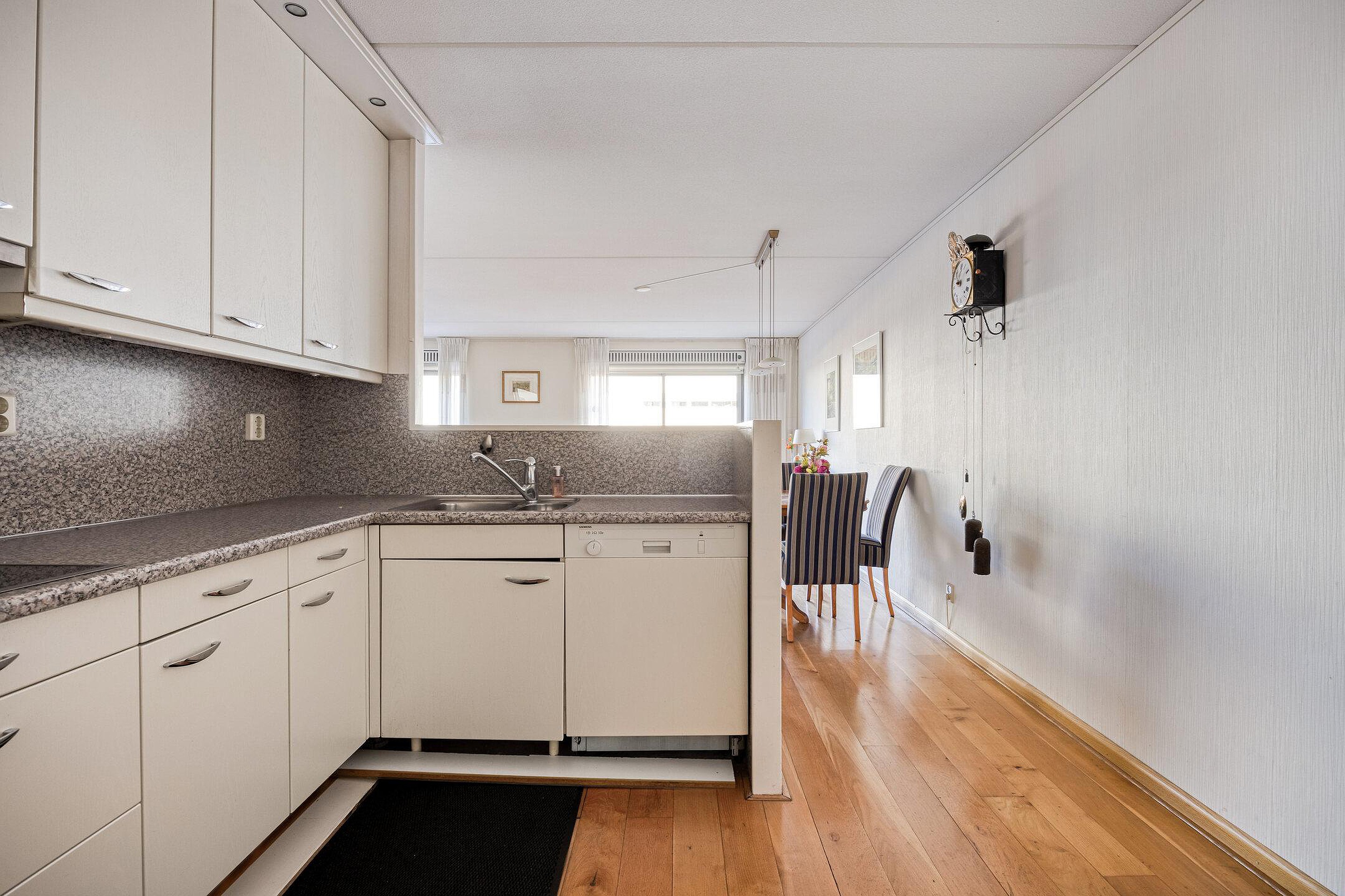 Woonkamer met zicht op het Stadserf en open keuken met in hoek opgestelde keukeninrichting en toegang tot een praktische berging.