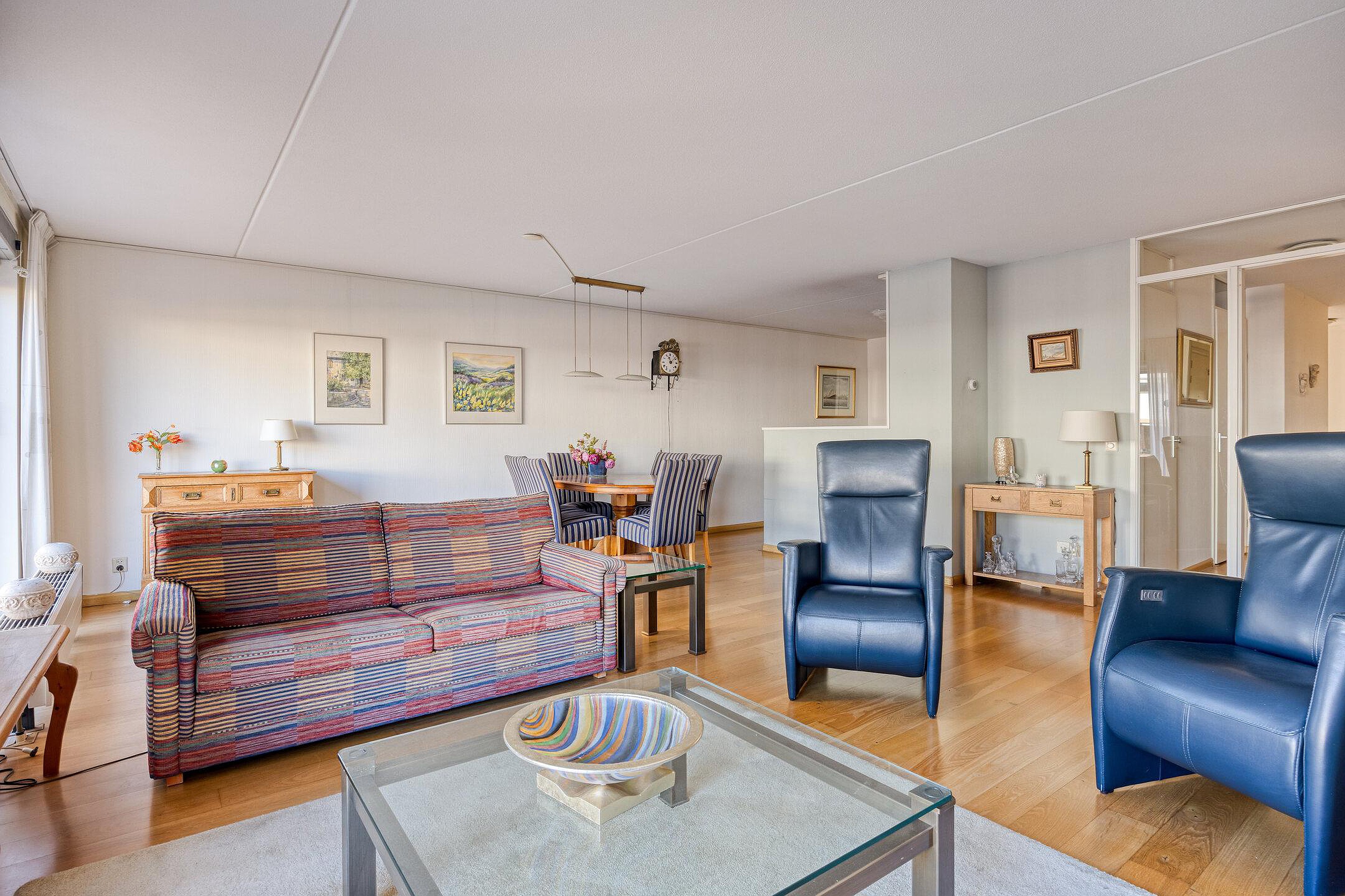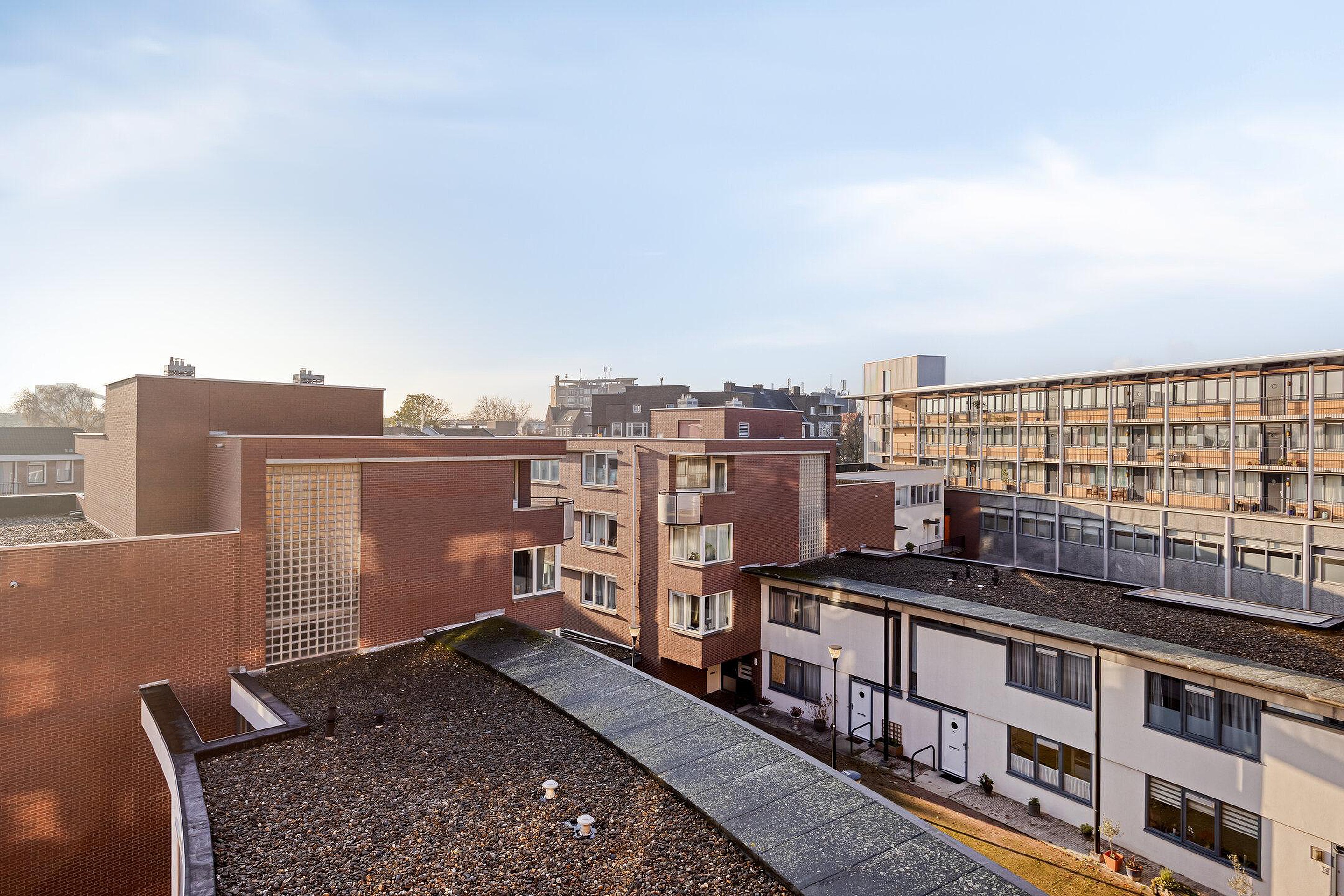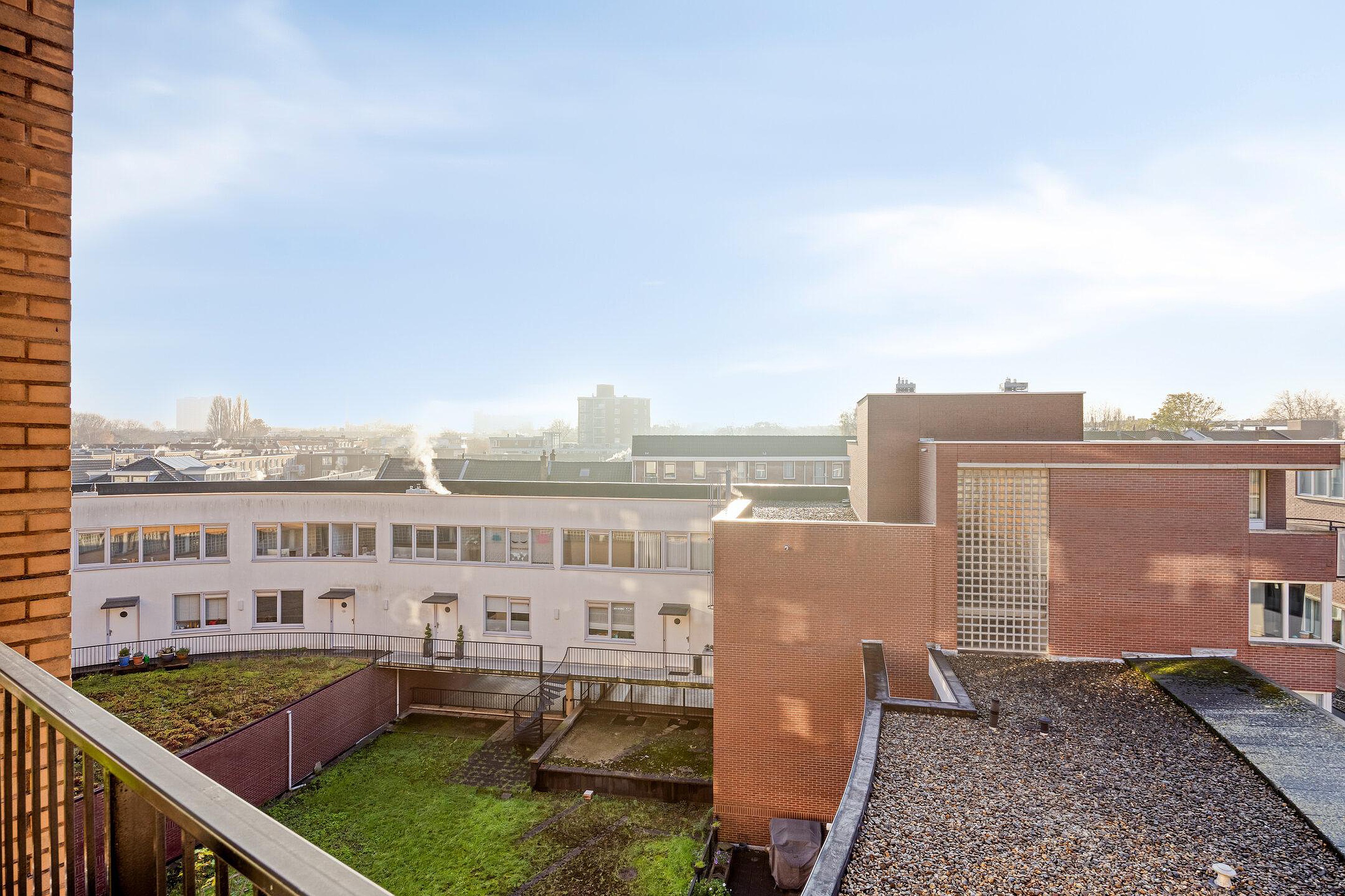 Woonkamer met zicht op het Stadserf en open keuken met in hoek opgestelde keukeninrichting en toegang tot een praktische berging.