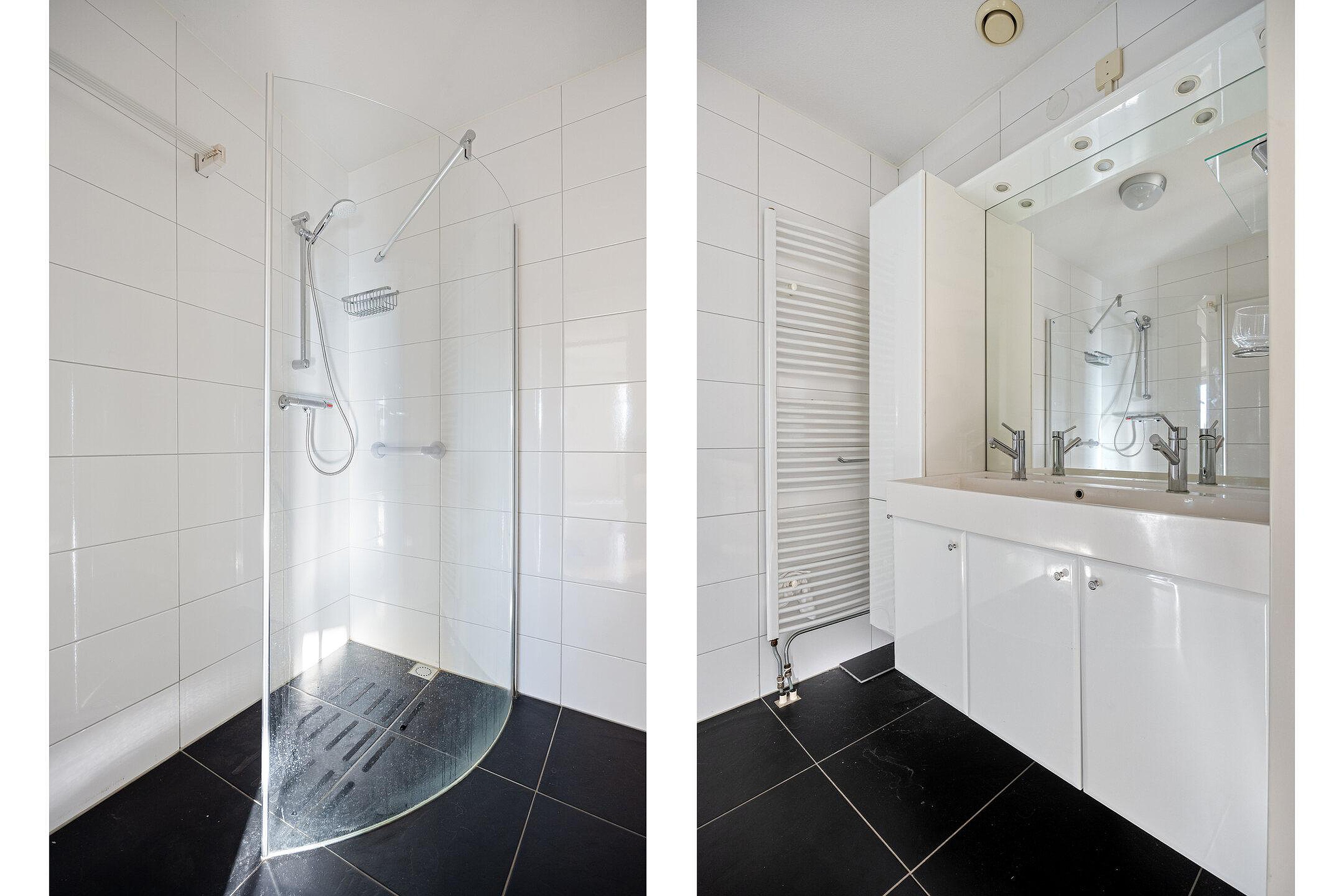 De badkamer is geheel betegeld en voorzien van een inloopdouche en wastafelmeubel.