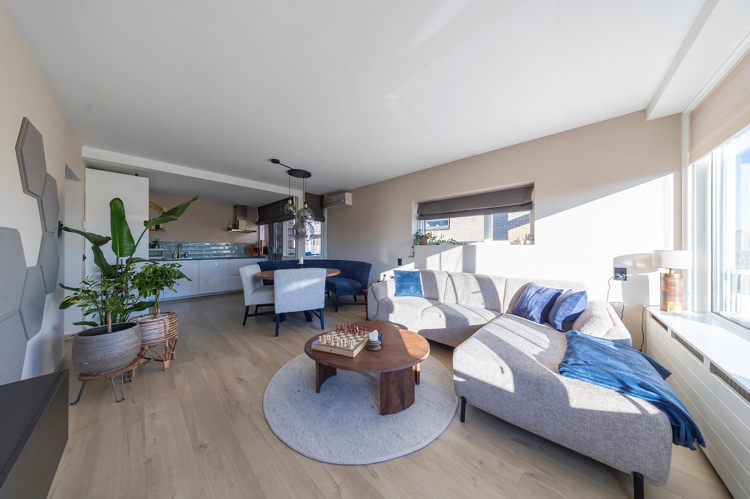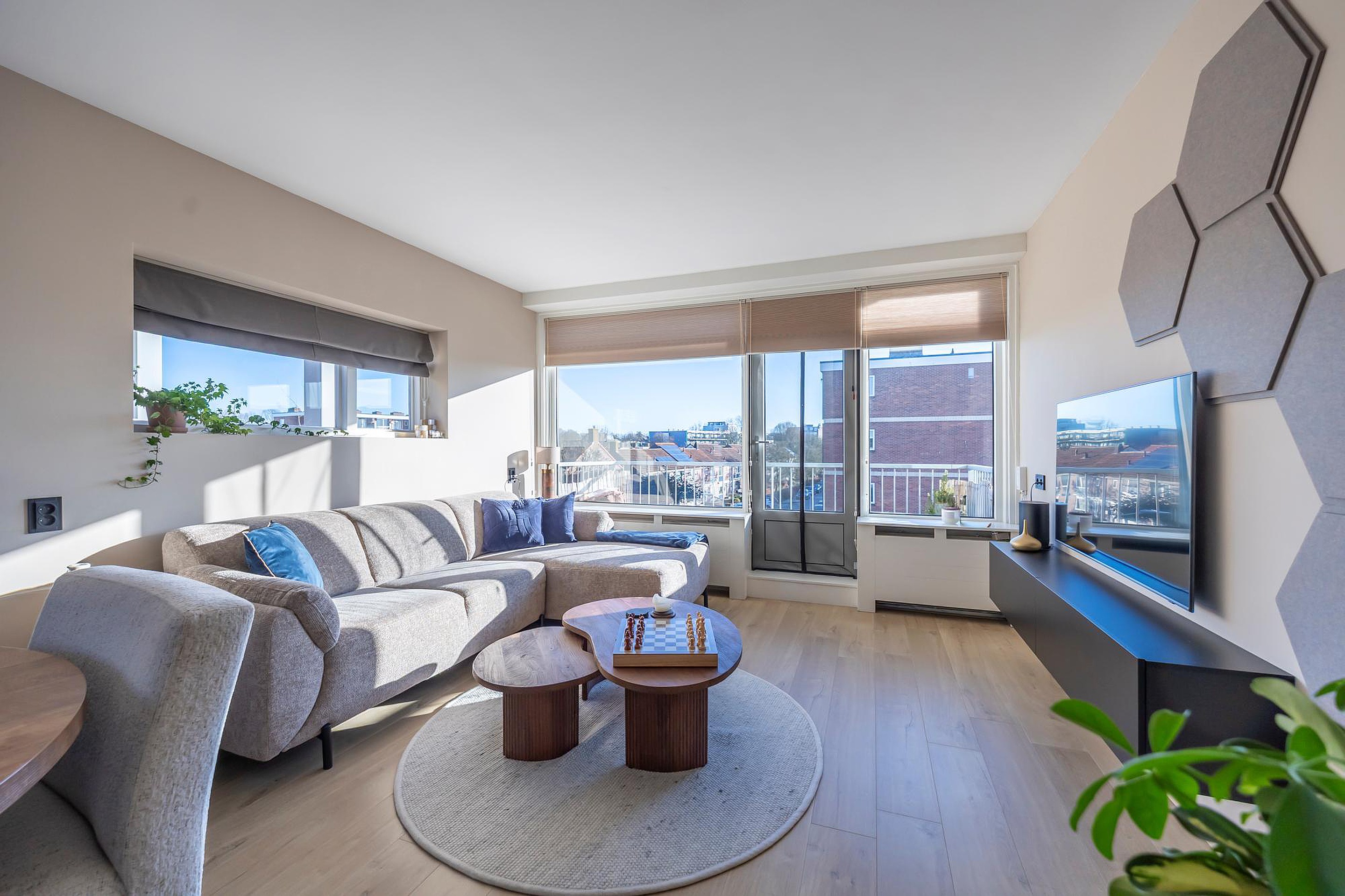 Entree in de hal met garderoberuimte, meterkast en de technische ruimte met bergmogelijkheden, de witgoedaansluitingen en de cv-ketel (2020). De tussenhal staat in directe verbinding met de keurige toiletruimte voorzien van een zwevend toilet, de badkamer, de slaapkamers en de woonkamer. Deze royale woonkamer is uitgerust met airconditioning en profiteert van veel licht dankzij de grote raampartijen en de zuidelijke ligging. Het zitgedeelte ligt bij het zonnige, zuidgerichte balkon (ca. 7 m2) met vlondervloer. De moderne open keuken (2018) in L-opstelling is compleet uitgerust met een vaatwasser, een keramische kookplaat met rvs-afzuigkap, een koelkast, een vriezer en een combi-oven. Hier is ruimte voor een eethoek en vindt de toegang plaats tot het tweede (inpandige) balkon. Beide slaapkamers bevinden zich aan de straatzijde en zijn voorzien van kunststof kozijnen met dubbele beglazing. De keurige en moderne badkamer (eveneens geplaatst in 2018) is uitgerust met een inloopdouche met regendouche en thermostaatkraan, een wastafel met bijpassend meubel en een designradiator.