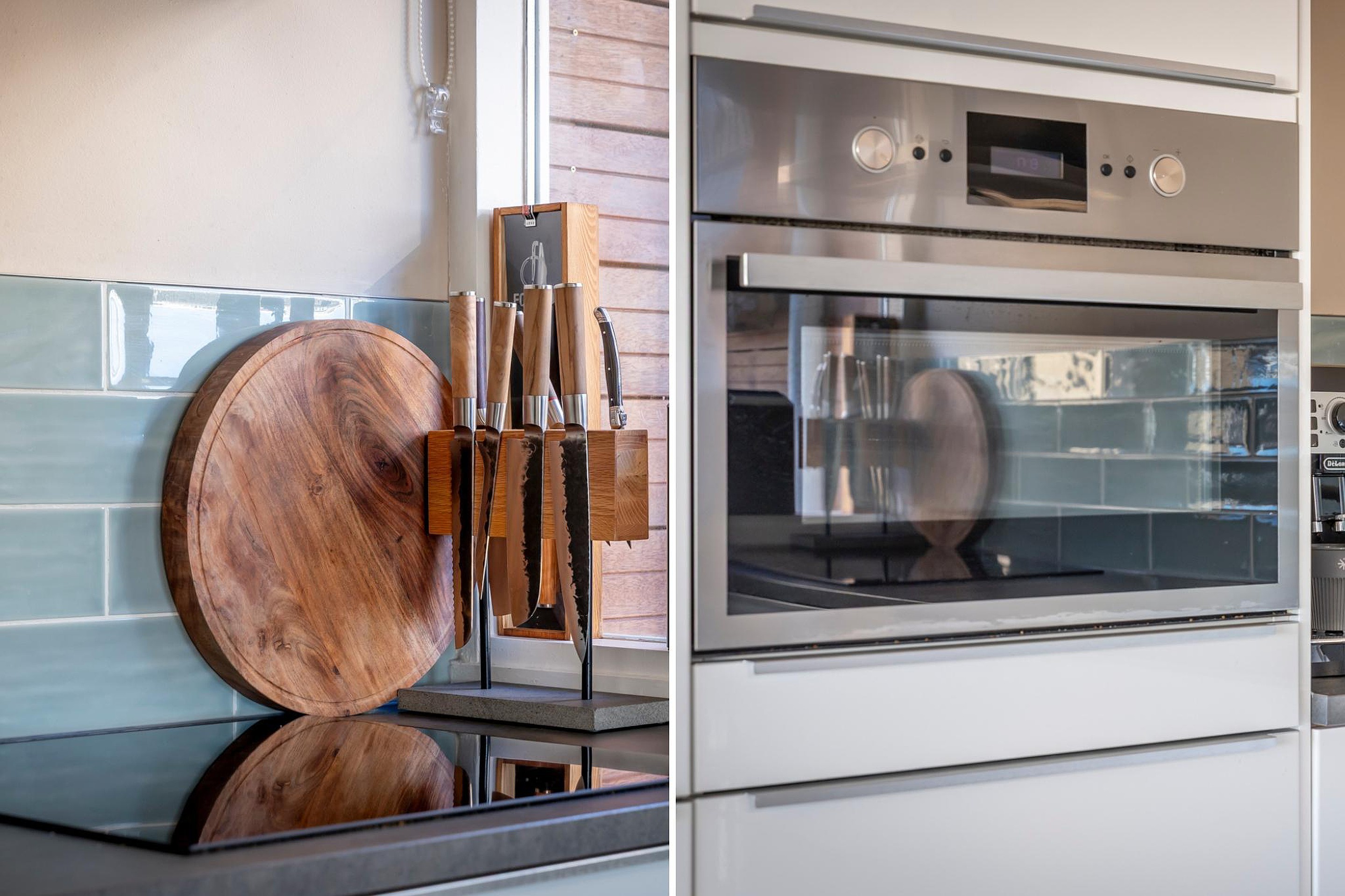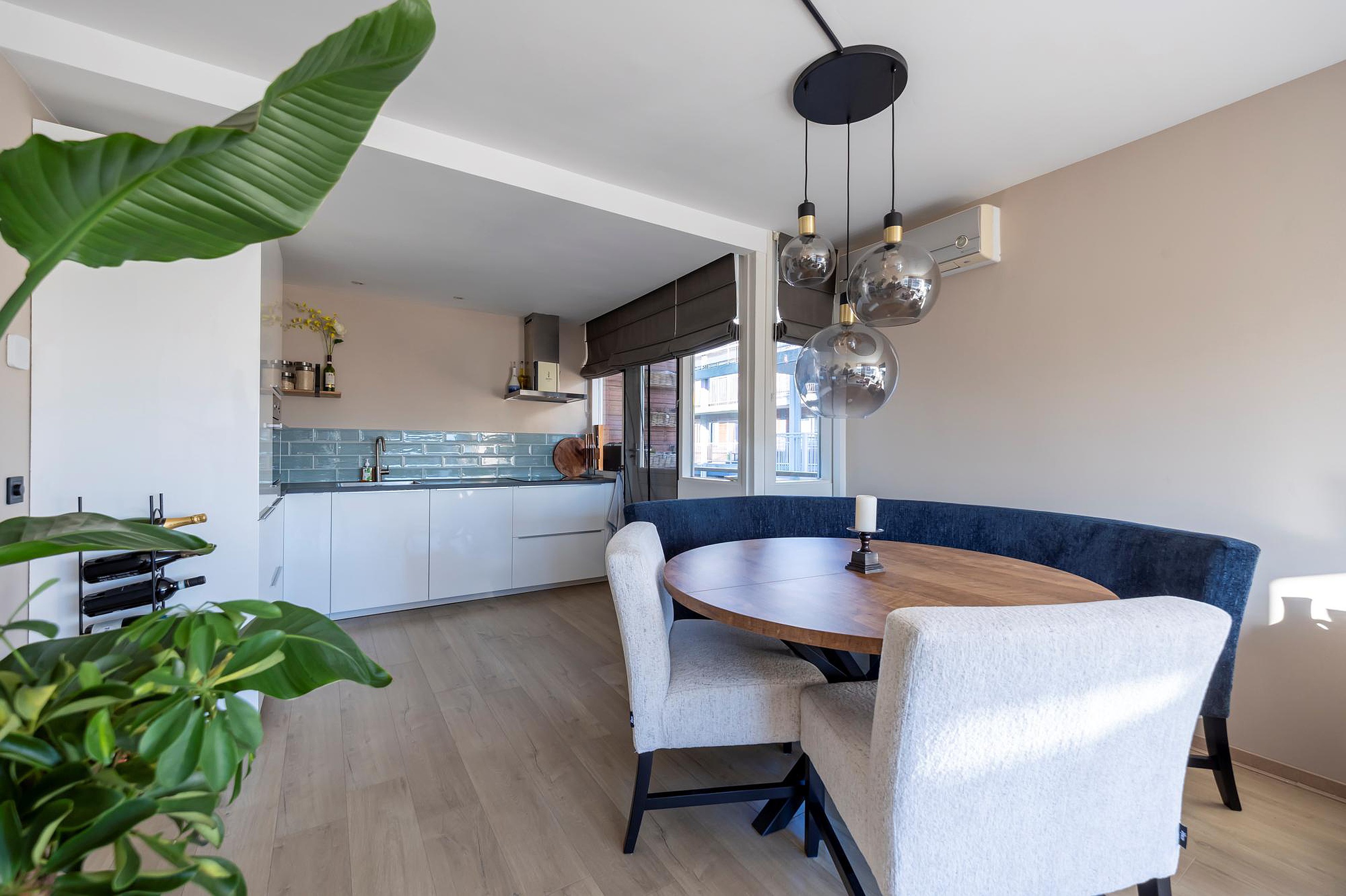 De royale, door licht overgoten woonkamer is uitgerust met airconditioning en vormt samen met de open keuken een fijne en uitnodigende leefruimte. Hier vind je tevens twee balkons – oostgericht en zuidgericht – zodat je op elk moment van de dag kunt genieten van zon óf juist de schaduw.