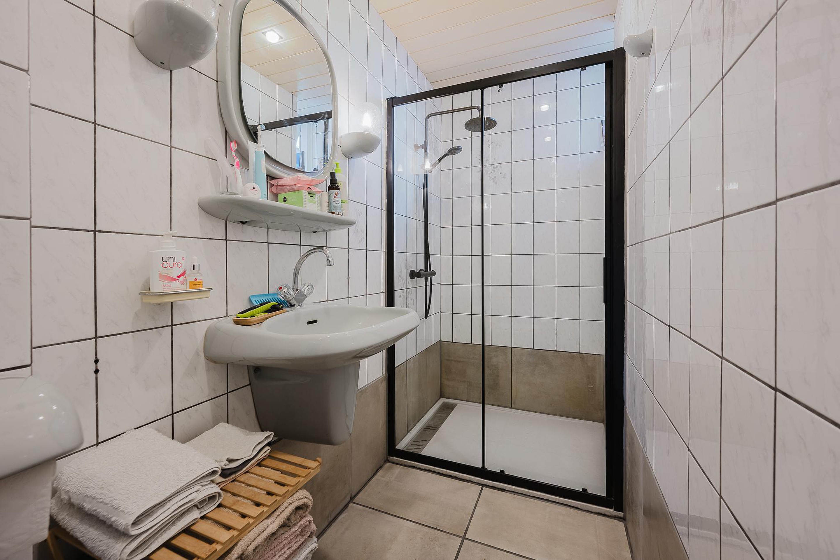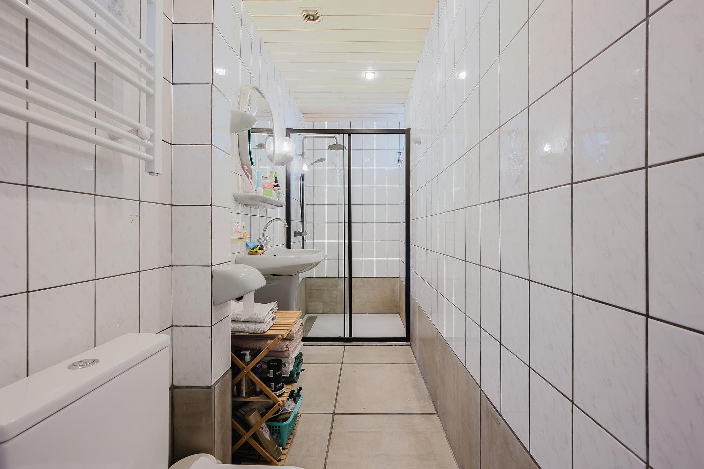 De badkamer is volledig betegeld en is voorzien van een ruime douchecabine, een wastafel en een staand toilet.
