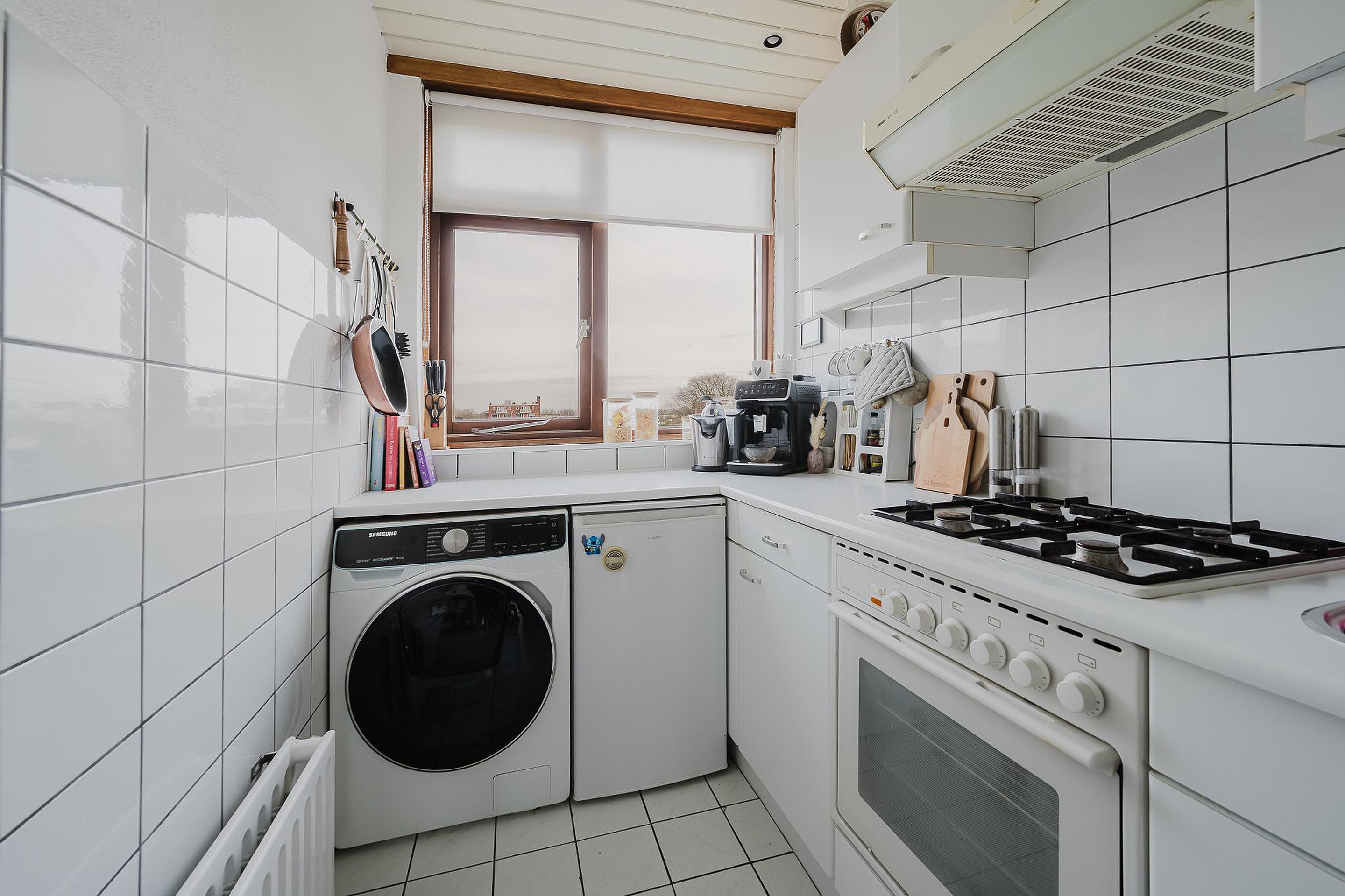 De keuken is voorzien van alle gemakken: een 4-zone gaskookplaat, een afzuigkap, koelkast en een oven. Tevens is in de keuken de aansluiting voor de wasmachine en de cv-installatie gesitueerd.