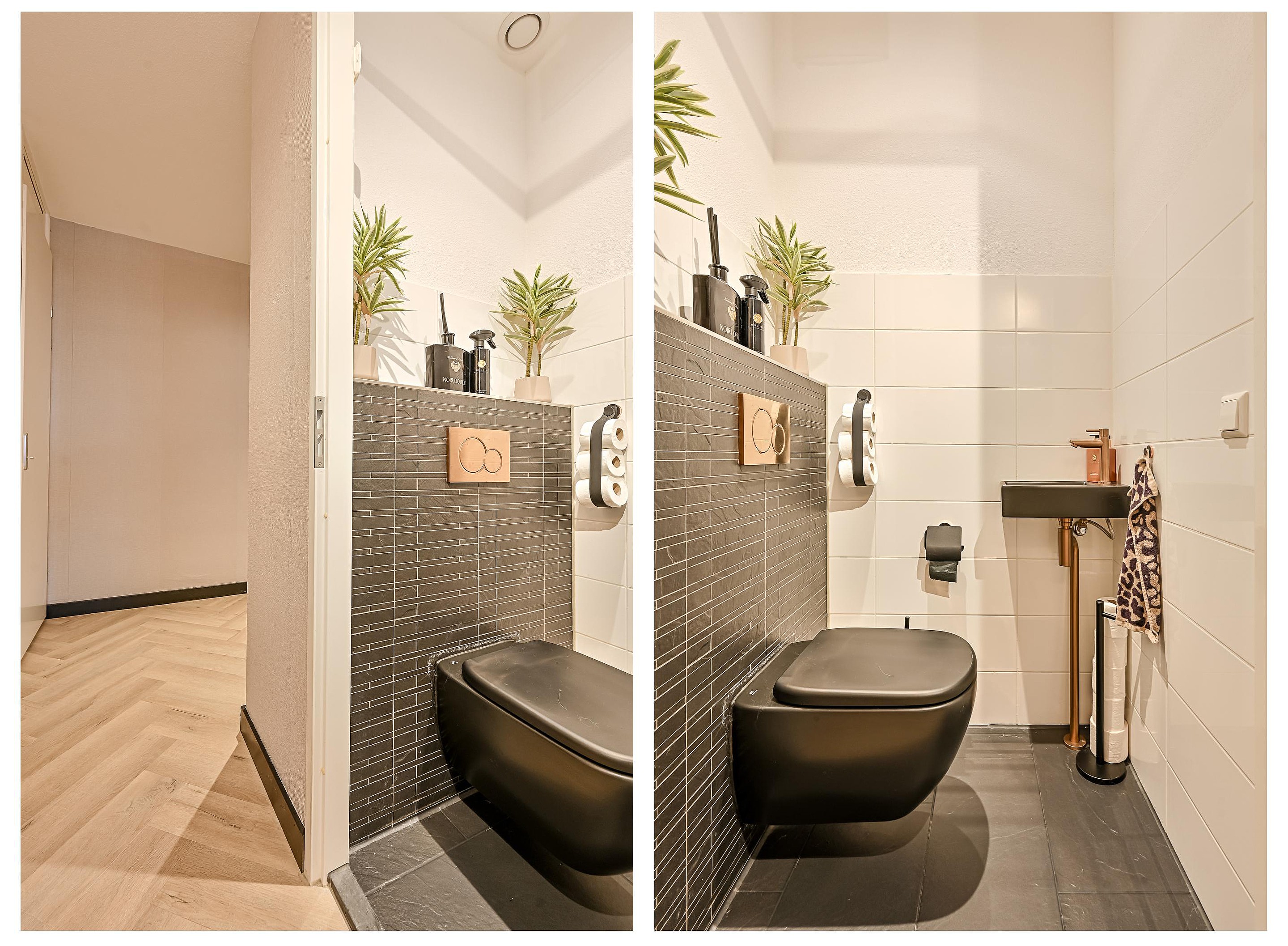 Via de hal bereik je het separate toilet, dat deels is betegeld en modern is uitgevoerd. De ruimte is voorzien van een hangend closet en een fonteintje.