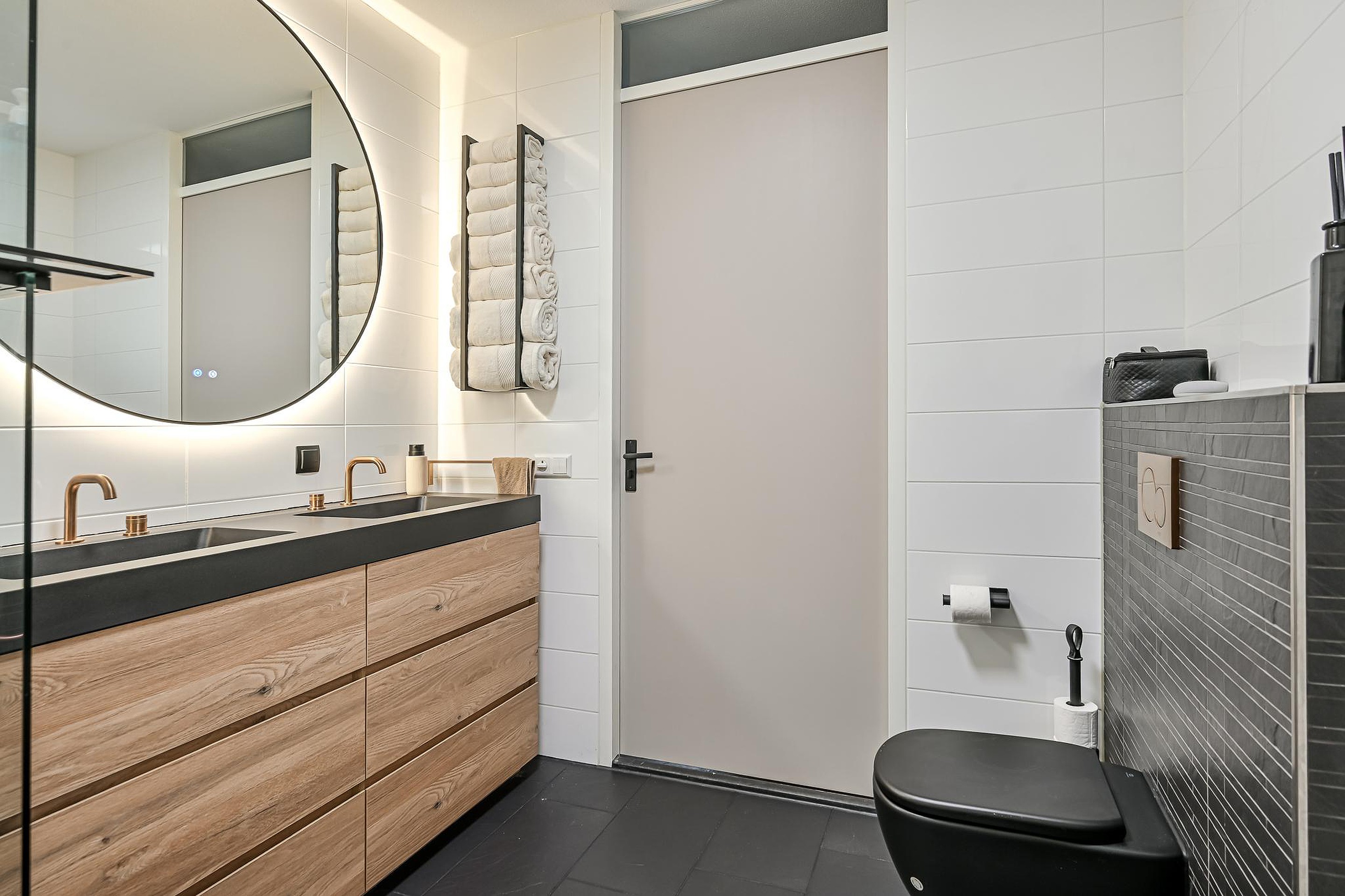 Aangrenzend aan het separate toilet bevindt zich de badkamer. Deze moderne badkamer is volledig betegeld en stijlvol afgewerkt. De ruimte is voorzien van een ruime inloopdouche, een dubbele wastafel met meubel en een hangend toilet.