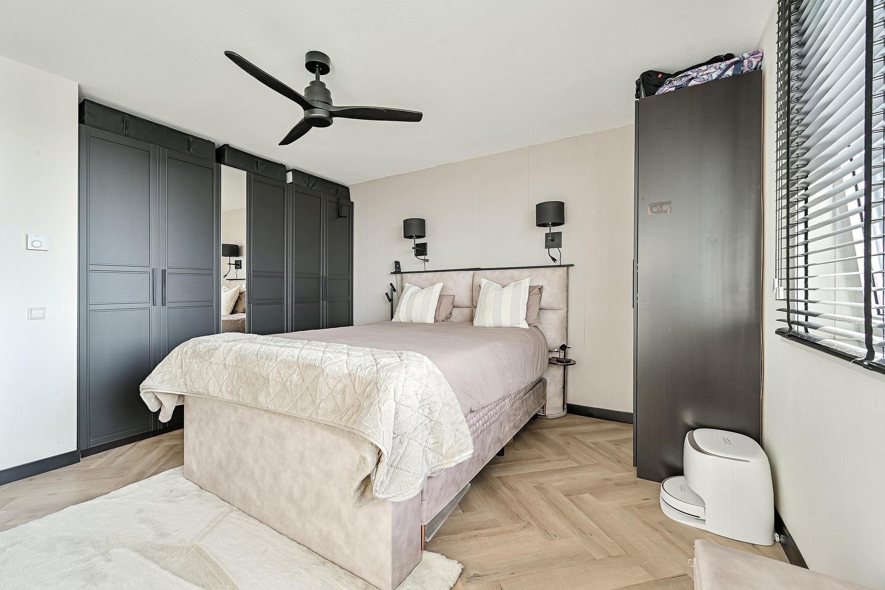 Na de badkamer bereik je de twee slaapkamers. De master bedroom is bijzonder ruim opgezet. Beide slaapkamers zijn afgewerkt met nieuwe, stijlvolle binnendeuren, wat bijdraagt aan de moderne en verzorgde uitstraling van het appartement.