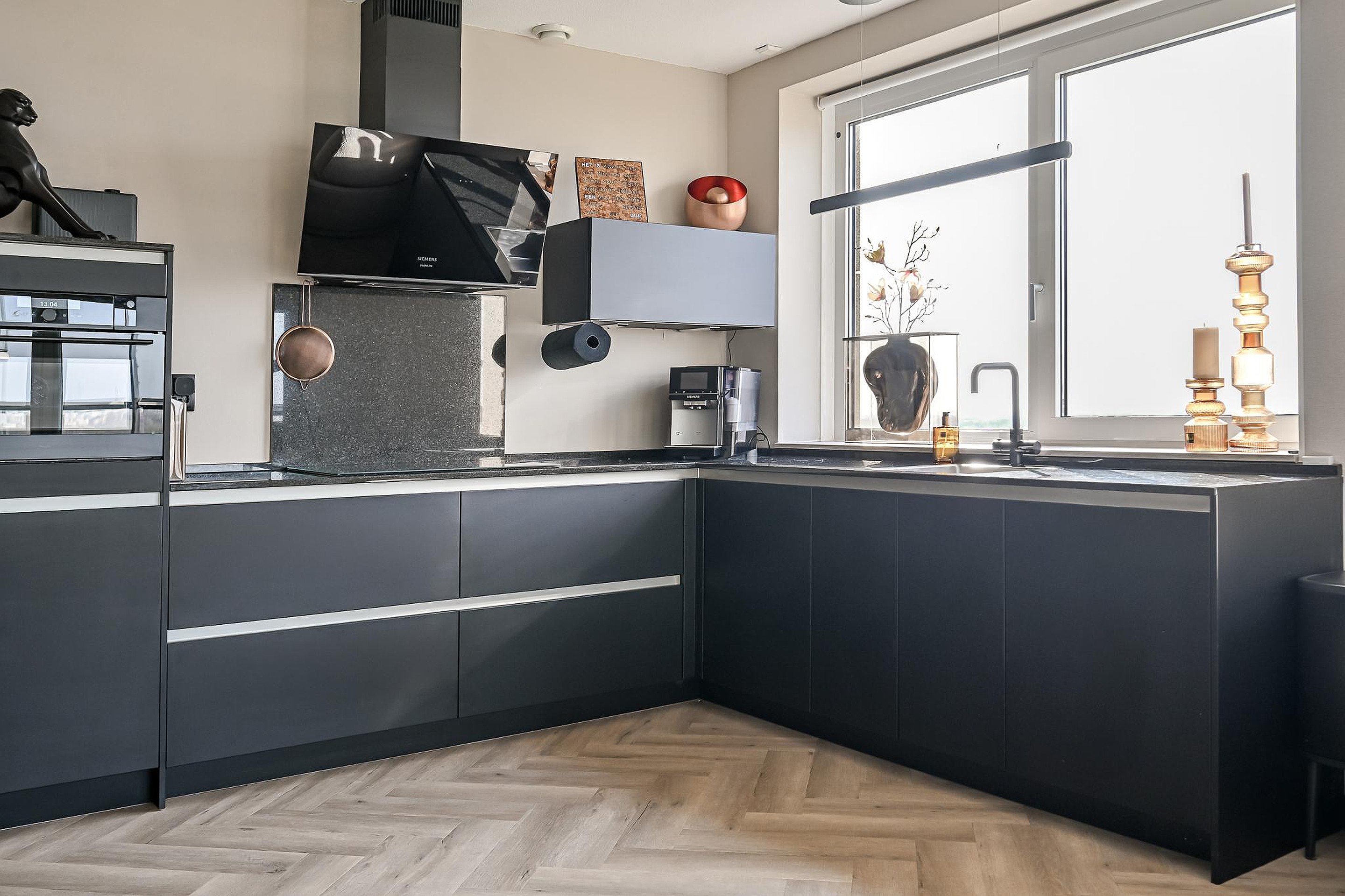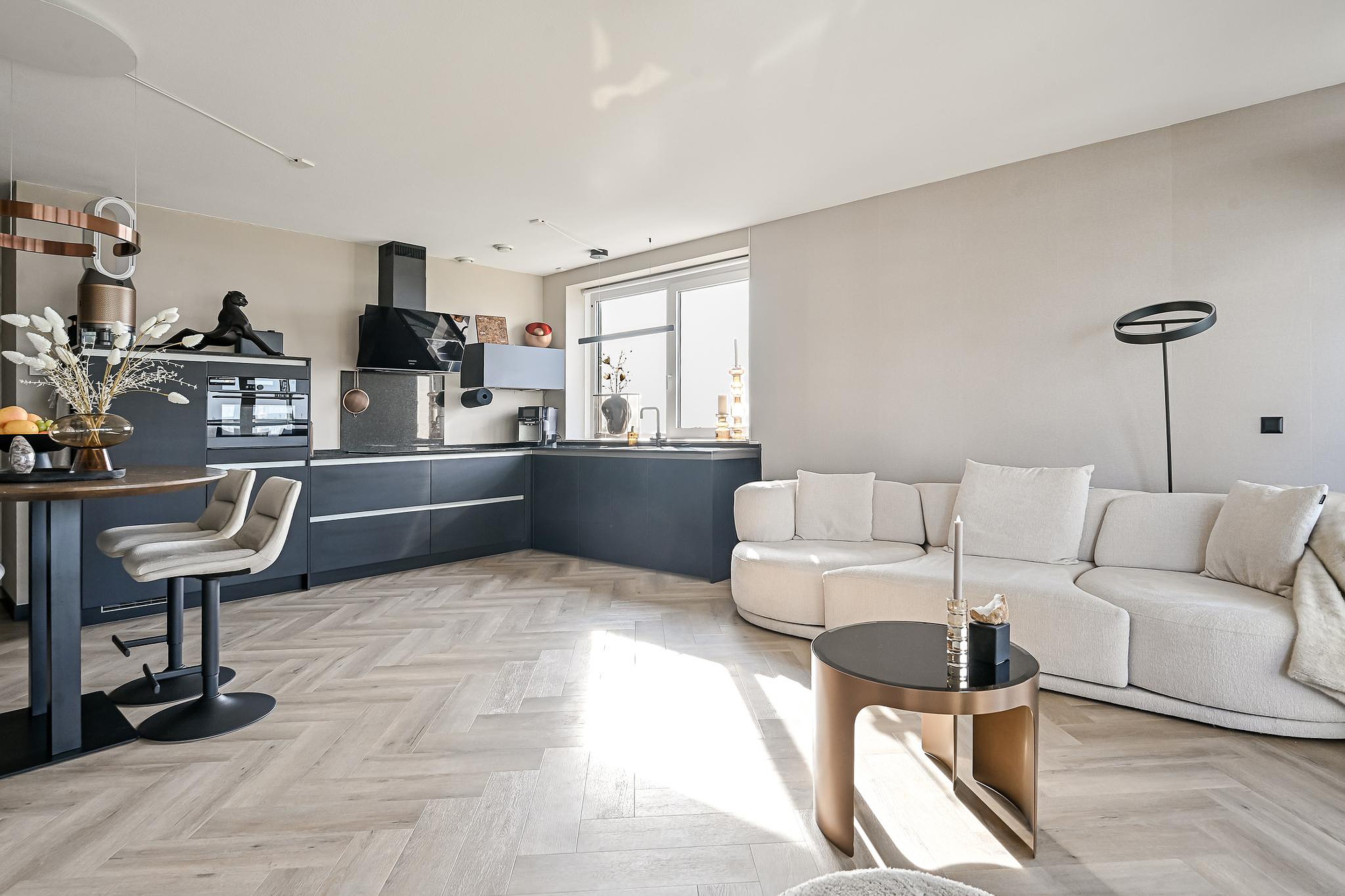 In de woonkamer bevindt zich de tijdloze open keuken, die naadloos aansluit op de leefruimte en is uitgevoerd in een moderne, verzorgde stijl. De keuken is uitgerust met een 5-pits inductiekookplaat, een vaatwasser, een koelkast, een stoomoven en een Celsius kokendwaterkraan.