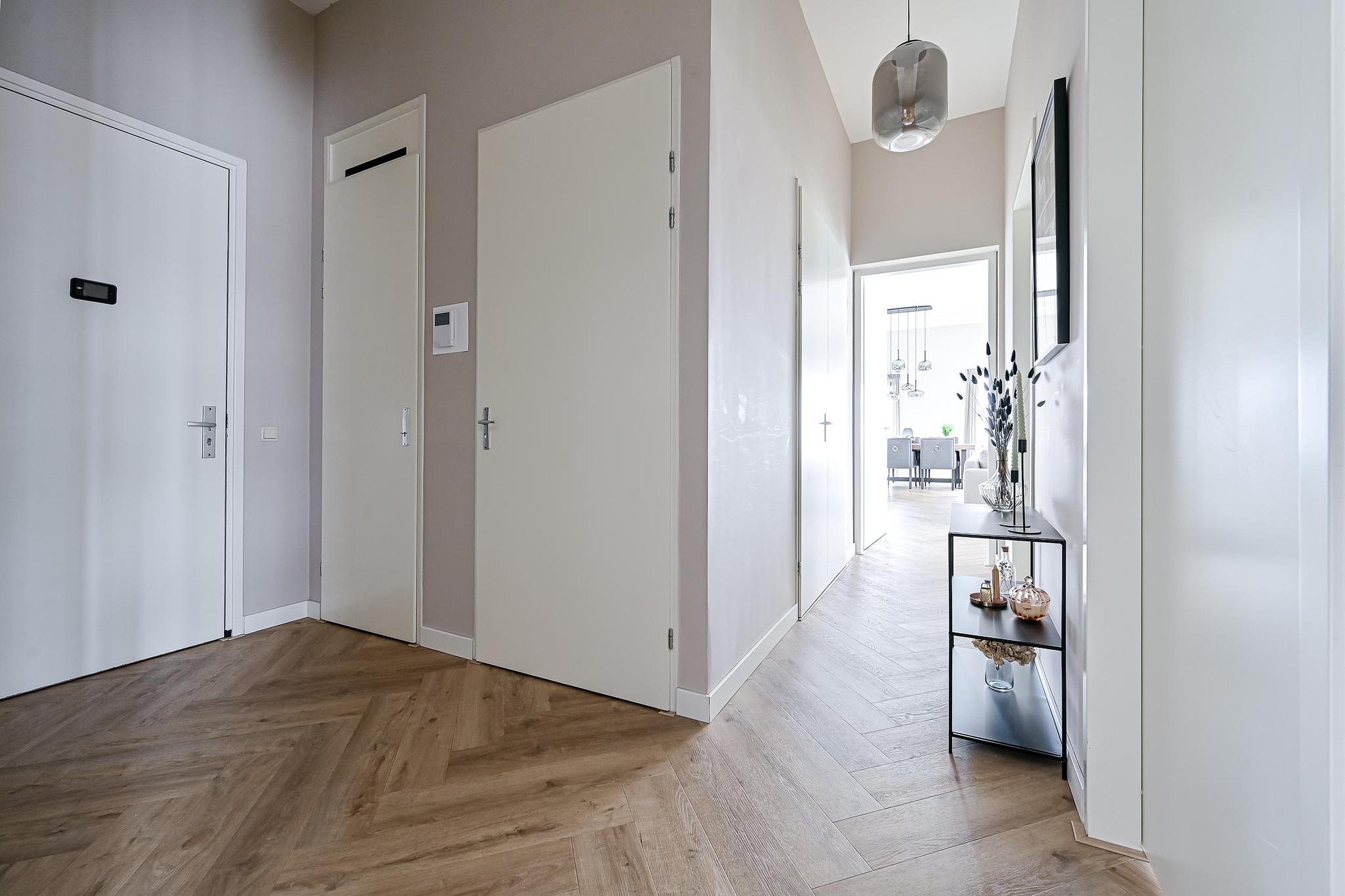 Het appartement is volledig voorzien van een stijlvolle pvc-vloer met vloerverwarming en -koeling. Daarnaast zijn zowel de hal als de woonkamer recent gestuukt.