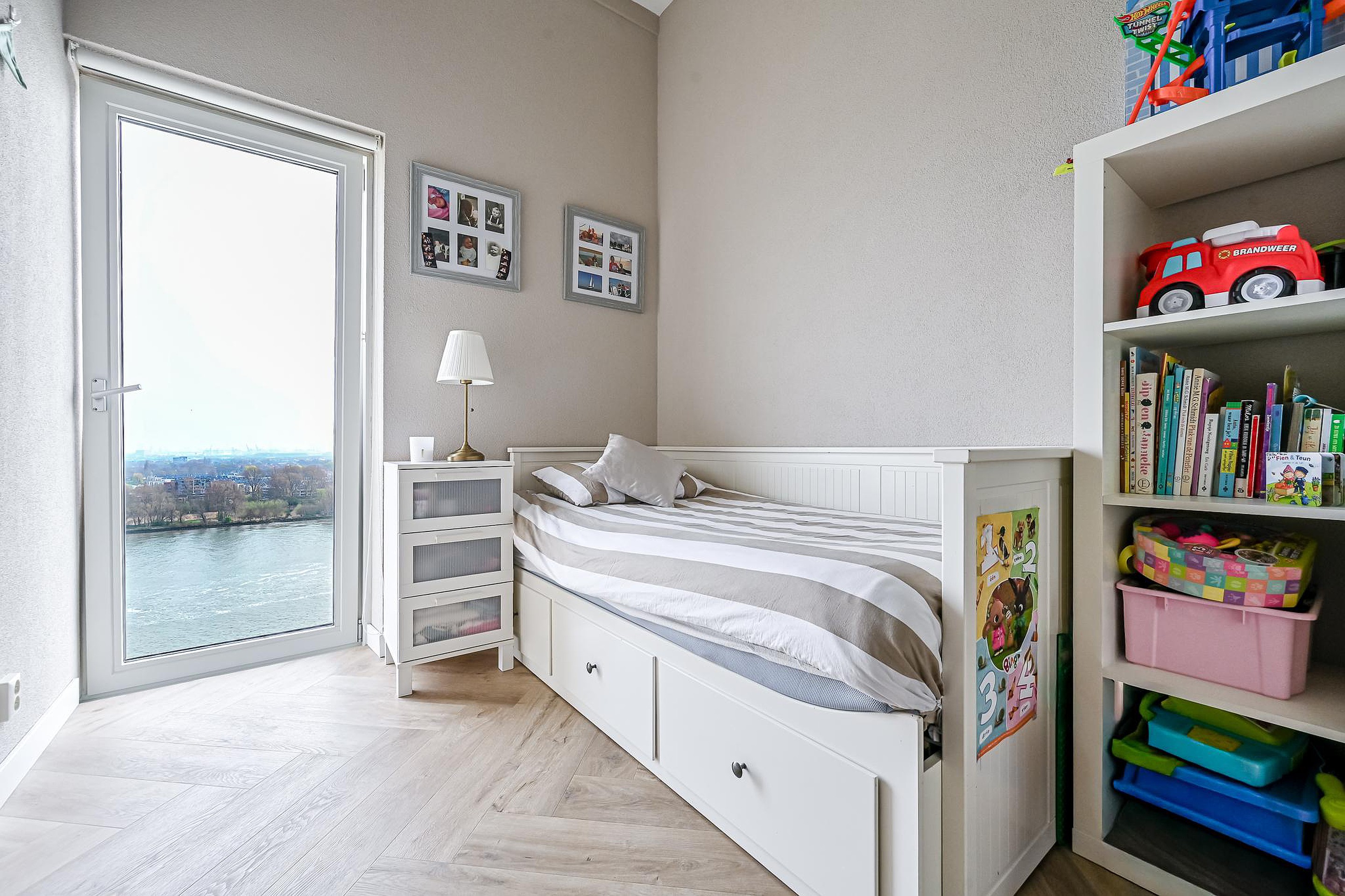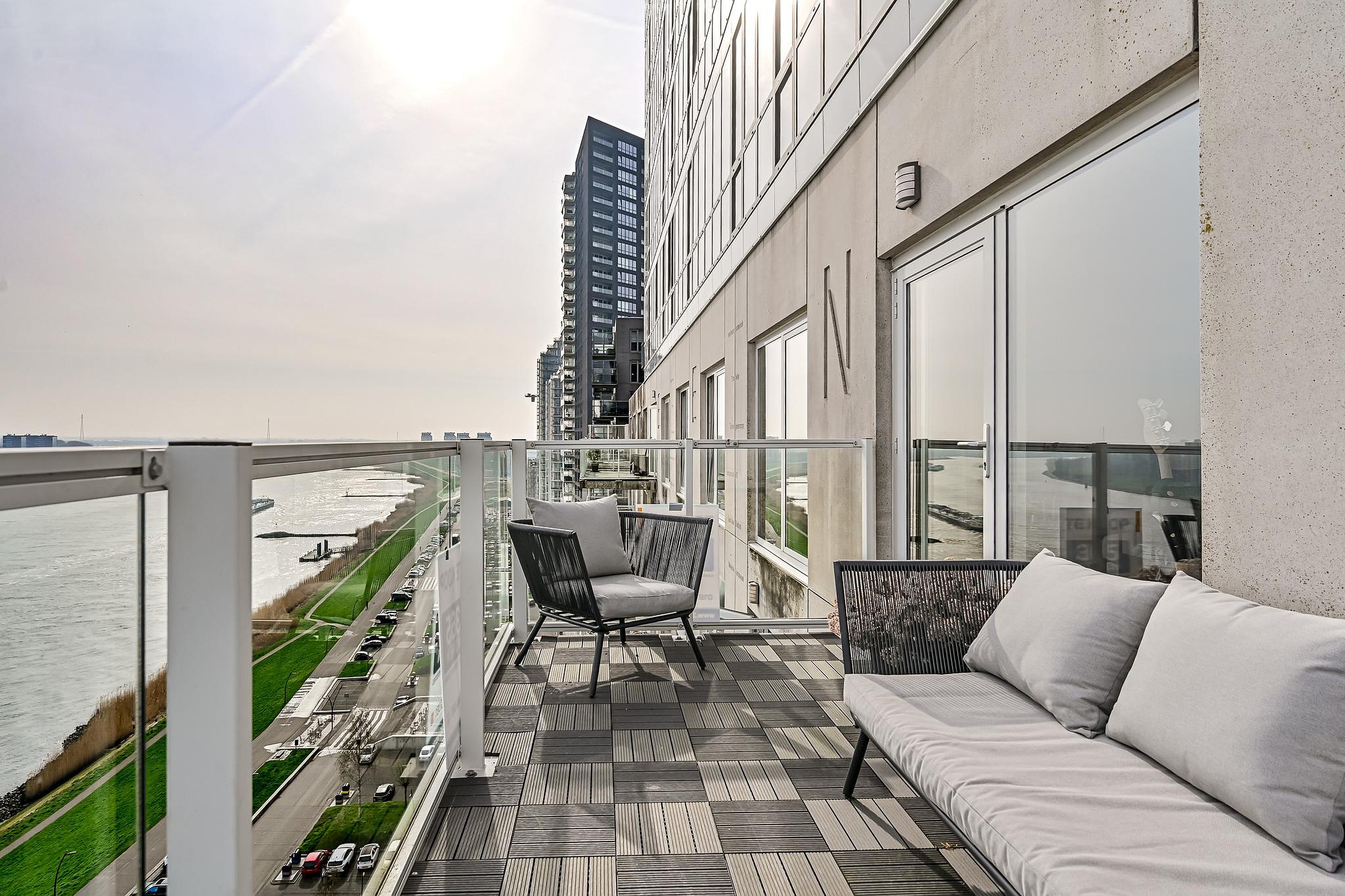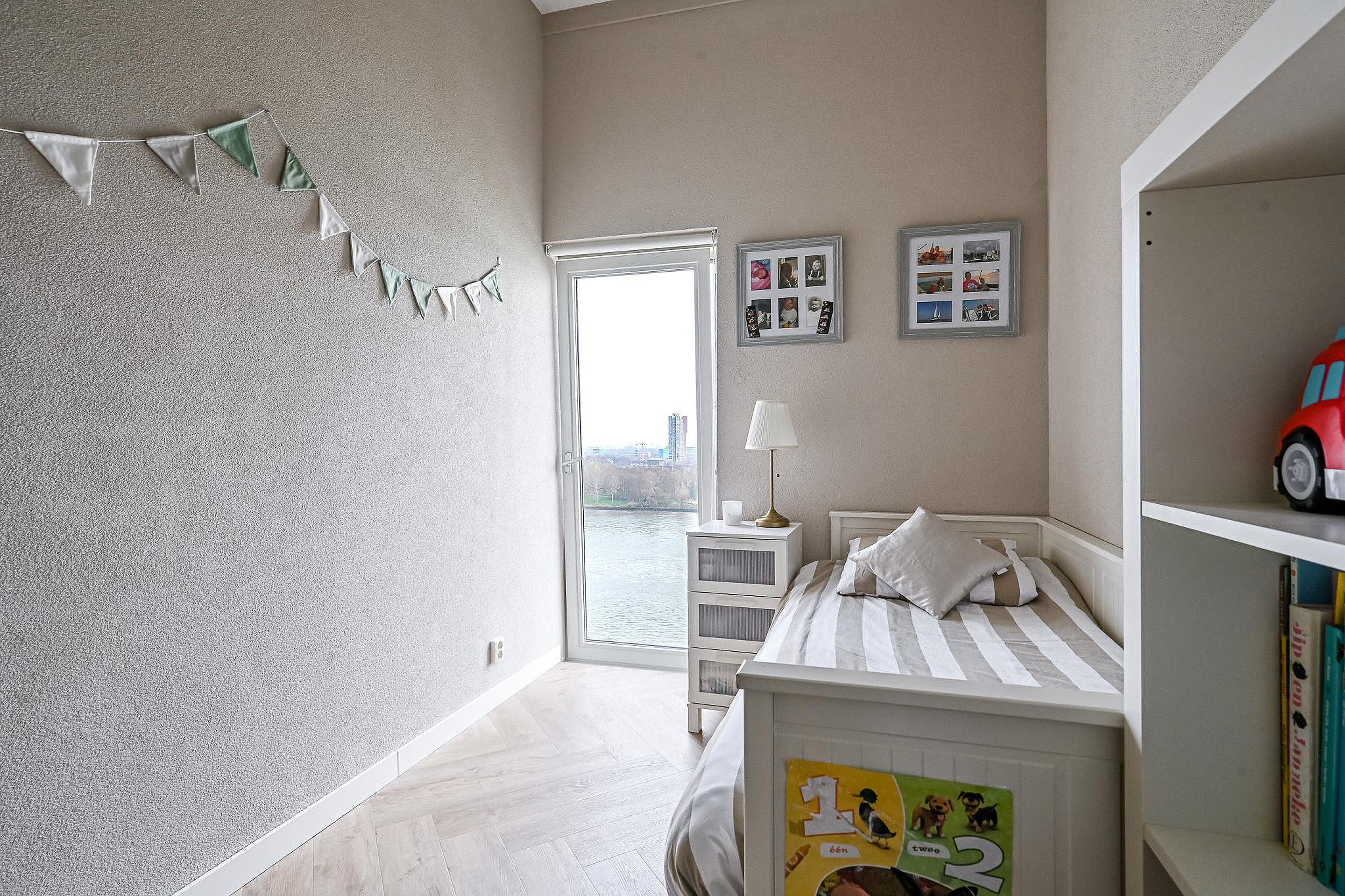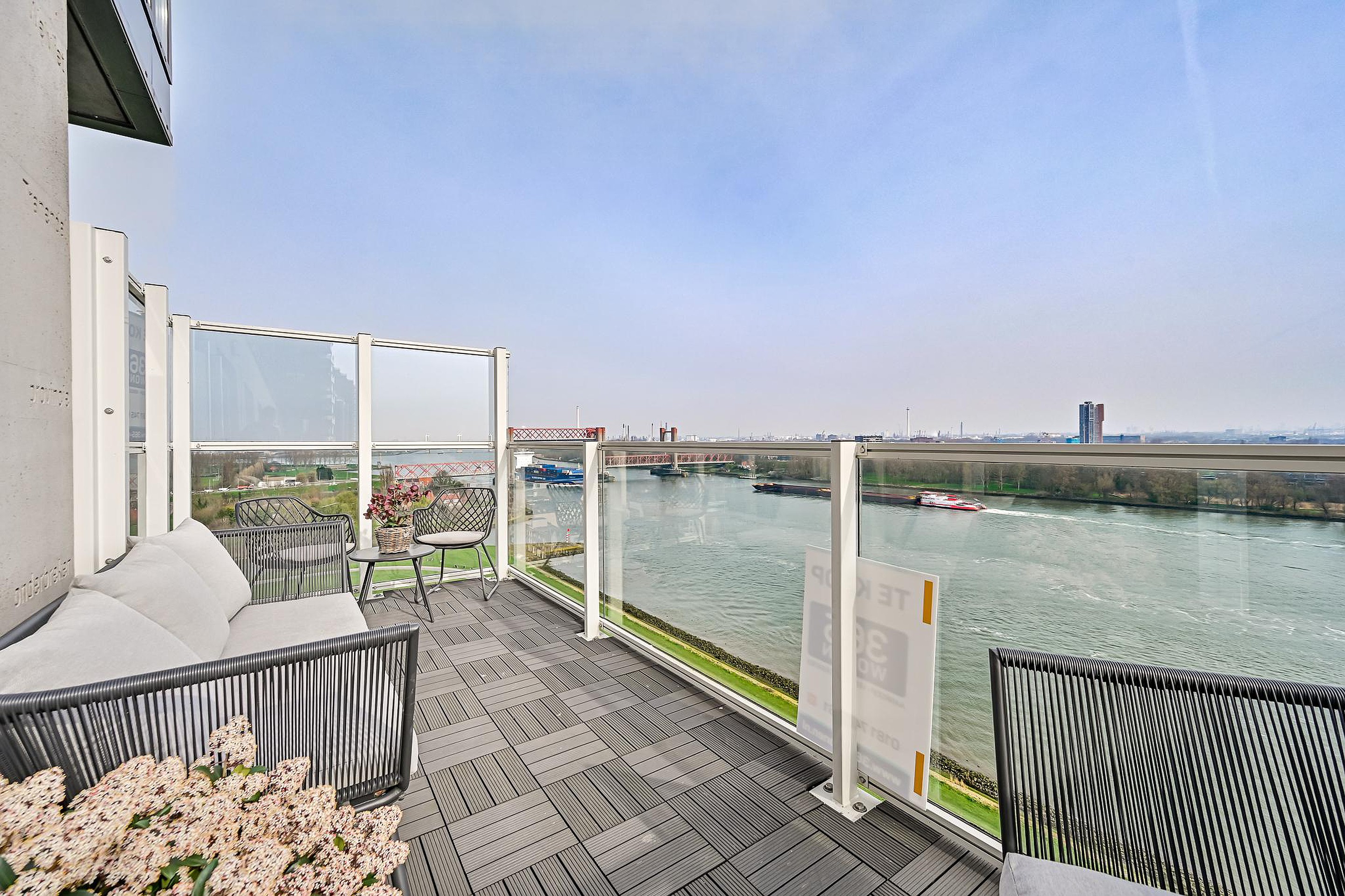 Gelegen op de 13e verdieping geniet je hier dagelijks van een spectaculair en vrij uitzicht over de Maas, met zelfs zicht op de iconische skyline van Rotterdam.