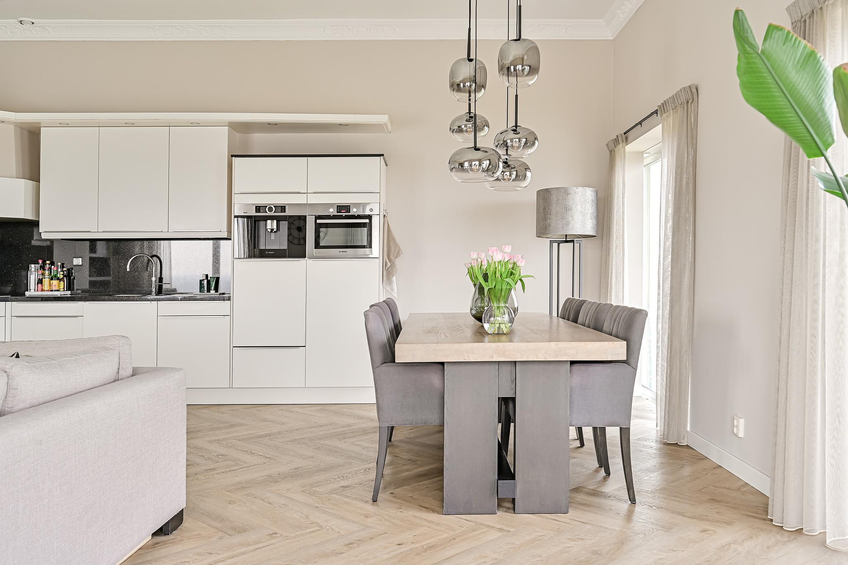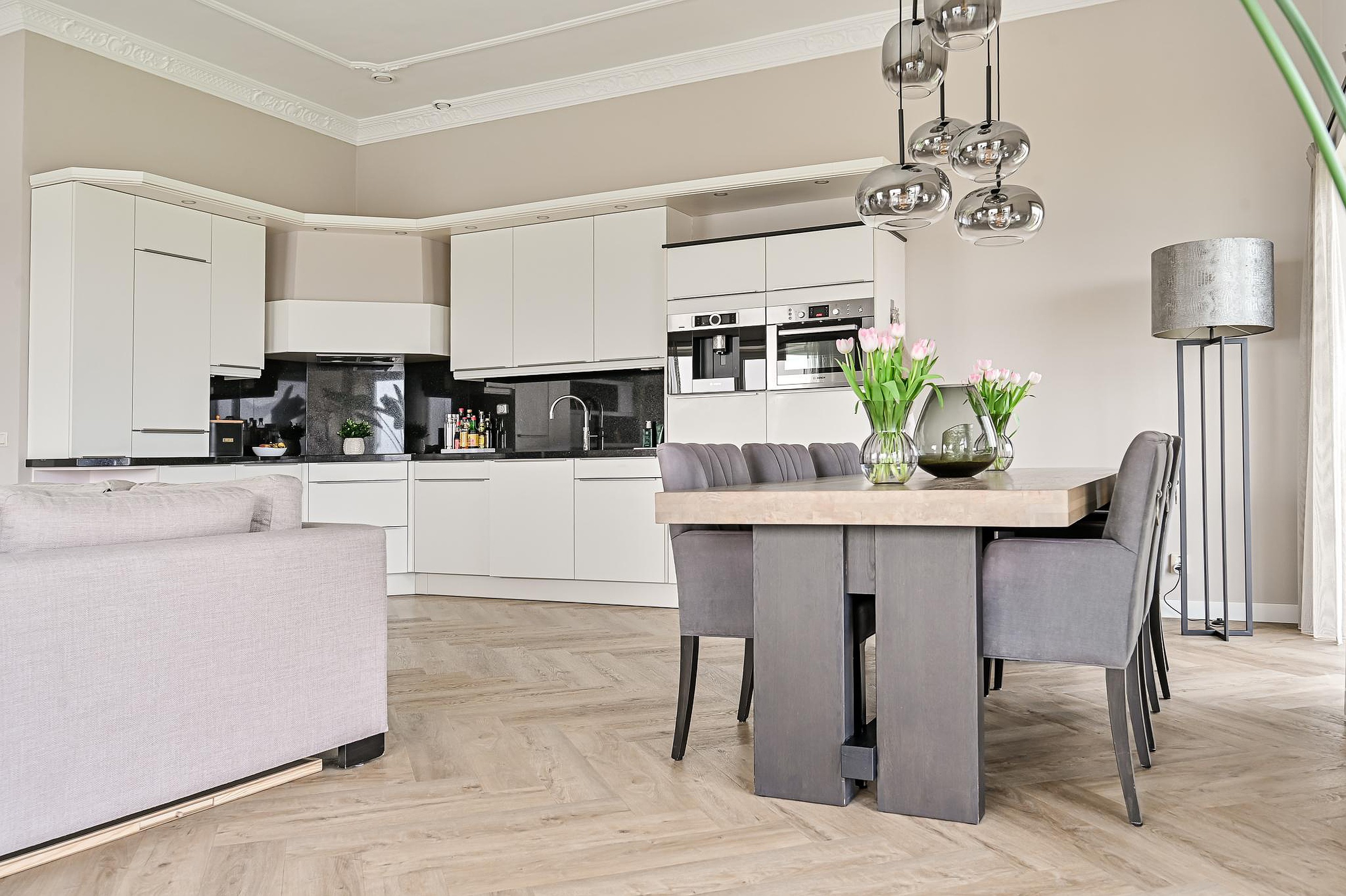 Bij binnenkomst in het appartement vallen direct de waanzinnig hoge plafonds op, die zorgen voor een indrukwekkend ruimtelijk gevoel.