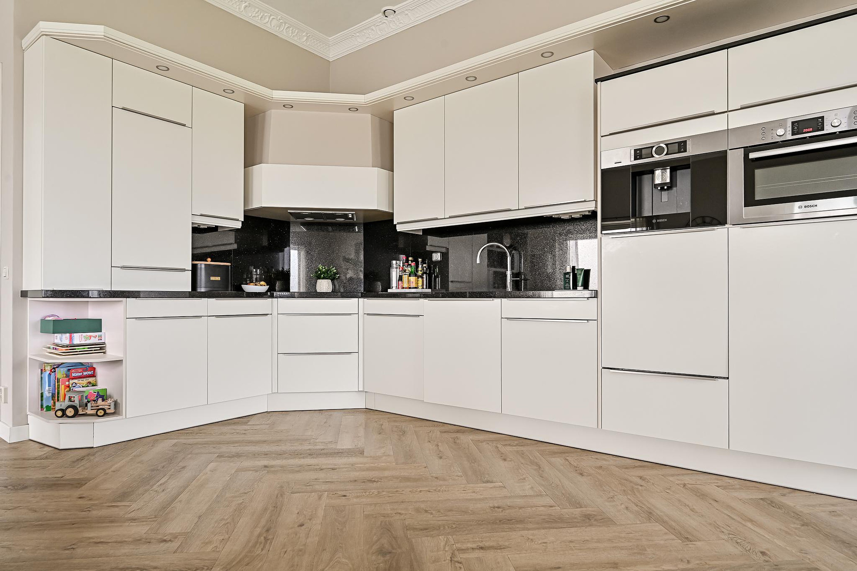 De open keuken is opgesteld in de woonkamer en is in 2023 voorzien van nieuwe frontjes. De keuken biedt veel opbergruimte en is uitgerust met een 4-pits inductiekookplaat, een Quooker, een koelkast, een oven en een koffiemachine.