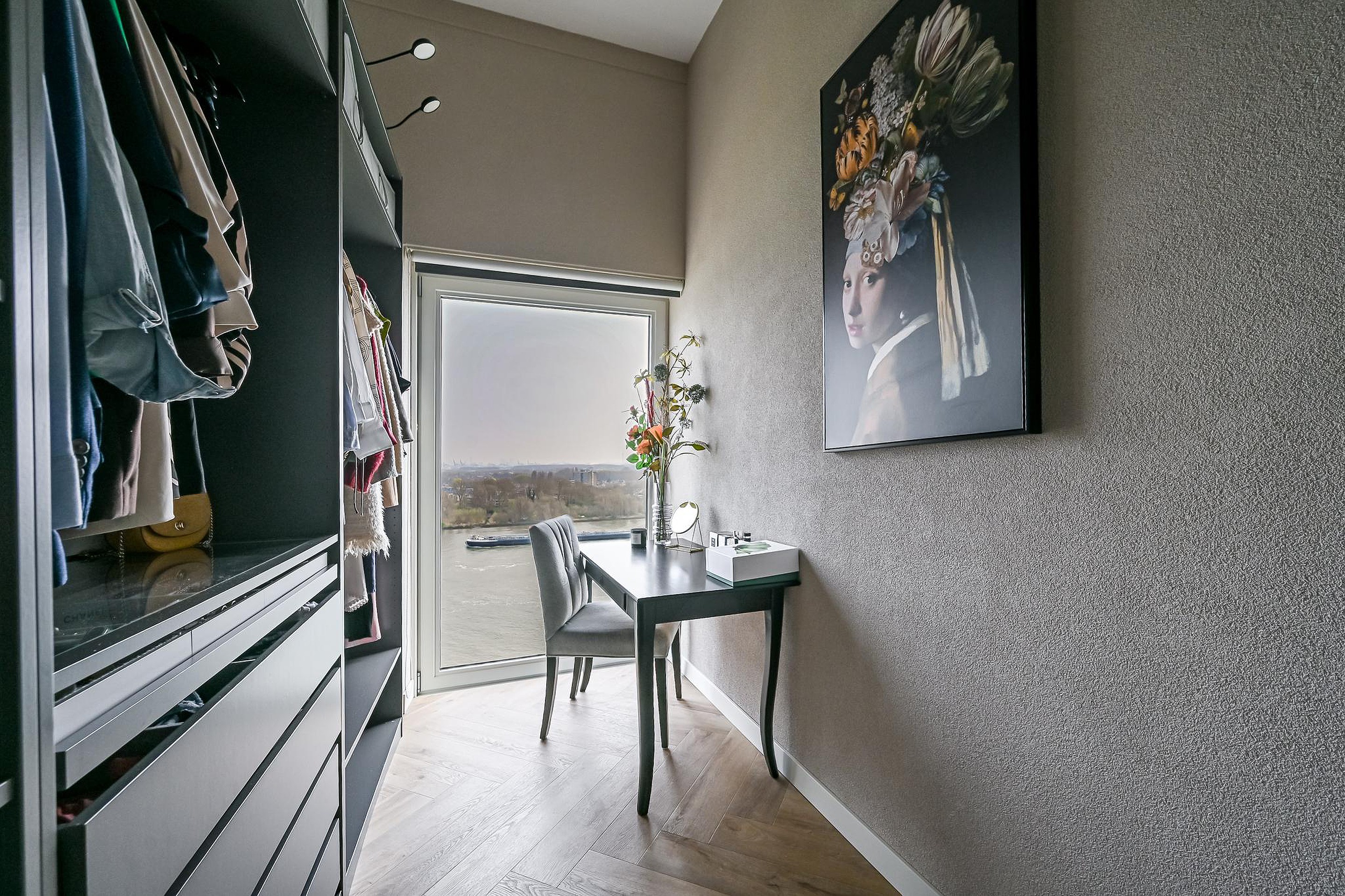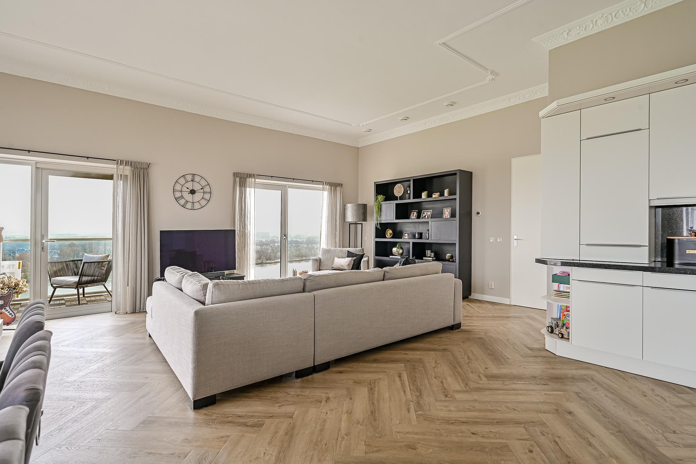Aan het einde van de hal bereik je de woonkamer met een waanzinnig panoramisch uitzicht over de Maas en een deel van Spijkenisse. De raampartijen zorgen hier gedurende de hele dag voor een prettige lichtinval.
