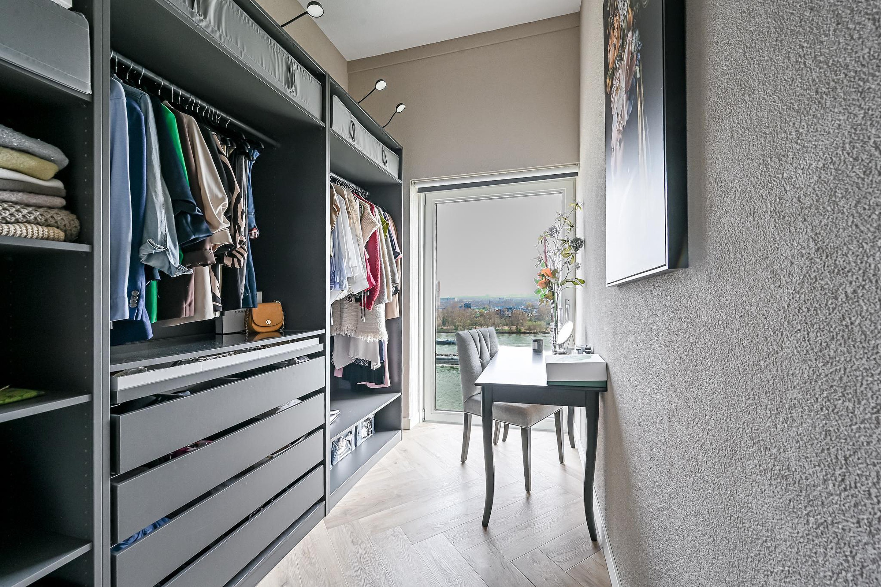 Verderop in de hal bevinden zich drie royale slaapkamers, die allen genieten van een prachtig uitzicht over de Maas en bij helder weer zelfs tot aan de skyline van Rotterdam.