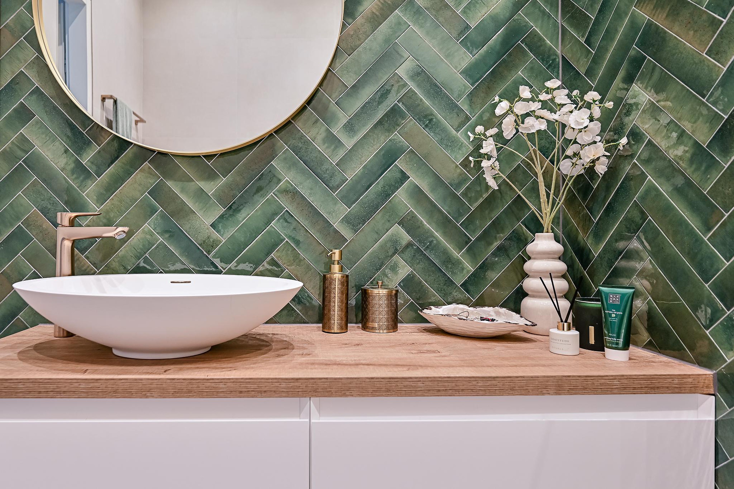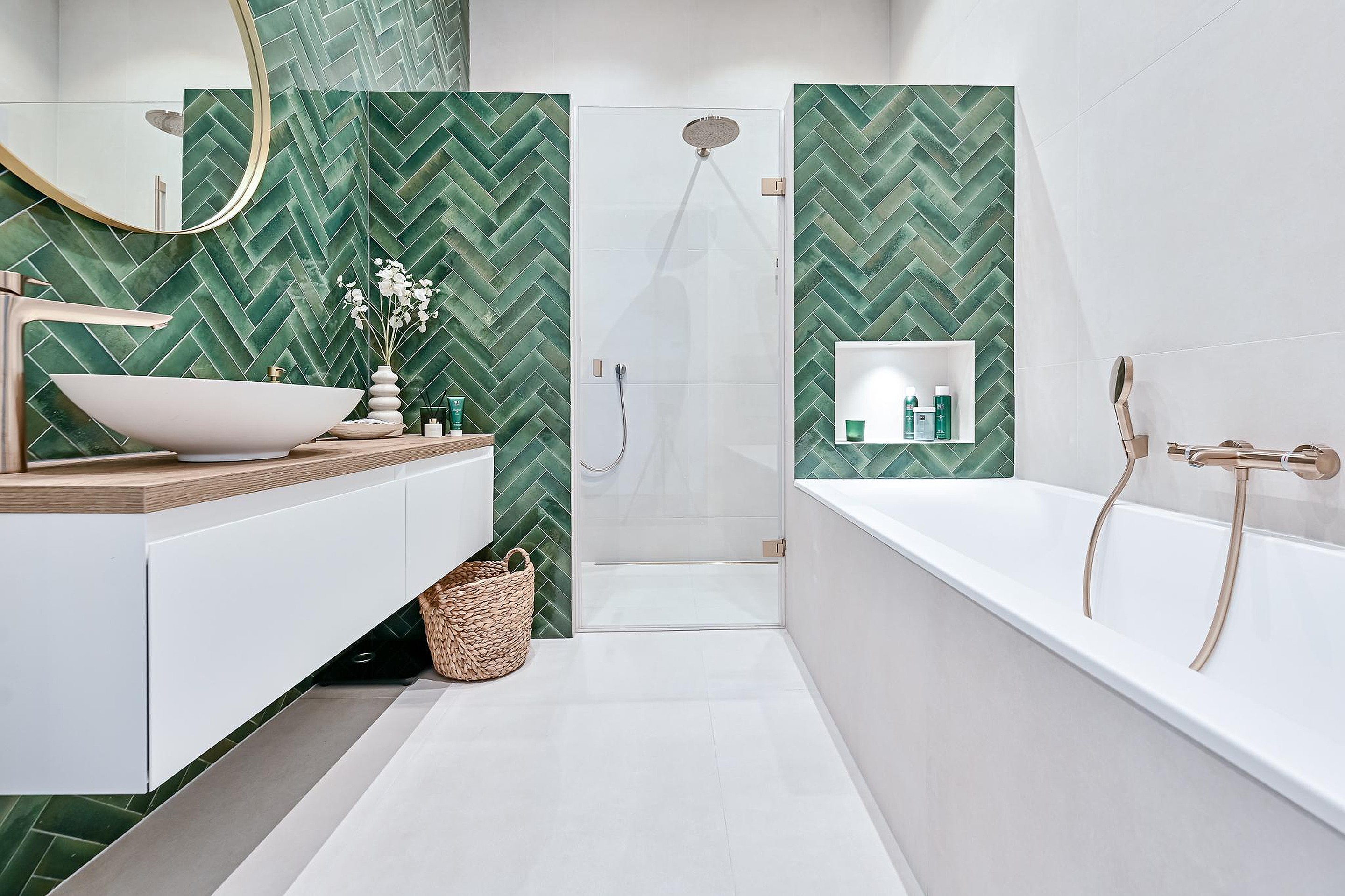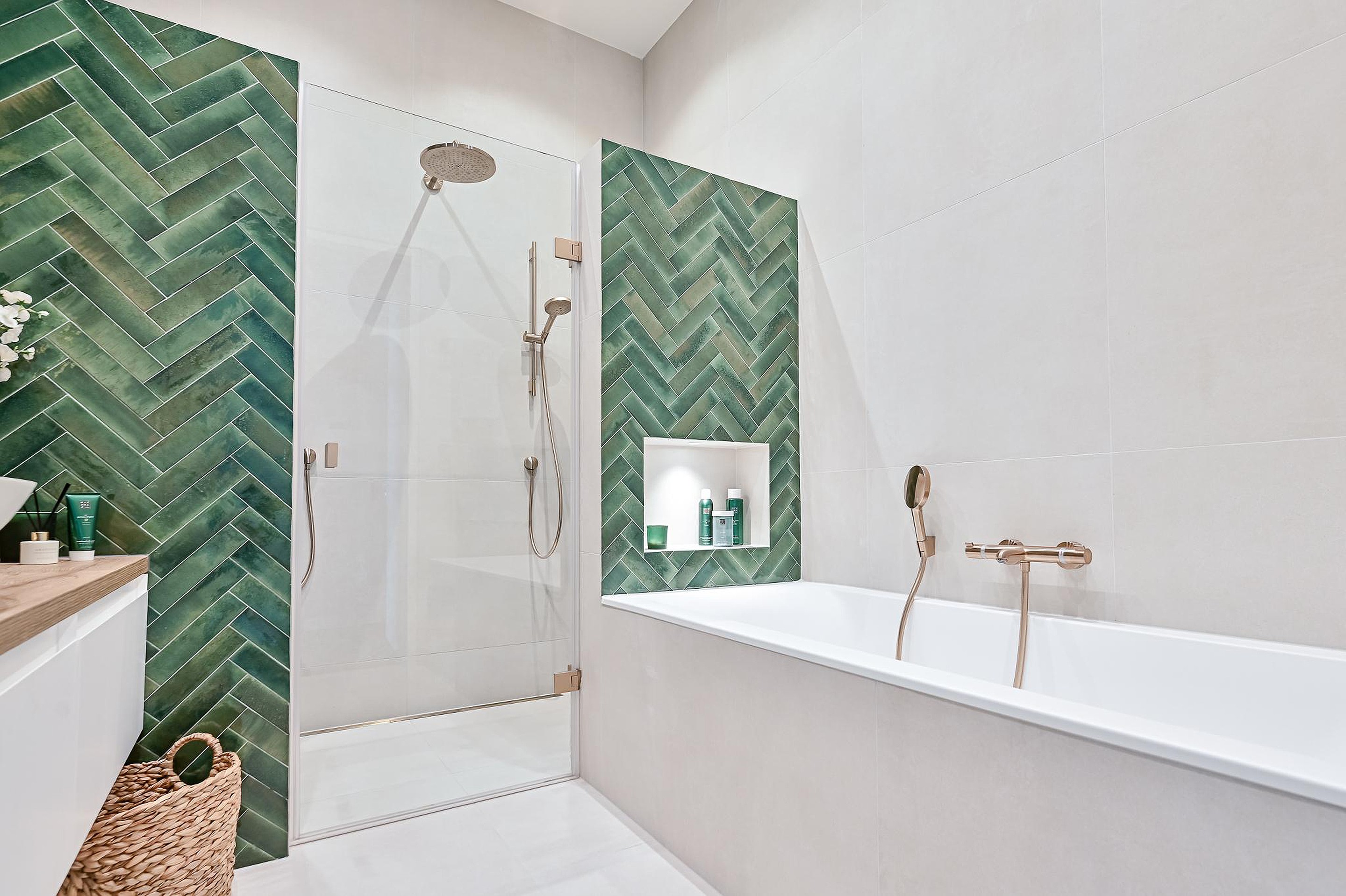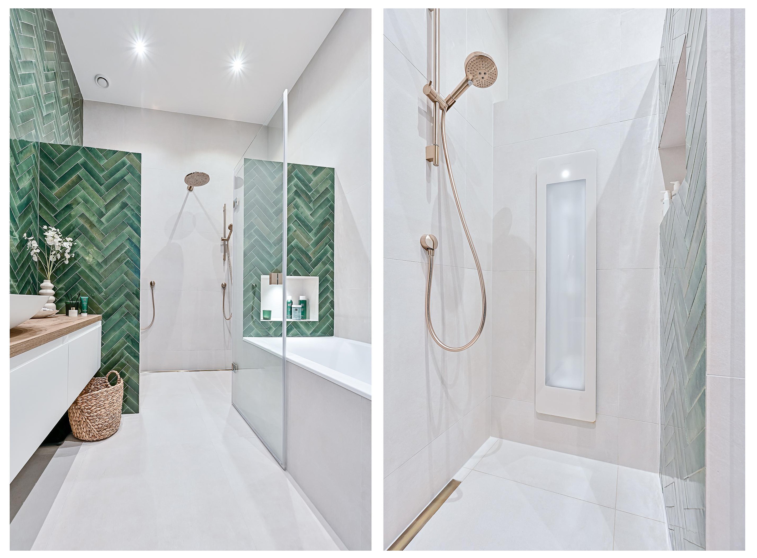 Ook de badkamer is in 2023 volledig vernieuwd in dezelfde stijl als het toilet. De badkamer is volledig betegeld en voorzien van een ruime inloopdouche met infrarood sunshower, een ligbad, een wastafelmeubel met waskom en elektrische vloerverwarming.