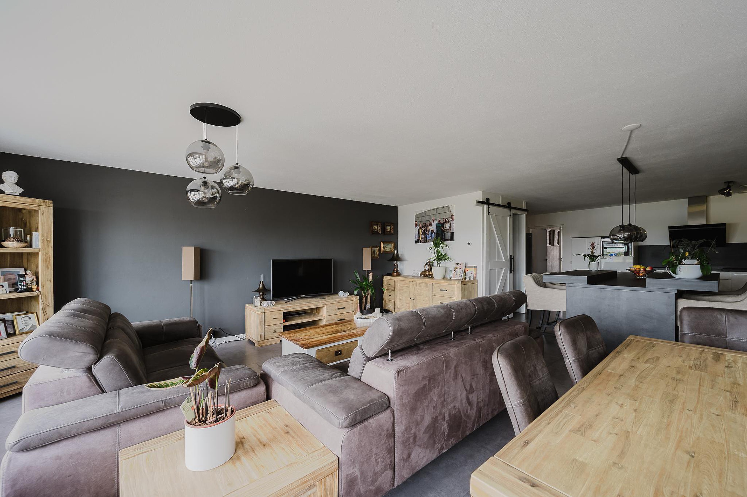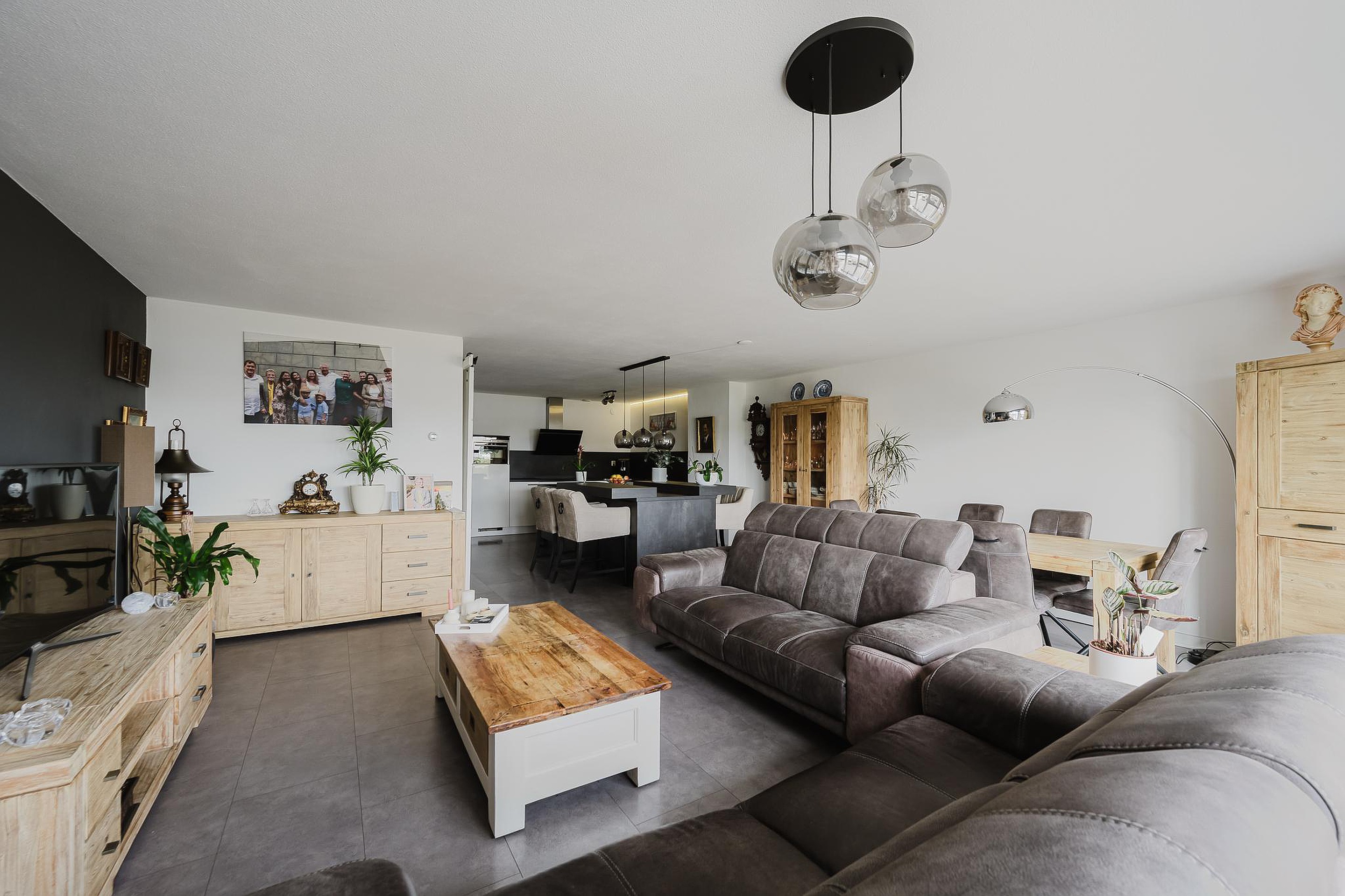 De woonkamer met woonkeuken is strak afgewerkt en is voorzien van een mooie betonlook laminaatvloer (doorgelegd in het hele appartement) en een prachtig uitzicht!