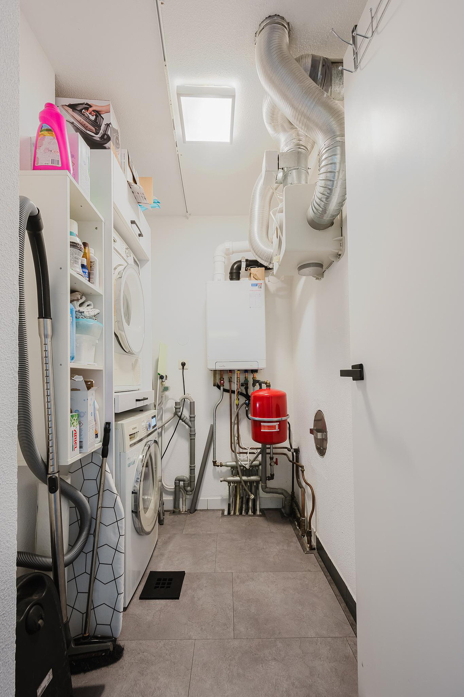 Vanuit de keuken heb je toegang tot de berging met de aansluitingen voor de was- en droogmachine, de Cv-installatie en de mechanische ventilatie.