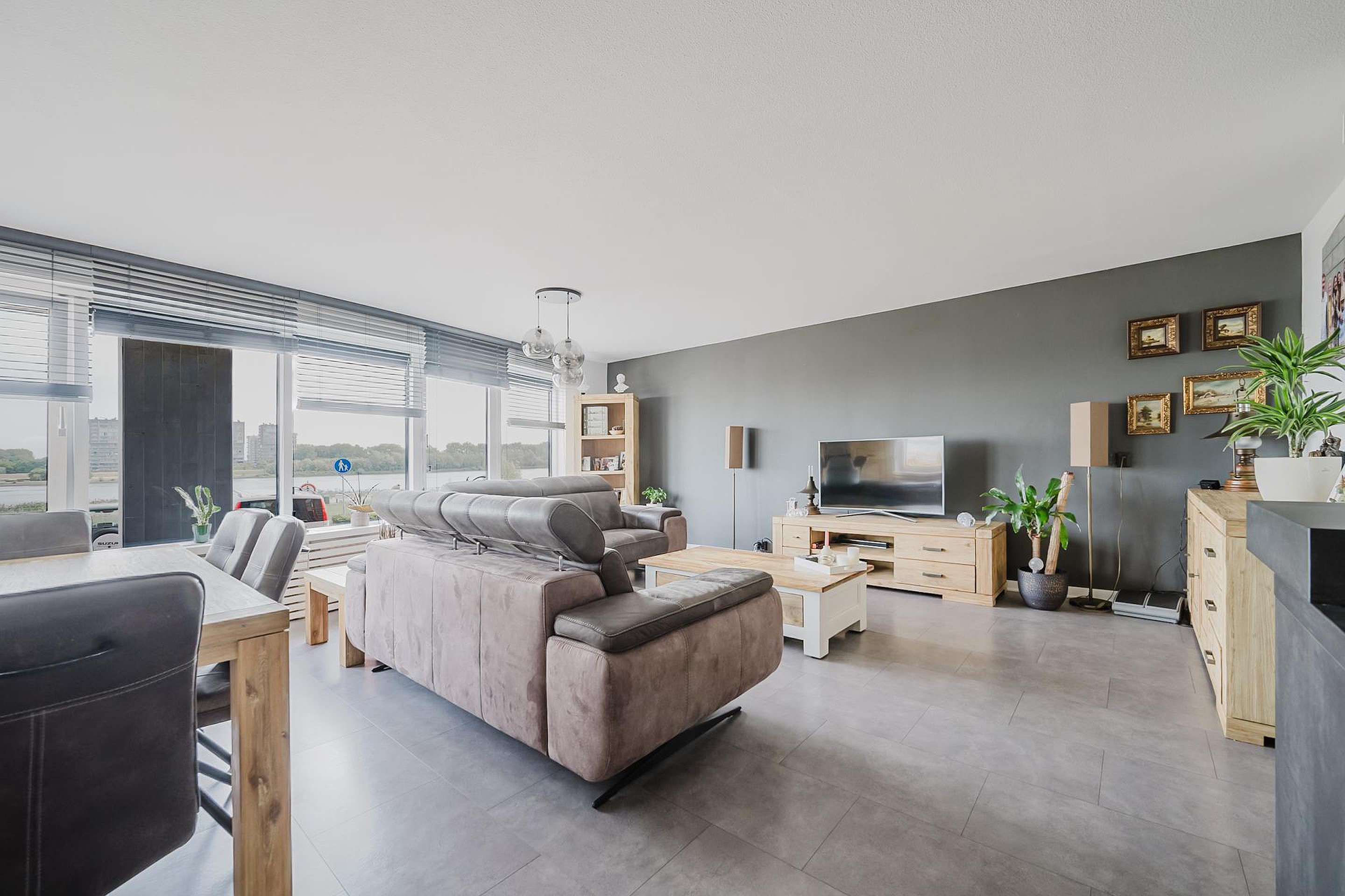 De woonkamer met woonkeuken is strak afgewerkt en is voorzien van een mooie betonlook laminaatvloer (doorgelegd in het hele appartement) en een prachtig uitzicht!