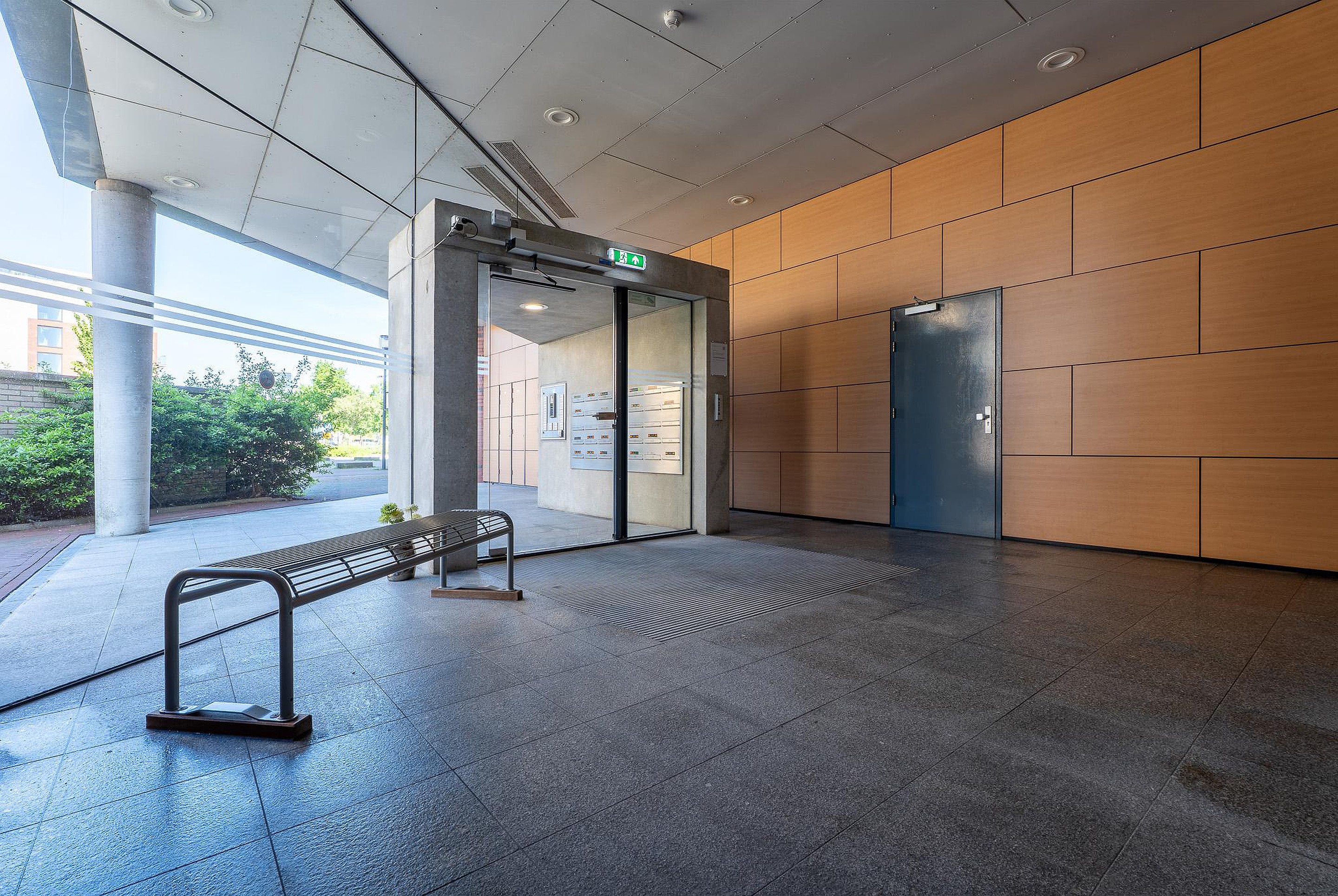 Via de lift of de trap bereik je de fraai aangelegde binnentuin die toegang geeft tot het gebouw waarin dit mooie appartement is gelegen. Een verzorgde overloop brengt je naar de voordeur van de woning. Bij binnenkomst kom je in de ruime hal die toegang geeft tot de meterkast, een keurig toilet, twee slaapkamers, de badkamer en de royale woonkamer met open keuken. De gehele woning is afgewerkt met een stijlvolle PVC-vloer en smaakvol behangen wanden, wat direct zorgt voor een warme en verzorgde sfeer.